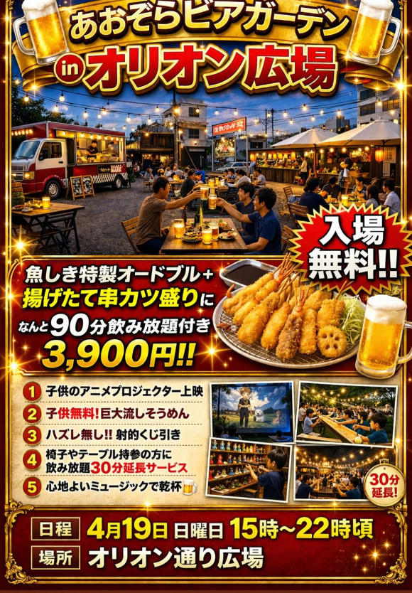 ☆イスやテーブル持参の方に飲み放題30分延長サービス