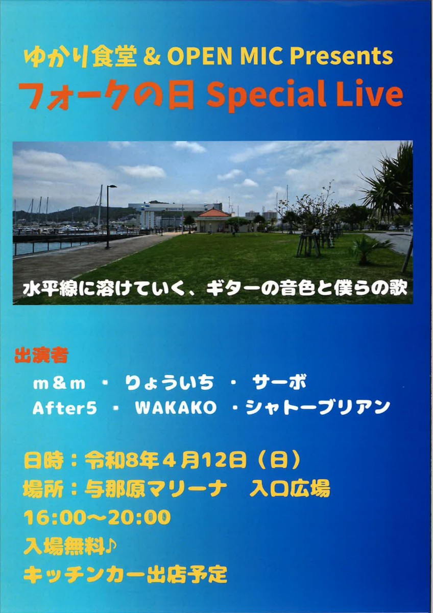 | 主催 | 与那原マリーナ(歓迎式典)、ゆかり食堂&OPEN MIC(アフターイベント) |
