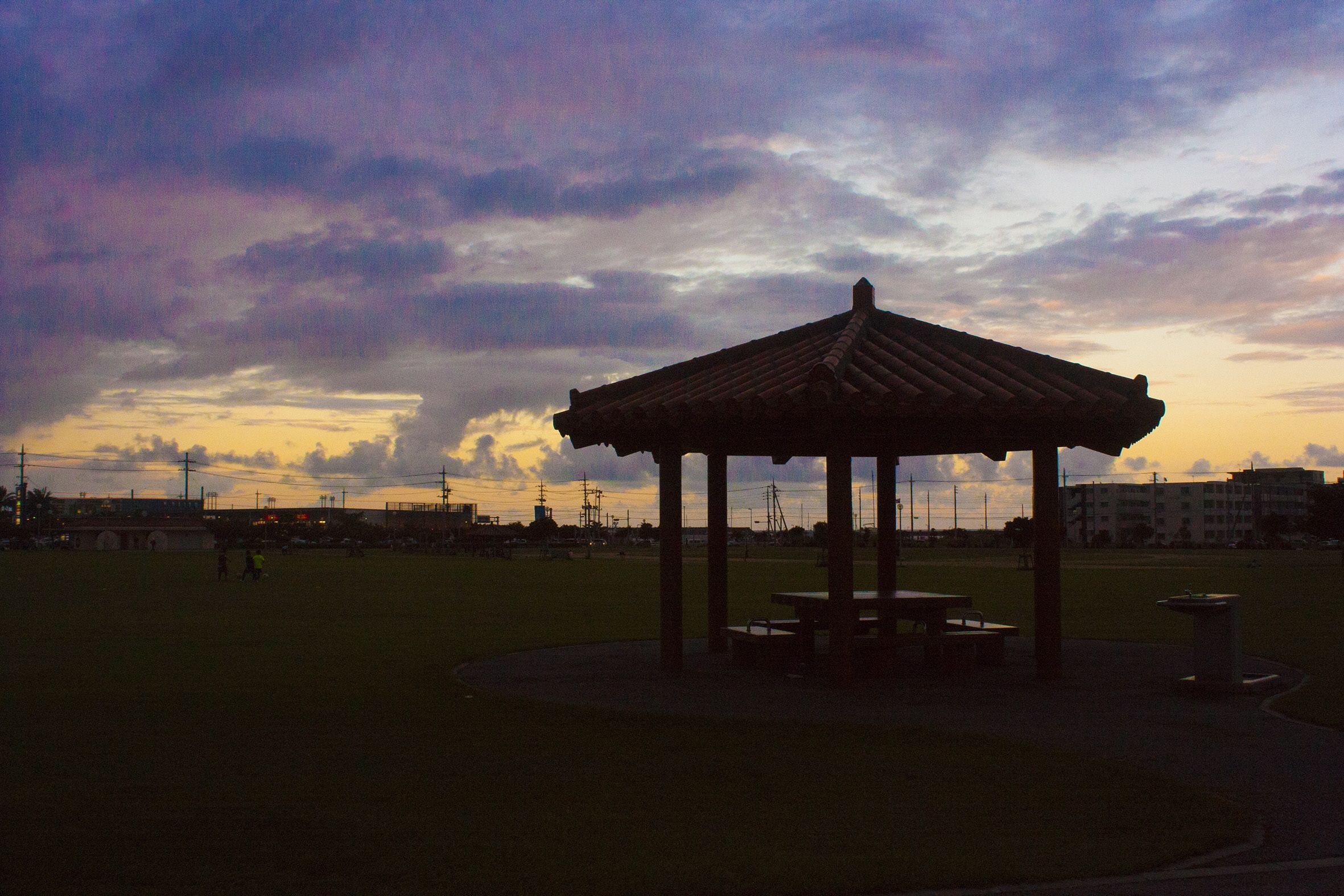 陽が傾いて、空が綺麗な色に染まったときの与那古浜公園を撮影しました。