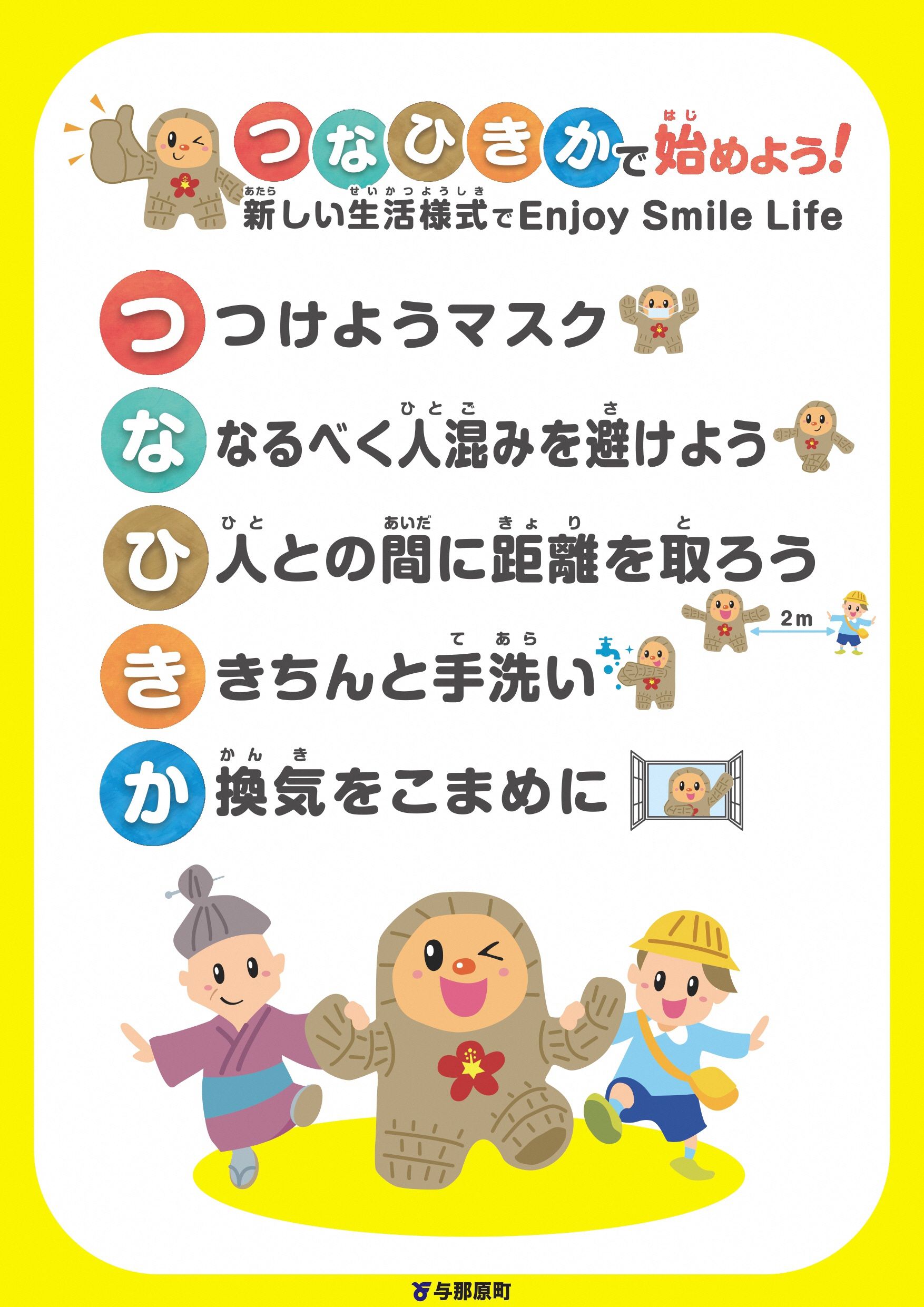 与那原町の公式イメージキャラクター「つなひきかちゃん」の新しい生活様式啓発ポスターです。