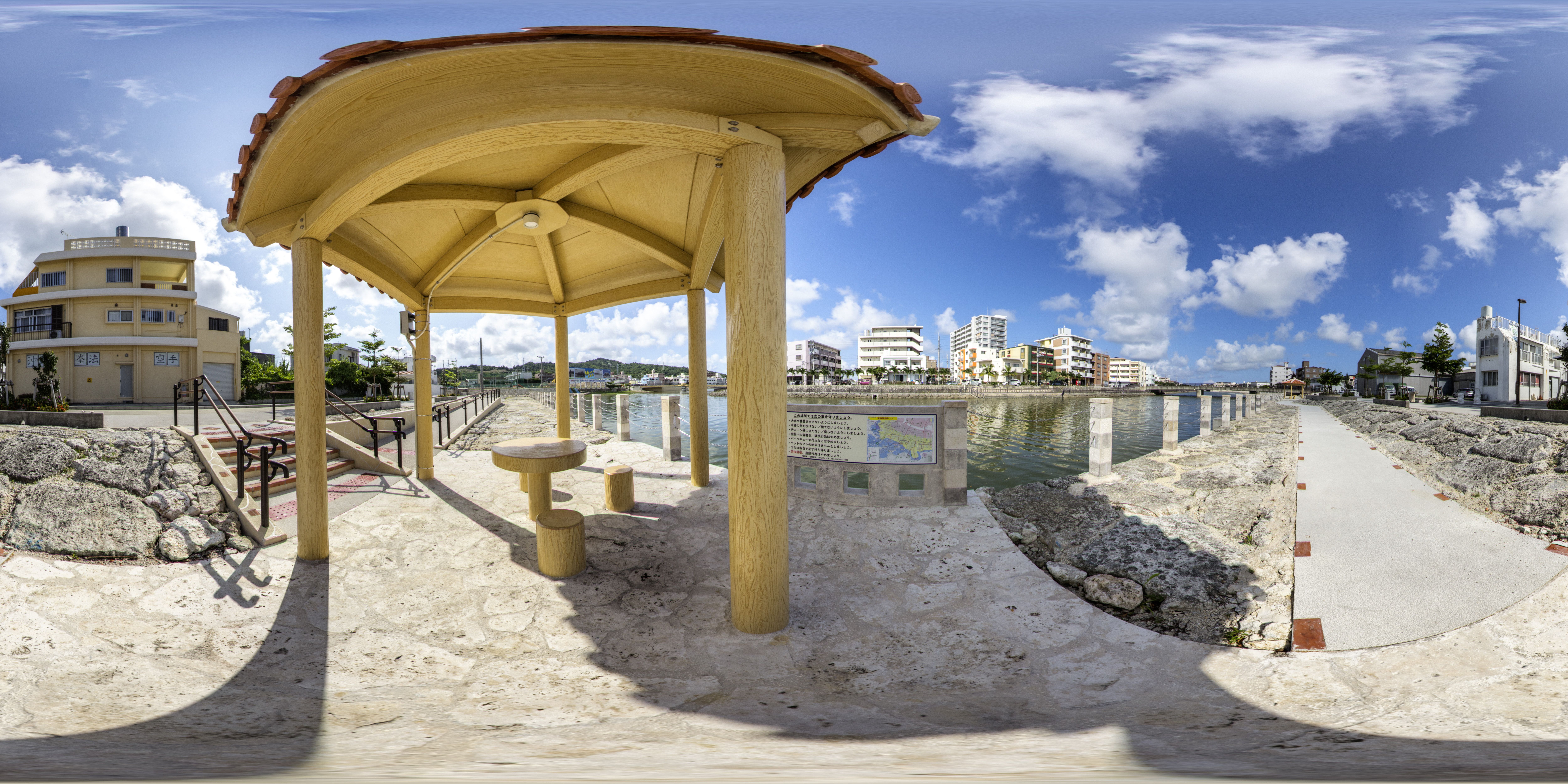 与那原町には東浜地区を取り囲む大きな水路があります。水路脇の遊歩道は散歩に適しており、東屋で休憩することもできます。釣りなども楽しまれ、地域の憩いの場所となっています。(equirectangular形式の360度パノラマ画像を提供しています。)