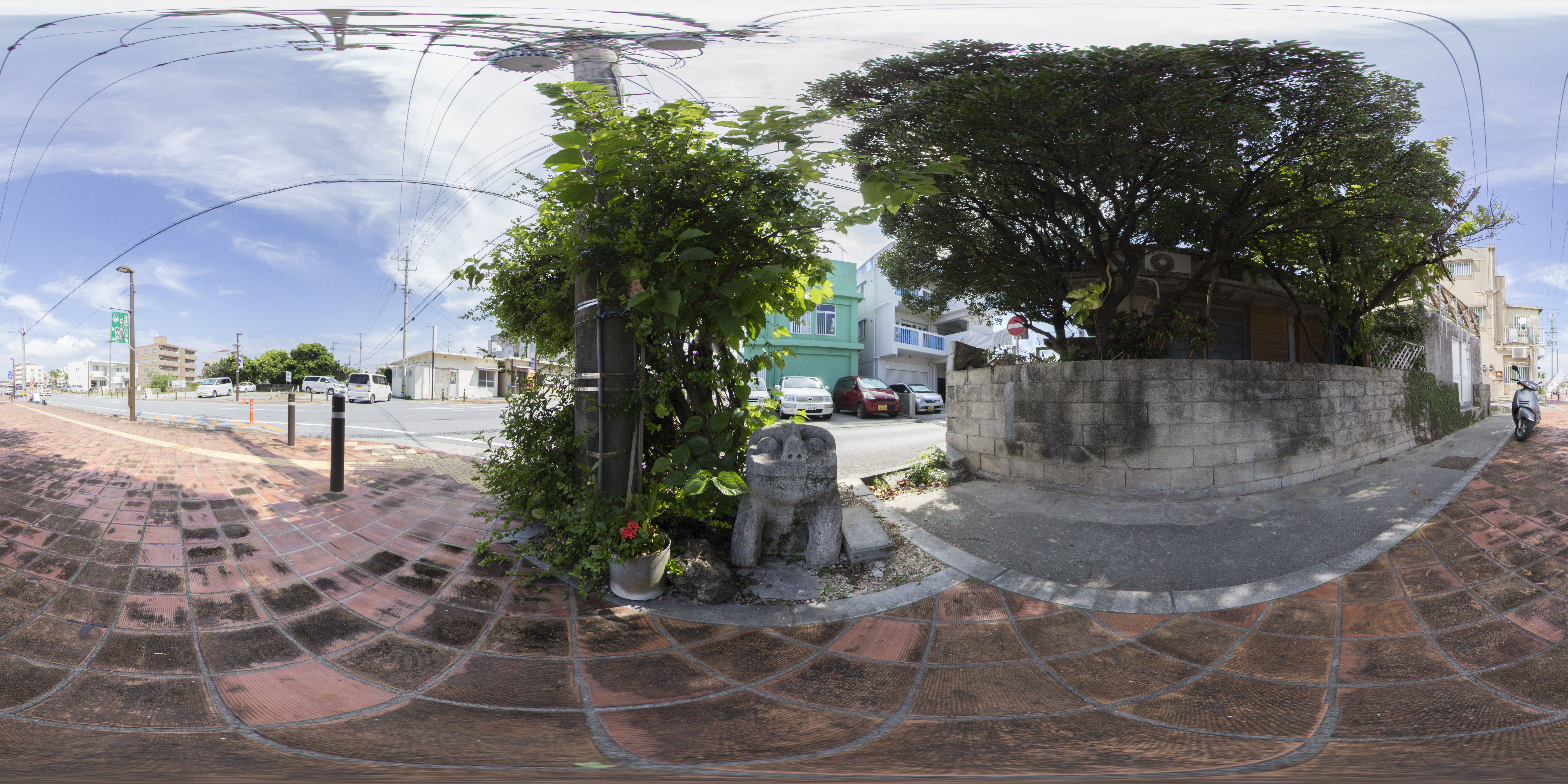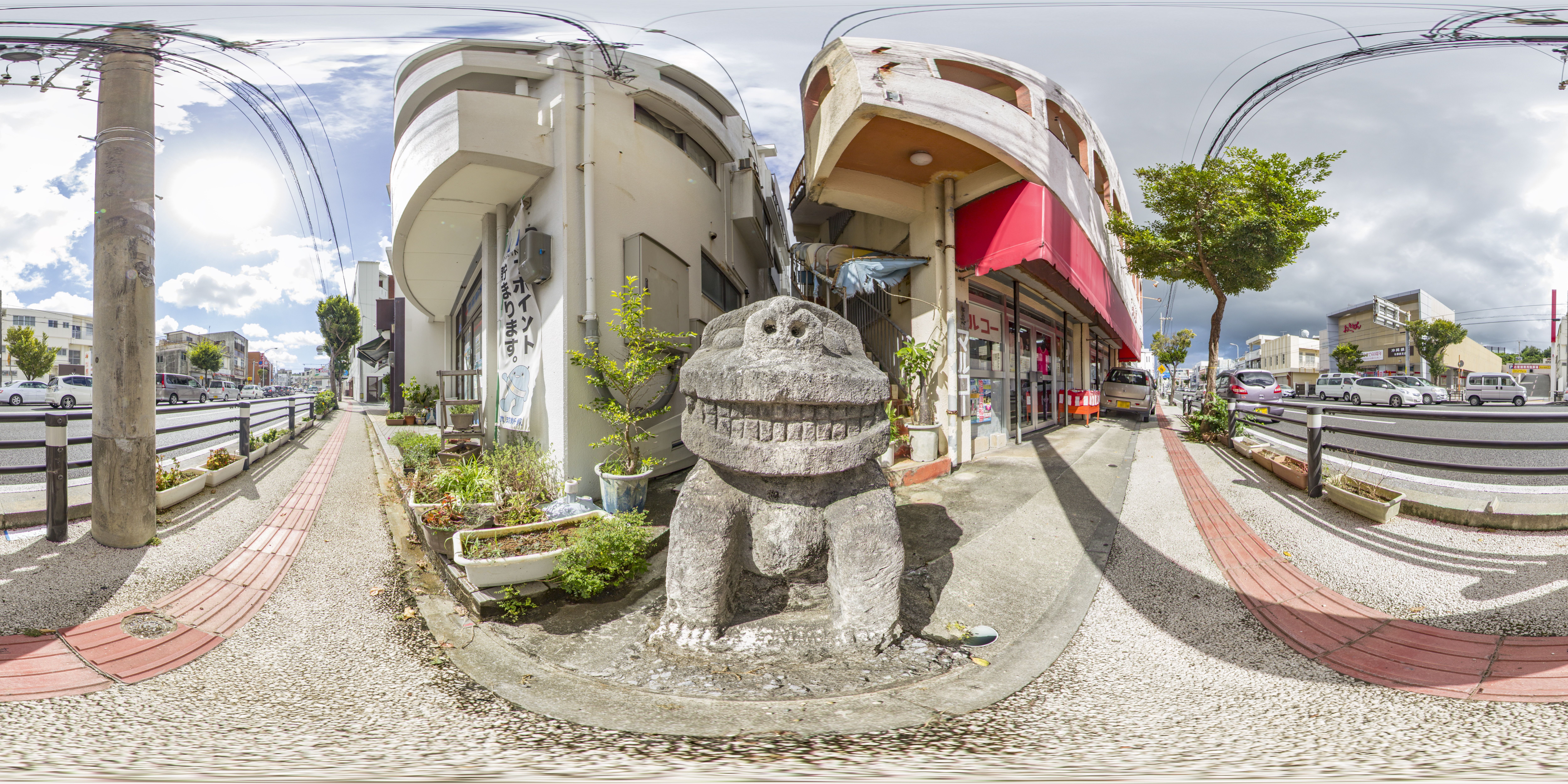 集落内に設置された石獅子は村落獅子とも呼ばれ、沖縄県内の地域でいくつか見られます。石獅子はフーチゲーシ(邪鬼返し)やヒーゲーシ(火返し)などの厄除けとして置かれていると考えられています。与那原町内には7体あり地域を見守っています。(equirectangular形式の360度パノラマ画像を提供しています。)