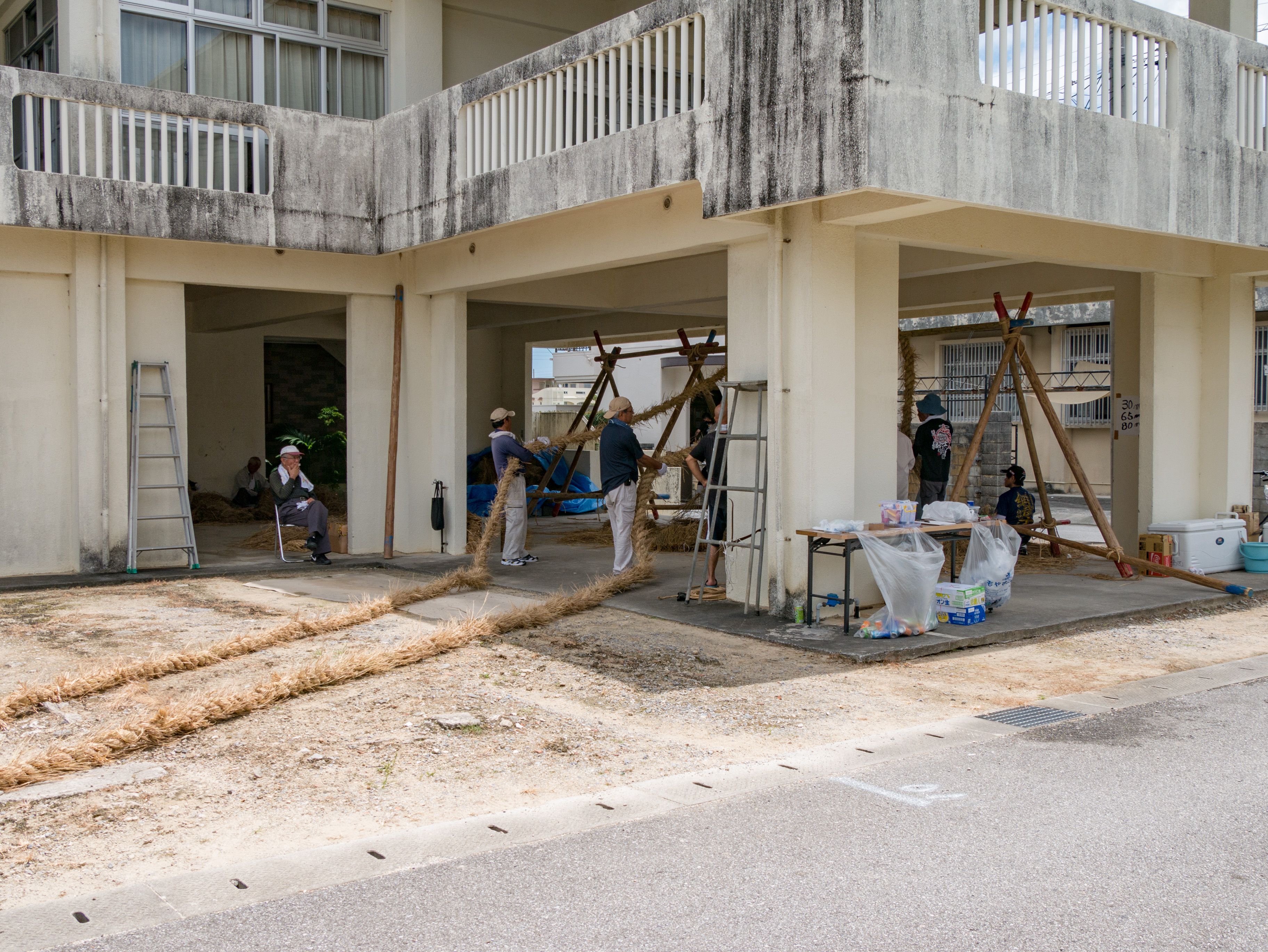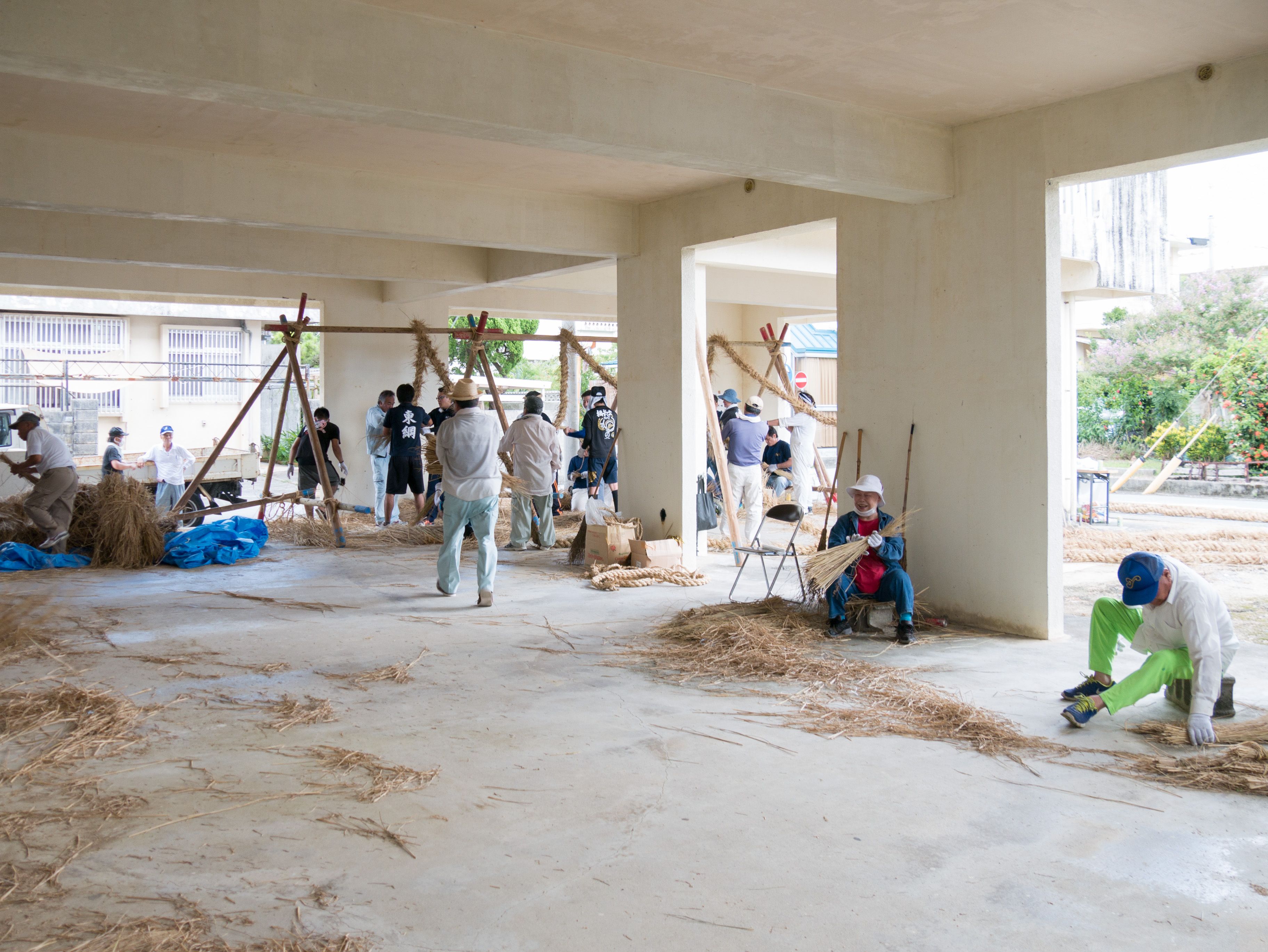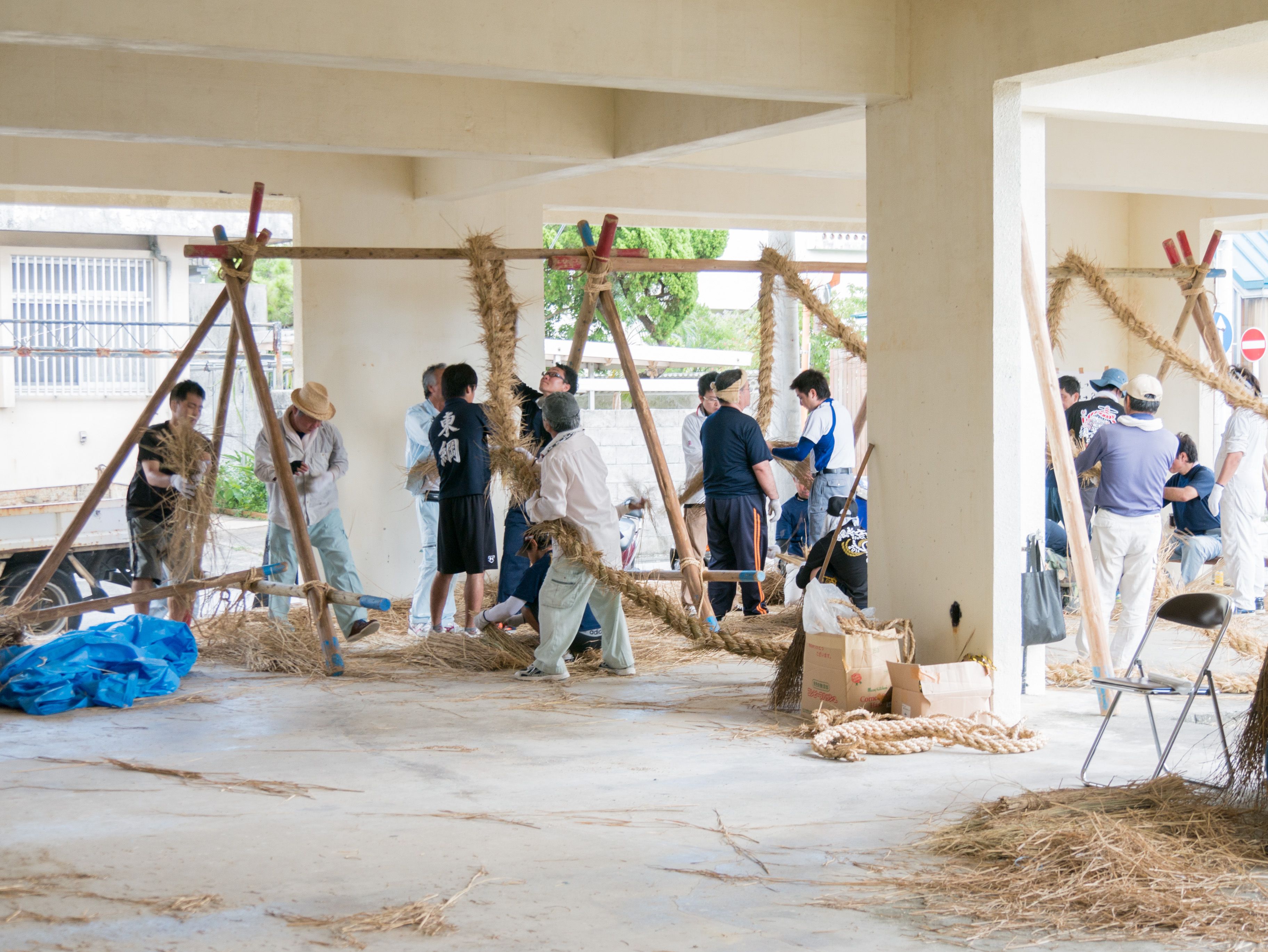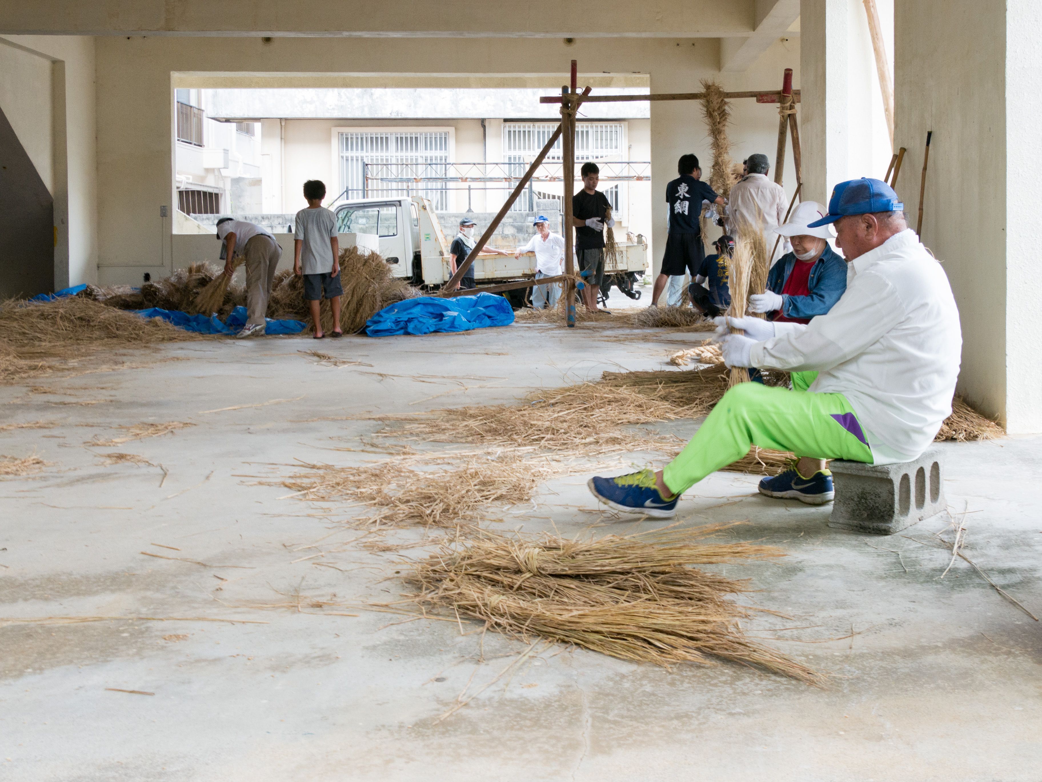 与那原大綱曳で使われる本綱は長さ約90メートル、重量5トンで雄綱(東)と雌綱(西)に分かれており、毎年新しく作られます。本綱の元になる綱は町内12区の分担で作られており、藁の束から細い綱を作り何本もより合わせ太い綱にしていきます。各区が作った綱は大綱曳の前日に本綱として編まれ完成します。各区の割り当て(100m×2本、90m×2本、80m×2本、70m×2本、枝綱35m×4本)