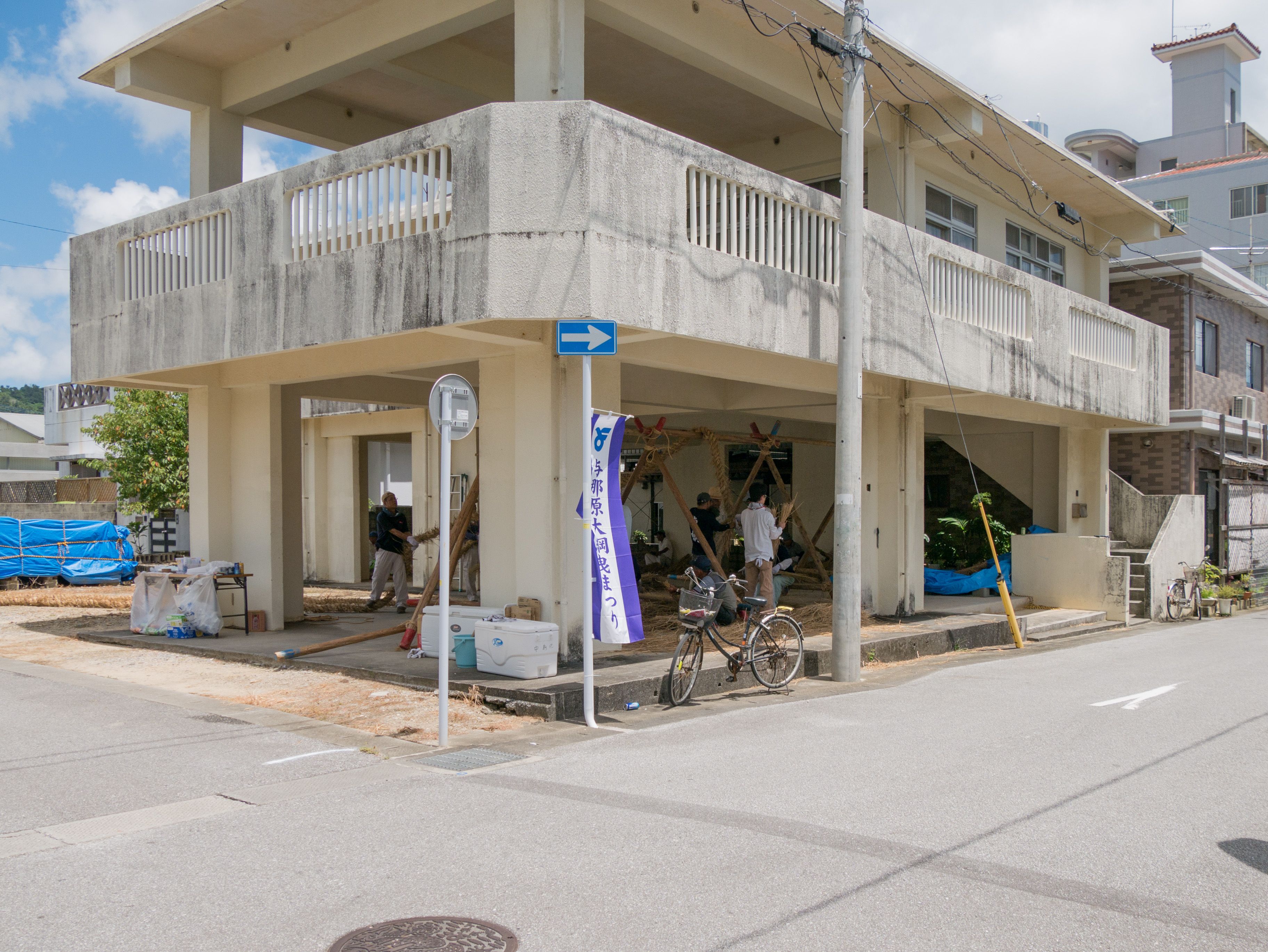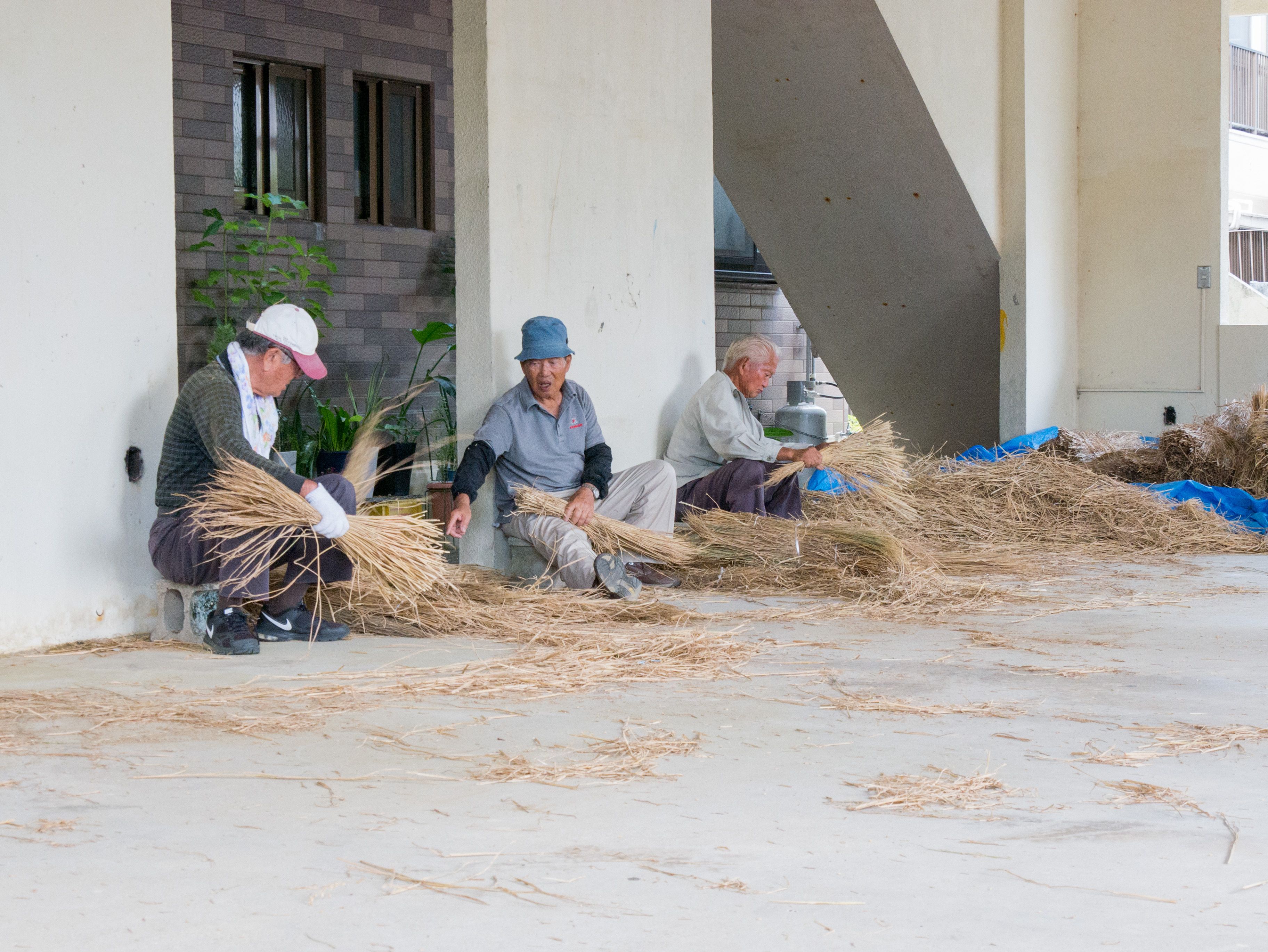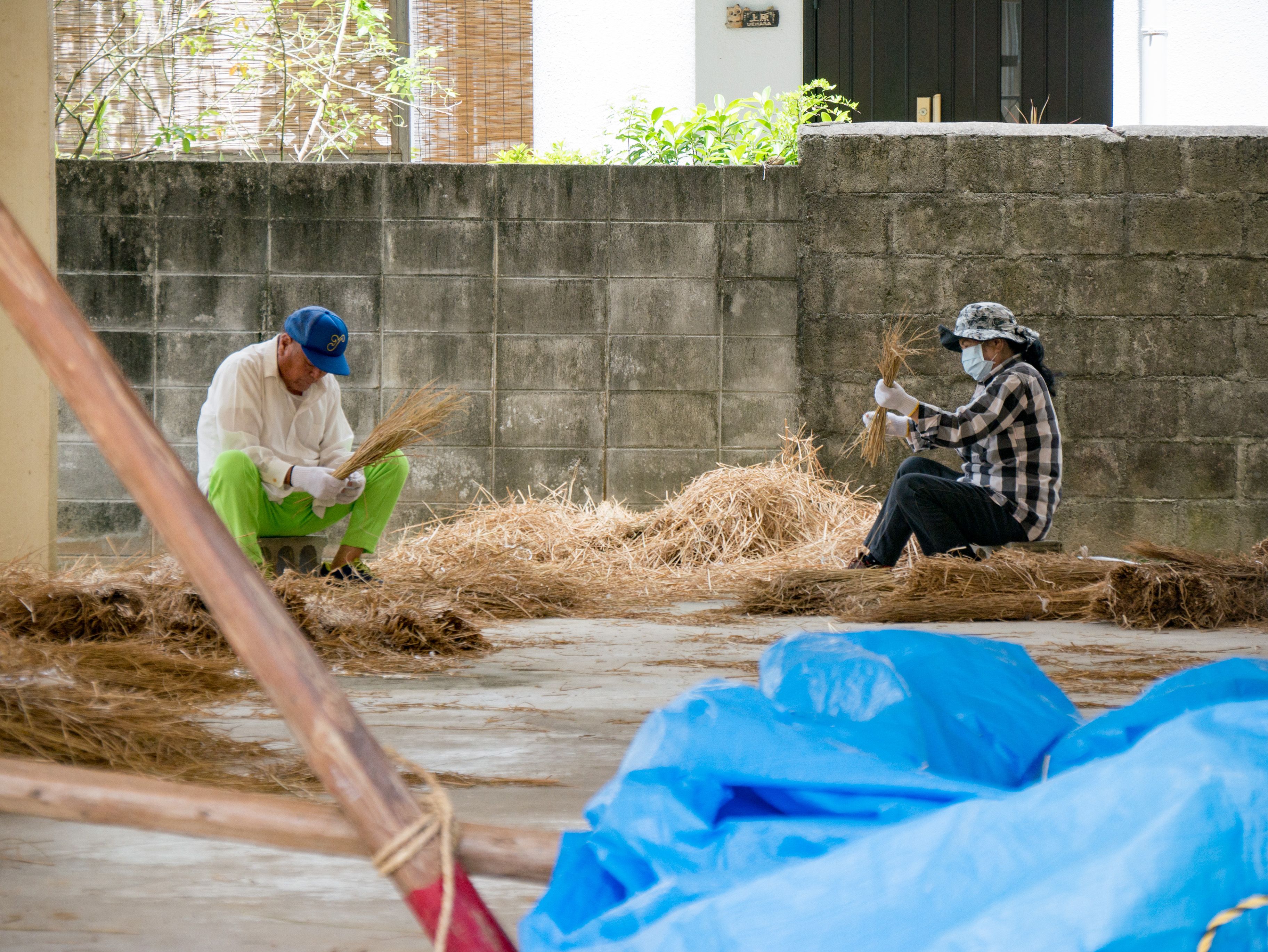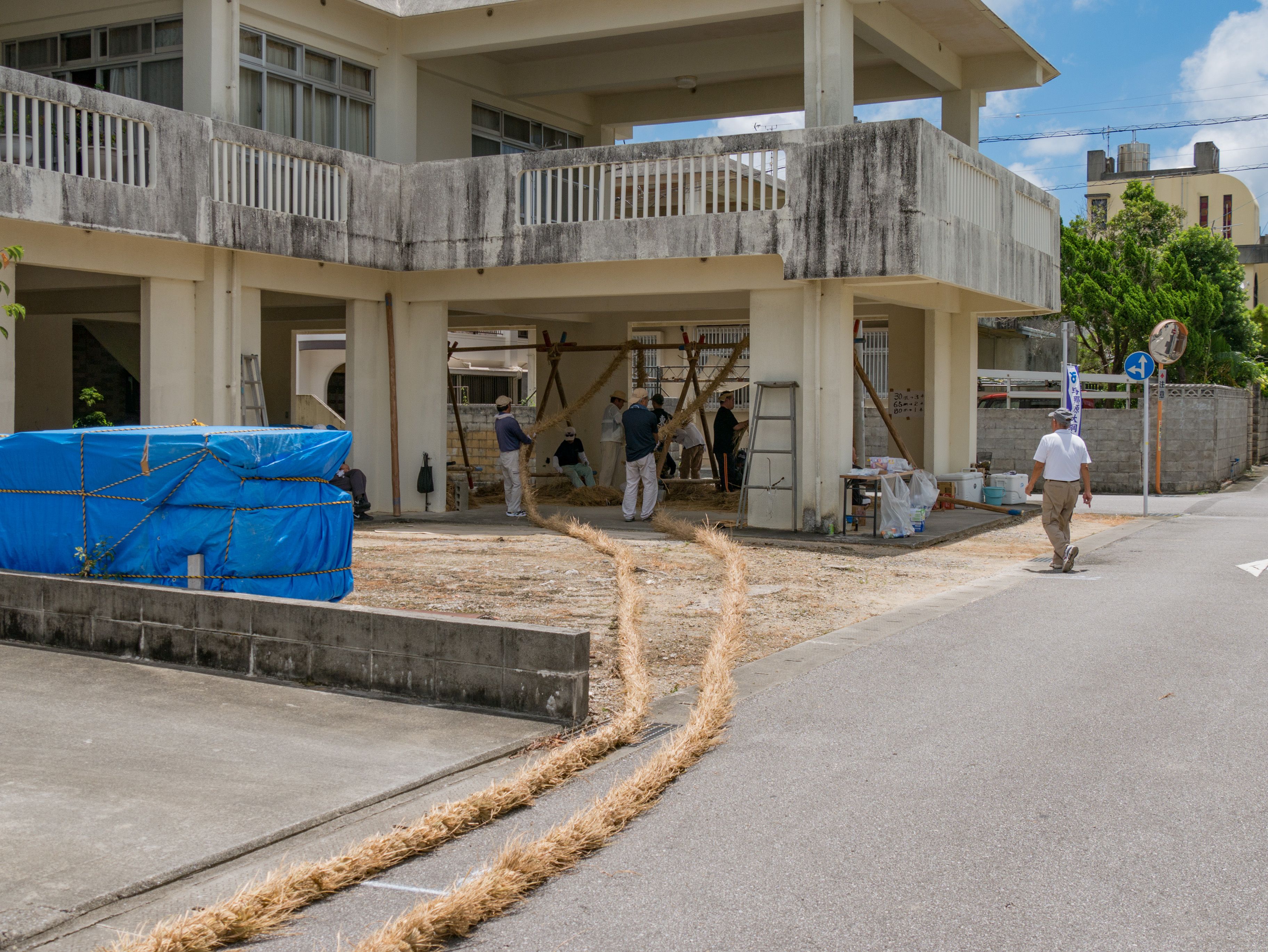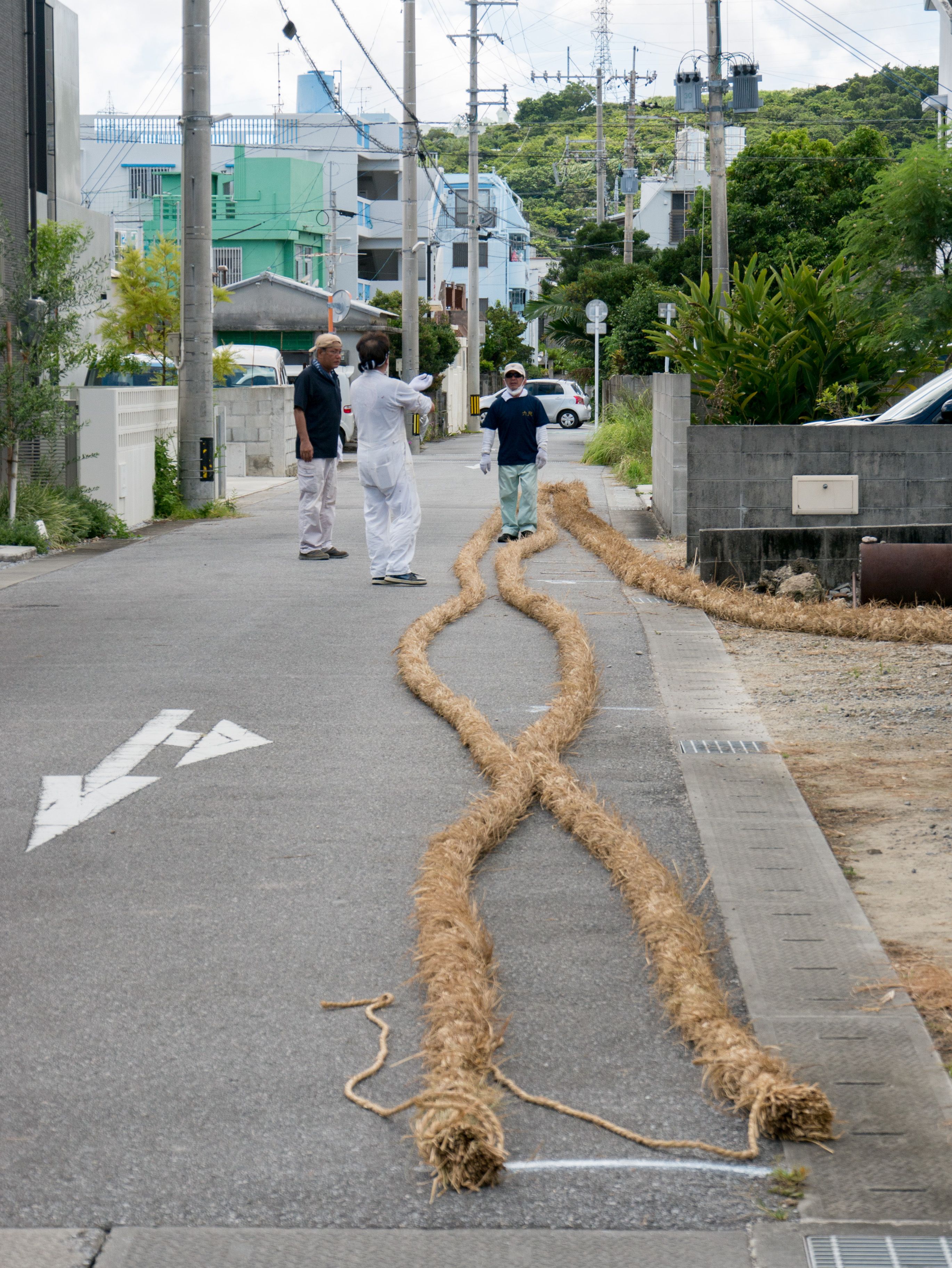 与那原大綱曳で使われる本綱は長さ約90メートル、重量5トンで雄綱(東)と雌綱(西)に分かれており、毎年新しく作られます。本綱の元になる綱は町内12区の分担で作られており、藁の束から細い綱を作り何本もより合わせ太い綱にしていきます。各区が作った綱は大綱曳の前日に本綱として編まれ完成します。各区の割り当て(100m×2本、90m×2本、80m×2本、70m×2本、枝綱35m×4本)