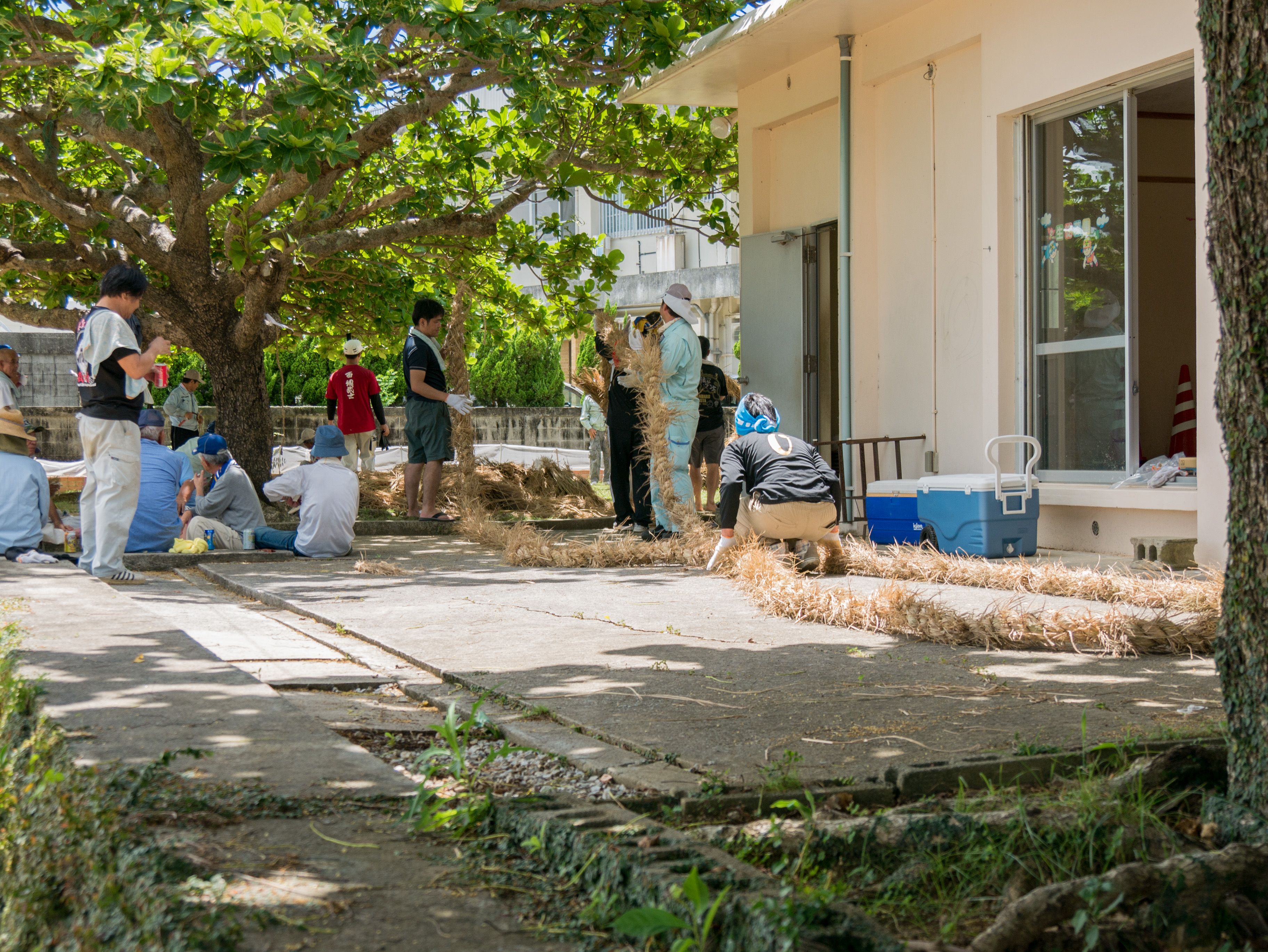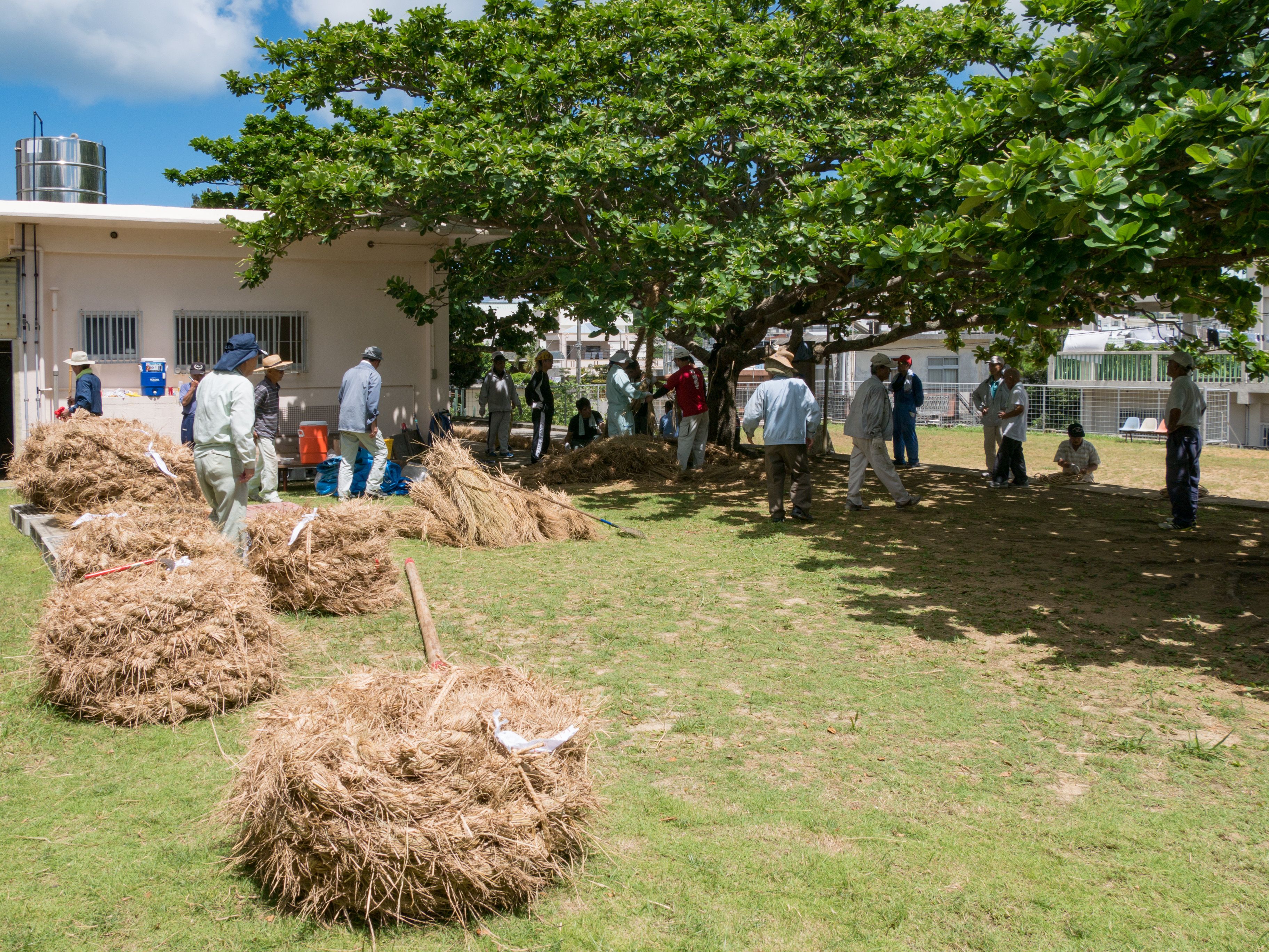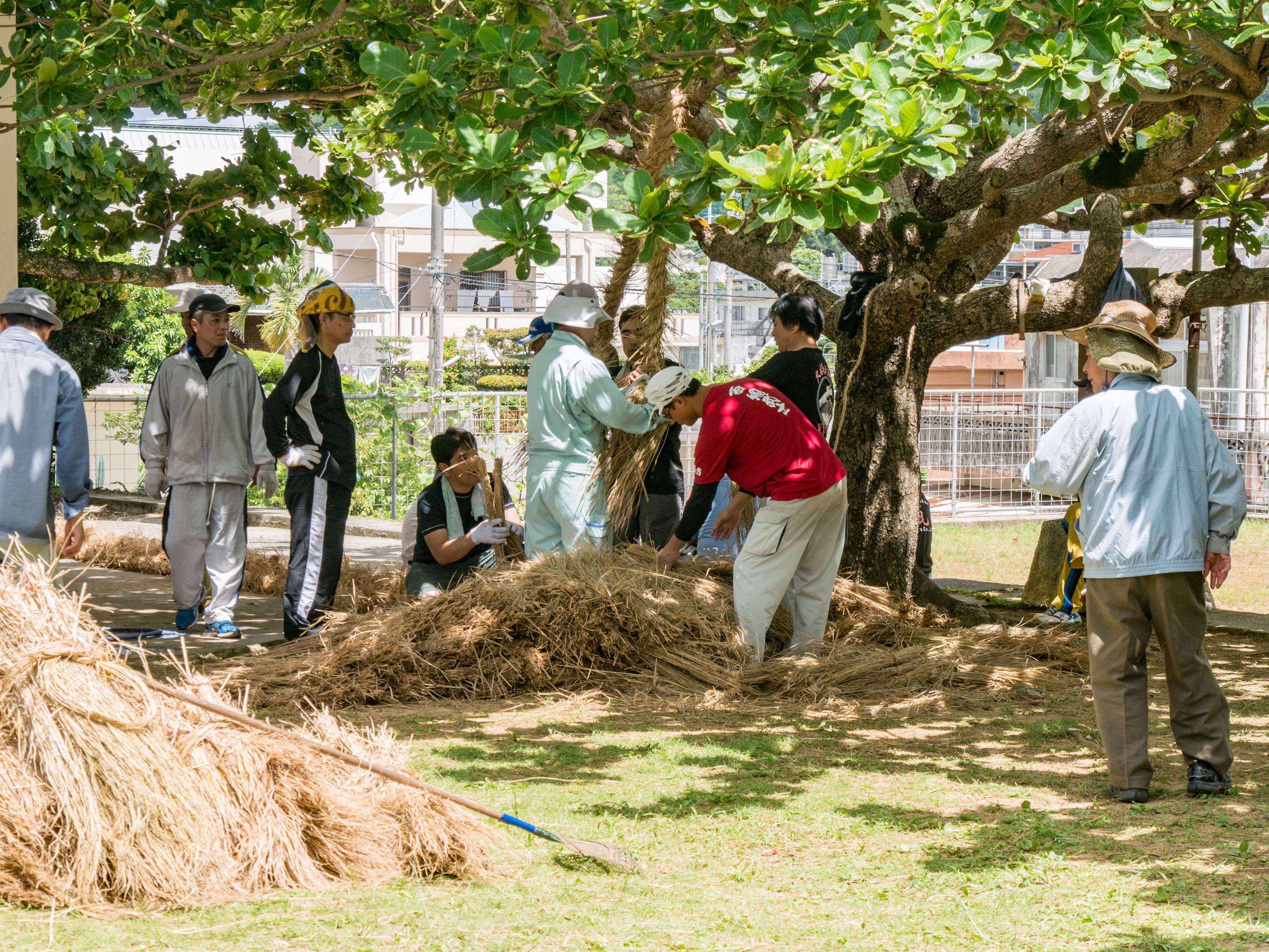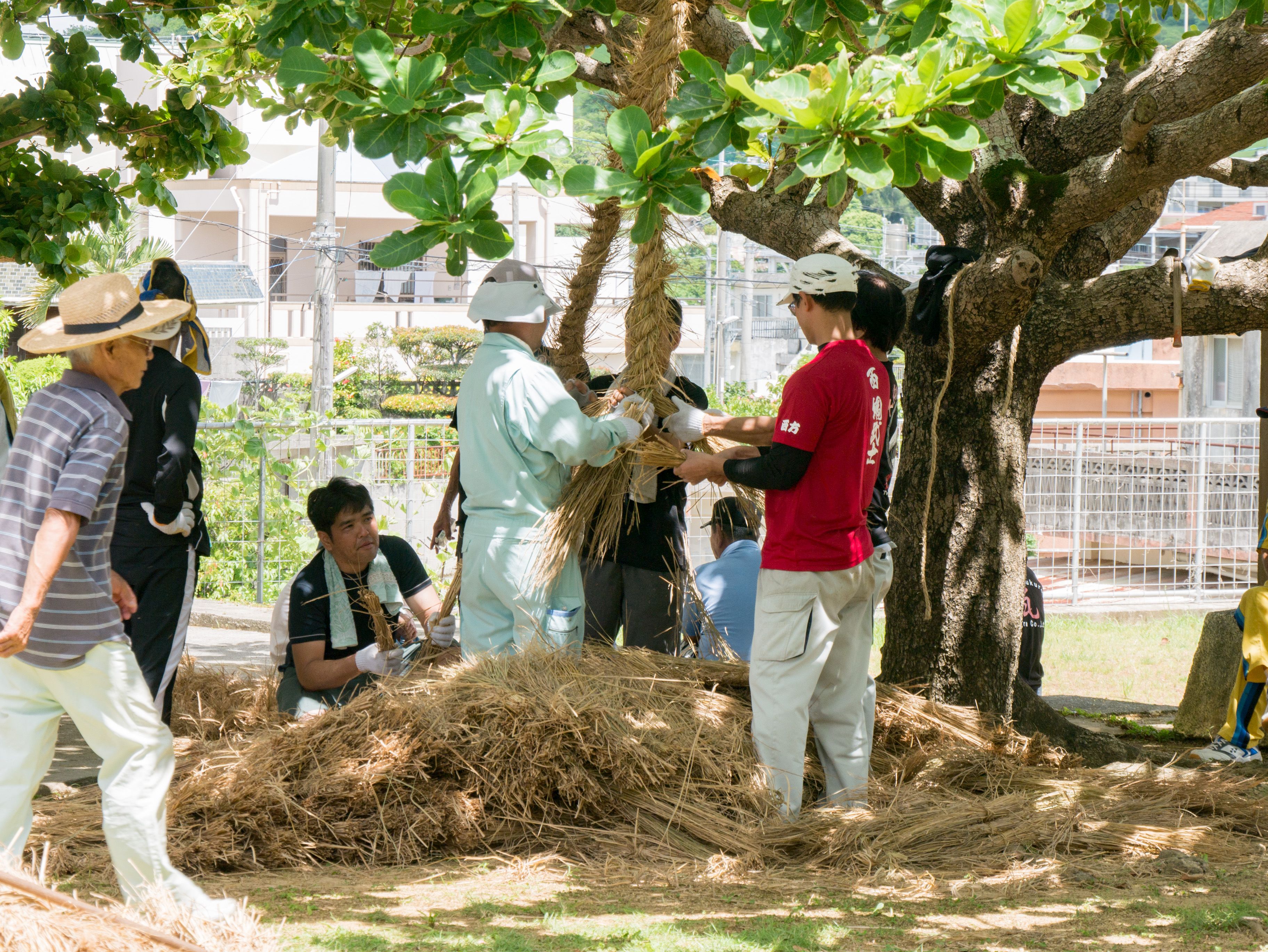 与那原大綱曳で使われる本綱は長さ約90メートル、重量5トンで雄綱(東)と雌綱(西)に分かれており、毎年新しく作られます。本綱の元になる綱は町内12区の分担で作られており、藁の束から細い綱を作り何本もより合わせ太い綱にしていきます。各区が作った綱は大綱曳の前日に本綱として編まれ完成します。各区の割り当て(100m×2本、90m×2本、80m×2本、70m×2本、枝綱35m×4本)