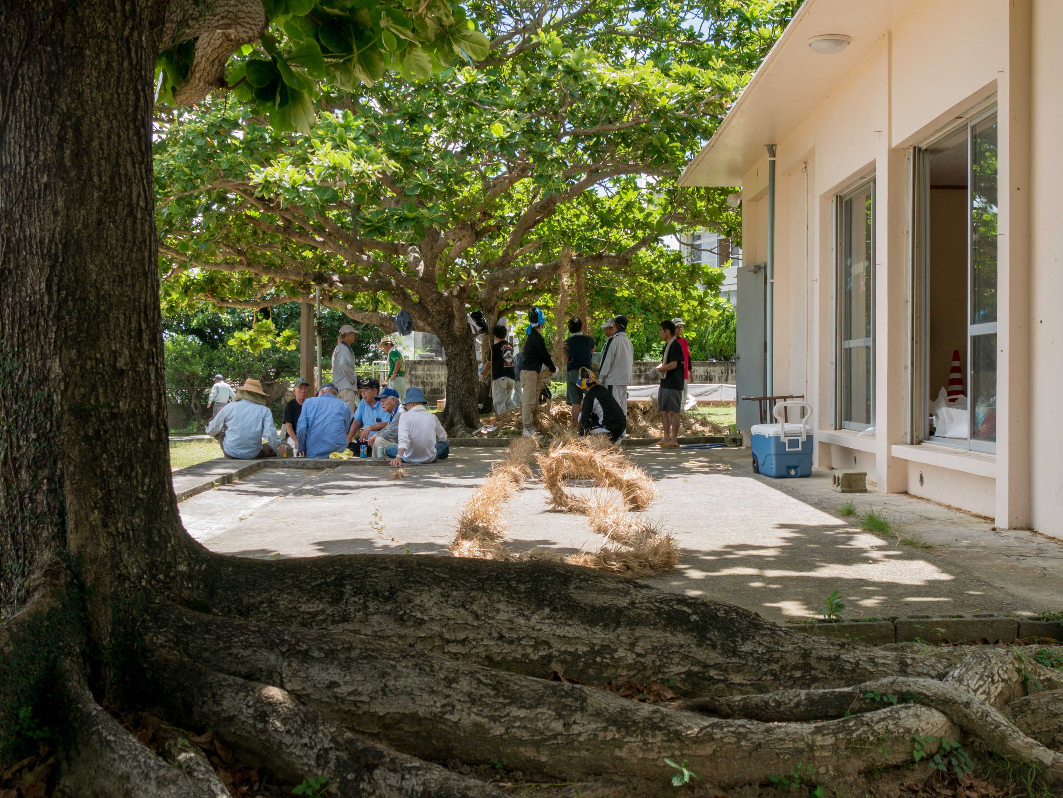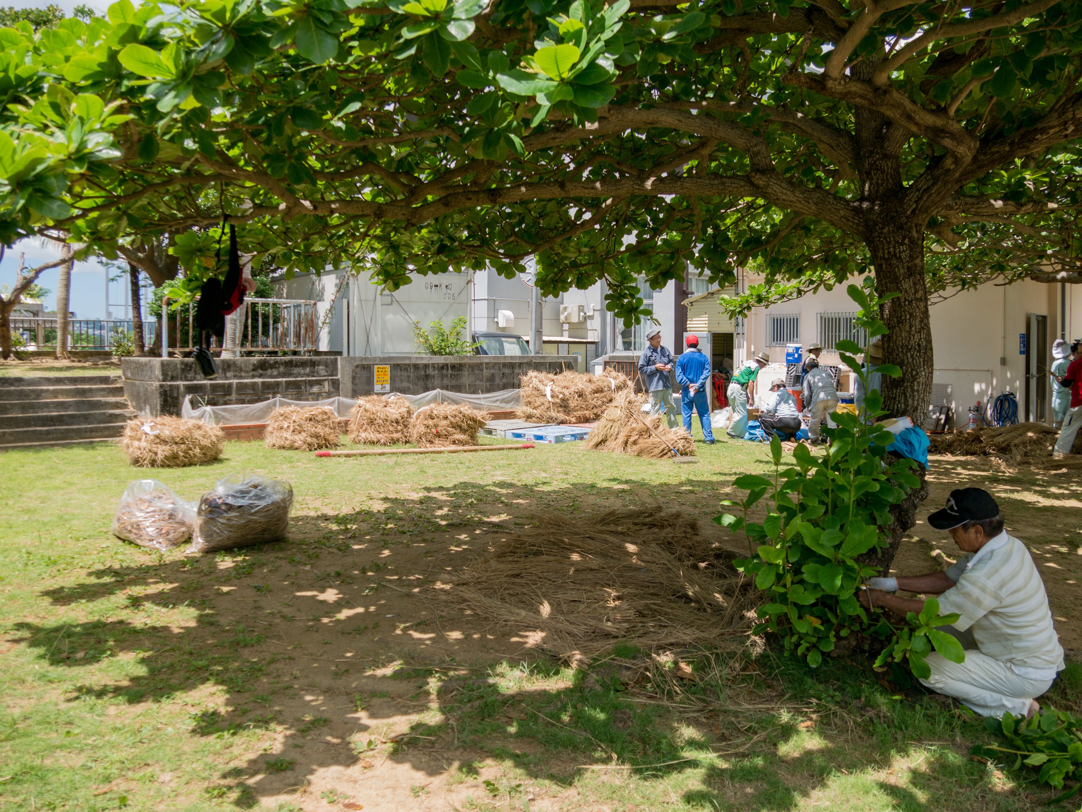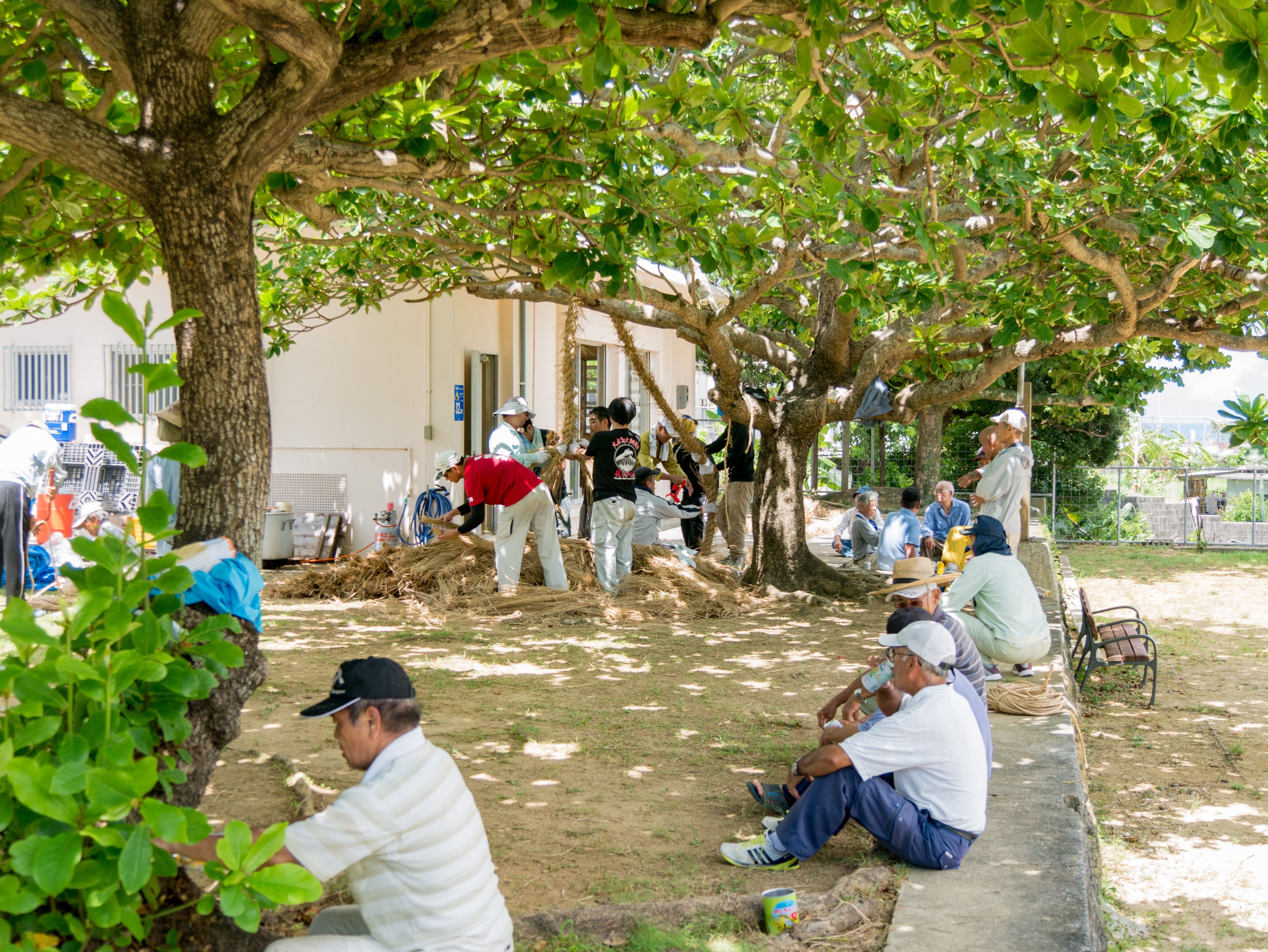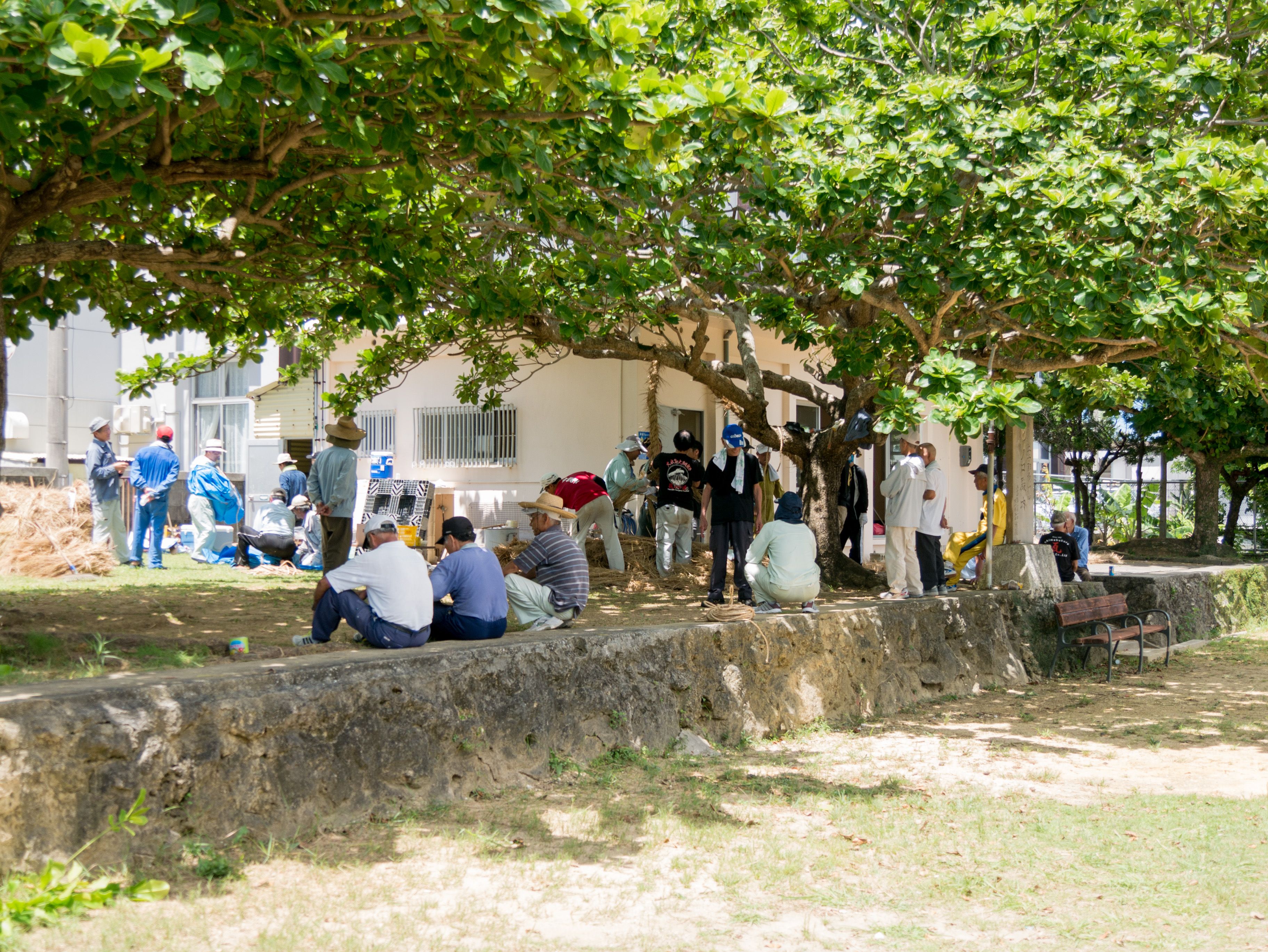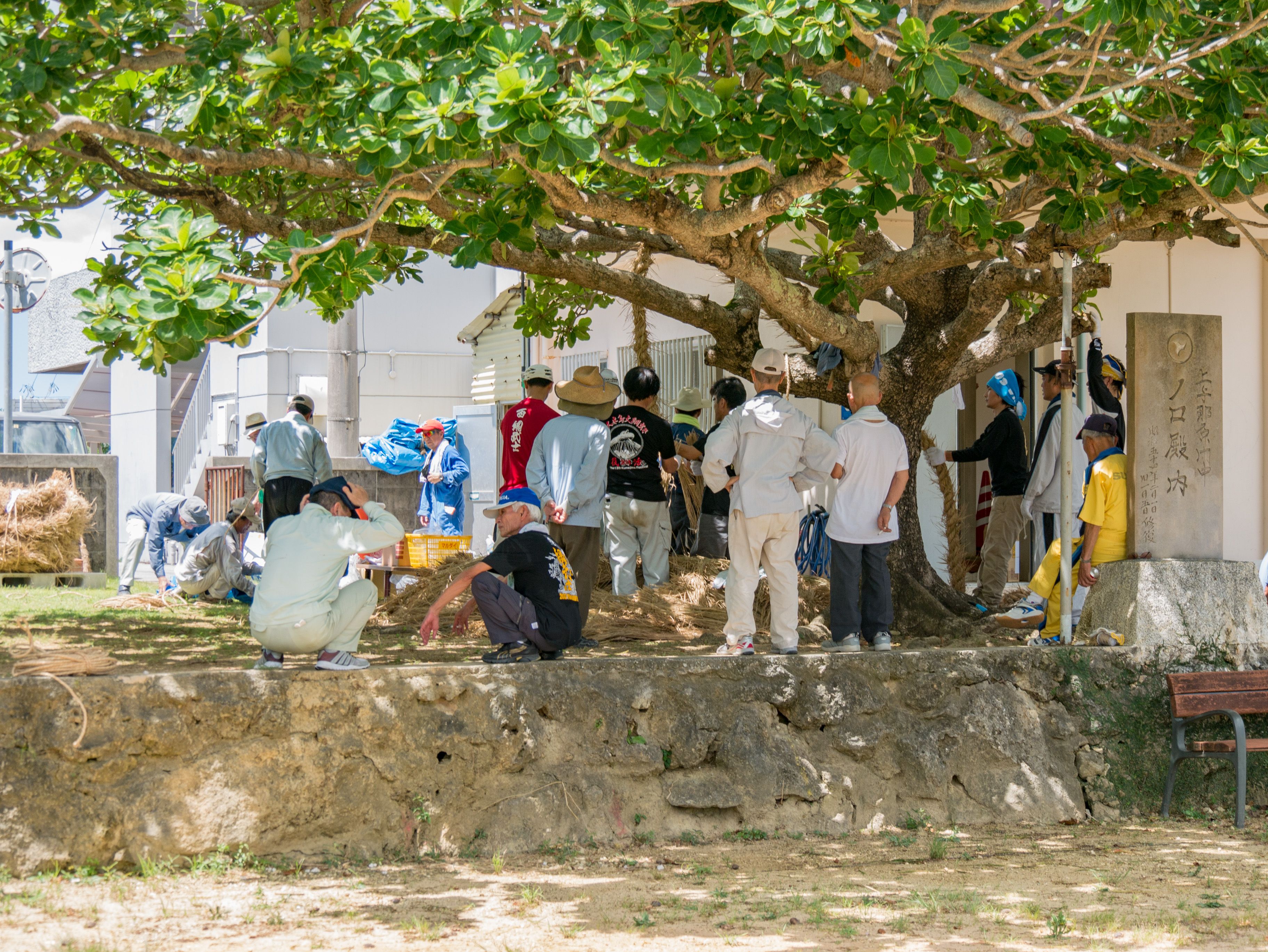 与那原大綱曳で使われる本綱は長さ約90メートル、重量5トンで雄綱(東)と雌綱(西)に分かれており、毎年新しく作られます。本綱の元になる綱は町内12区の分担で作られており、藁の束から細い綱を作り何本もより合わせ太い綱にしていきます。各区が作った綱は大綱曳の前日に本綱として編まれ完成します。各区の割り当て(100m×2本、90m×2本、80m×2本、70m×2本、枝綱35m×4本)