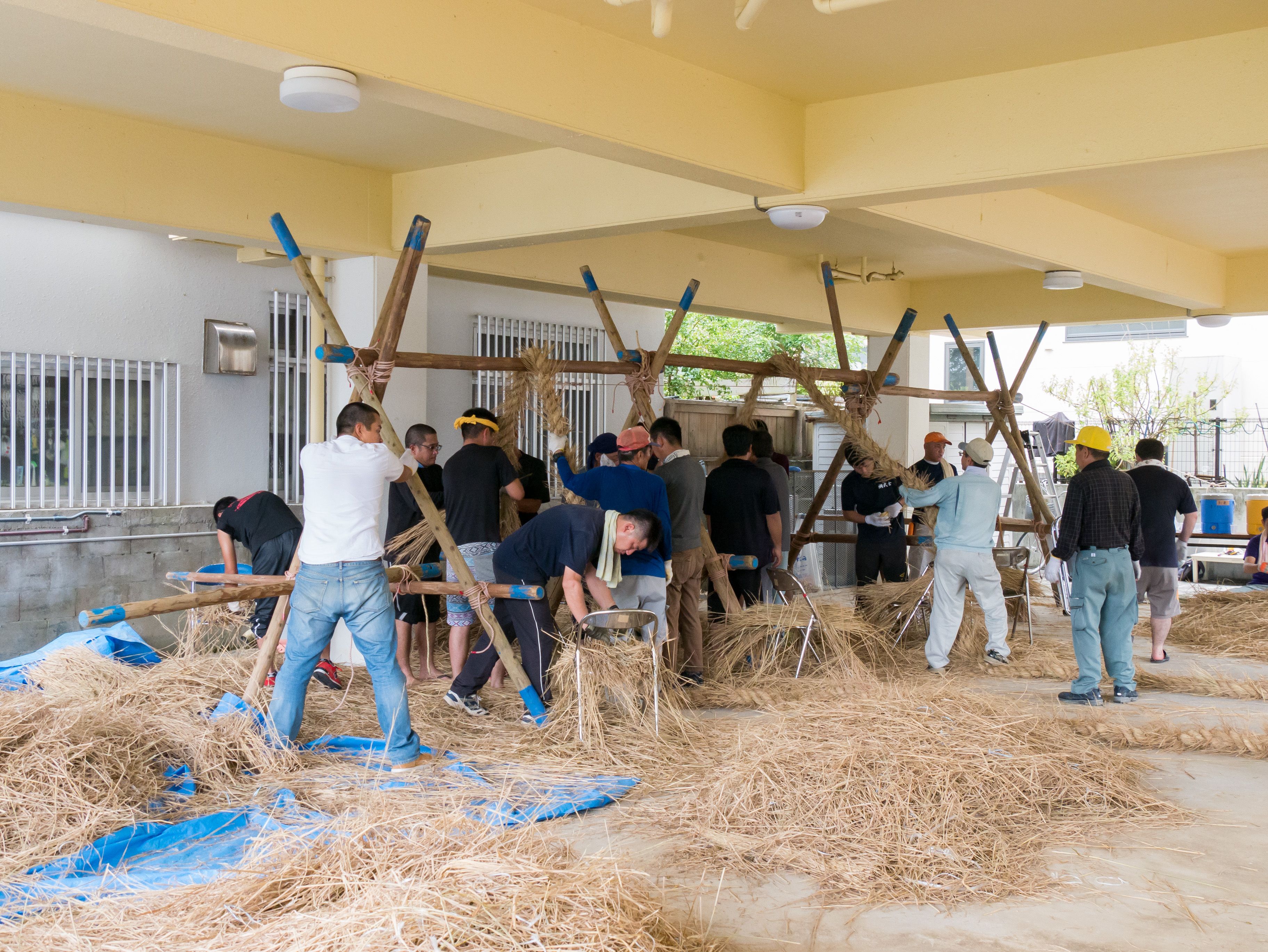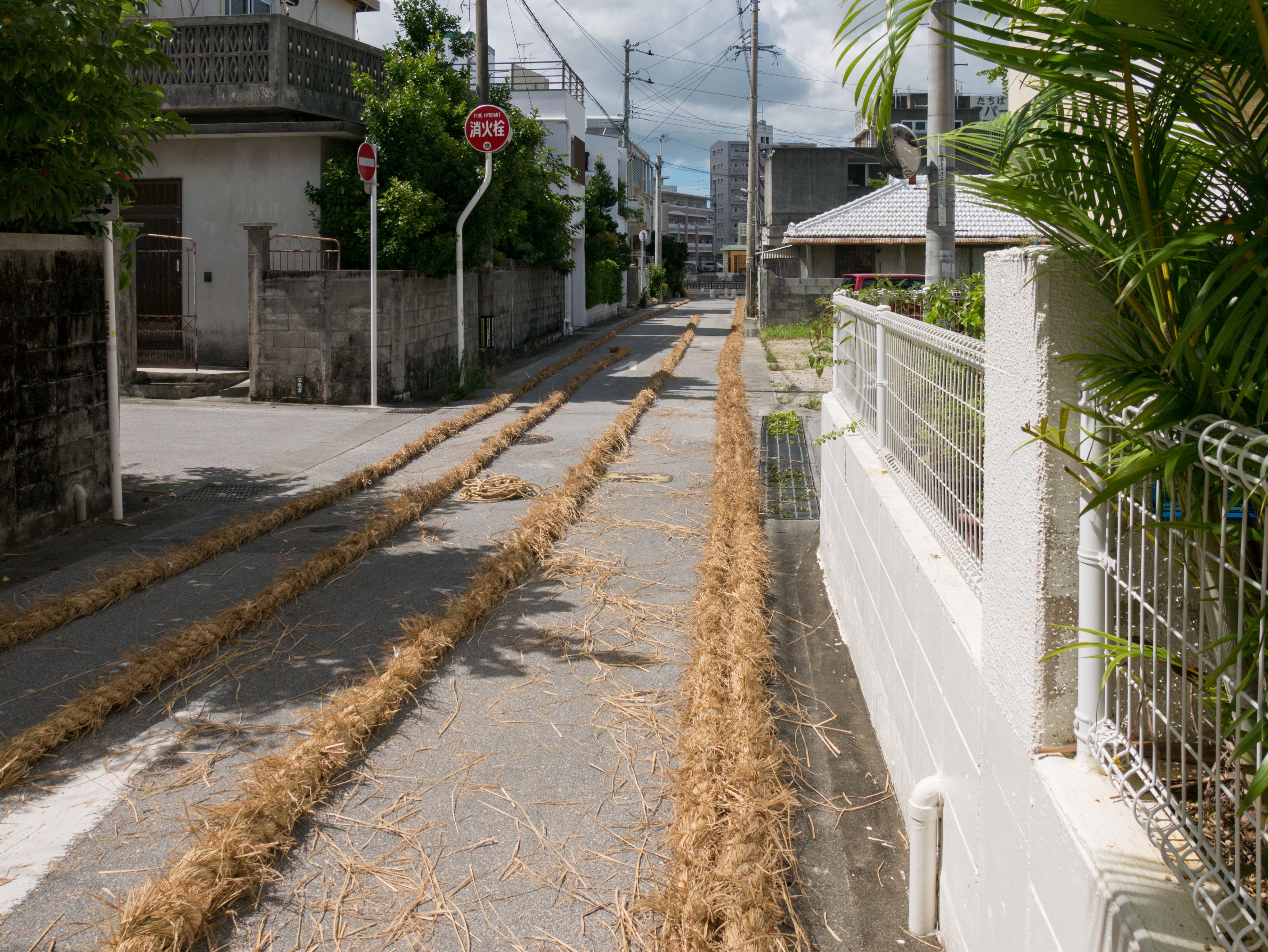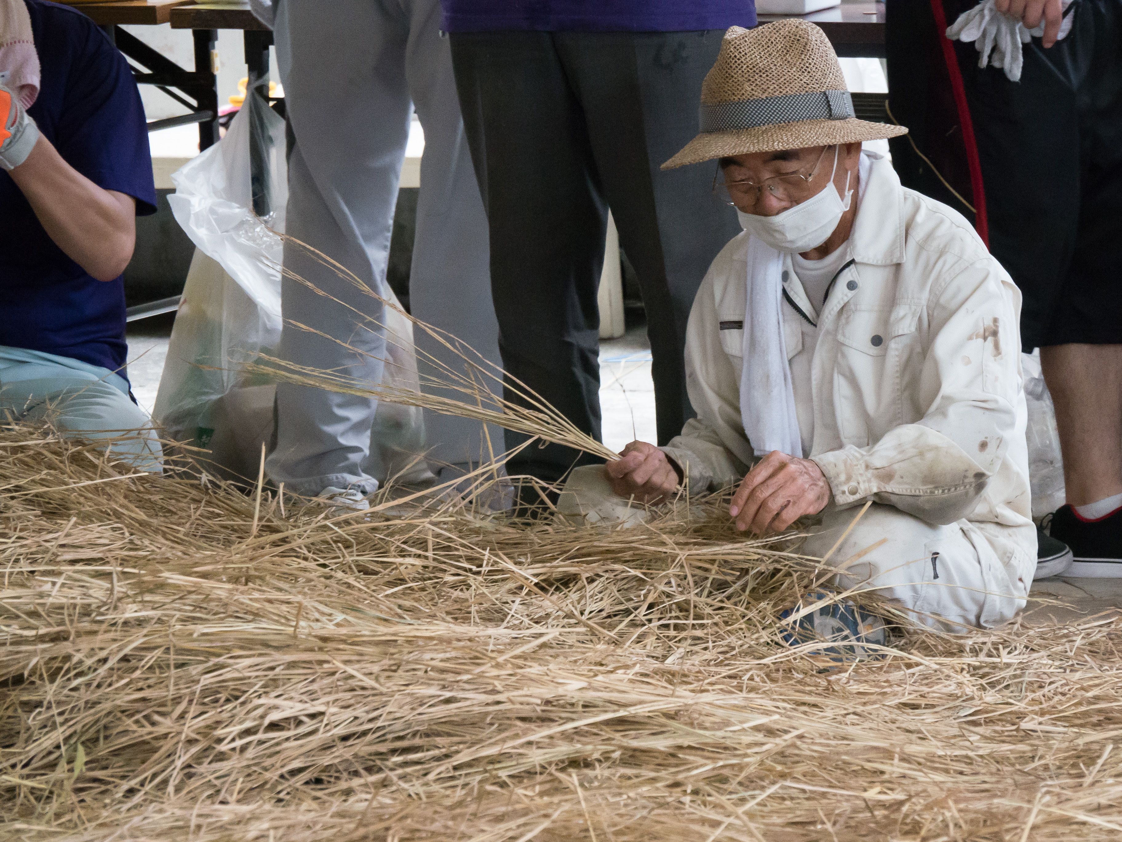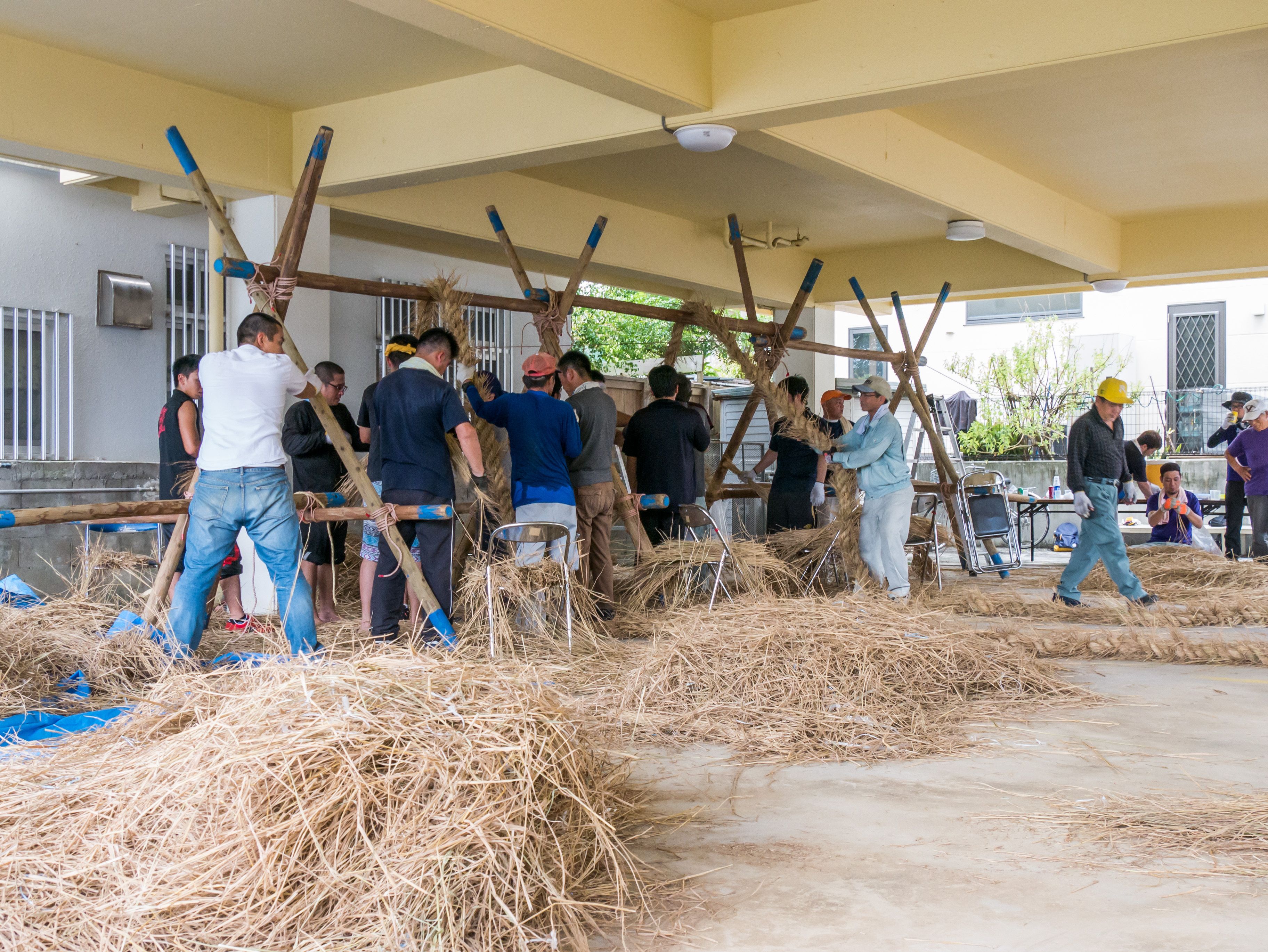 与那原大綱曳で使われる本綱は長さ約90メートル、重量5トンで雄綱(東)と雌綱(西)に分かれており、毎年新しく作られます。本綱の元になる綱は町内12区の分担で作られており、藁の束から細い綱を作り何本もより合わせ太い綱にしていきます。各区が作った綱は大綱曳の前日に本綱として編まれ完成します。各区の割り当て(100m×2本、90m×2本、80m×2本、70m×2本、枝綱35m×4本)