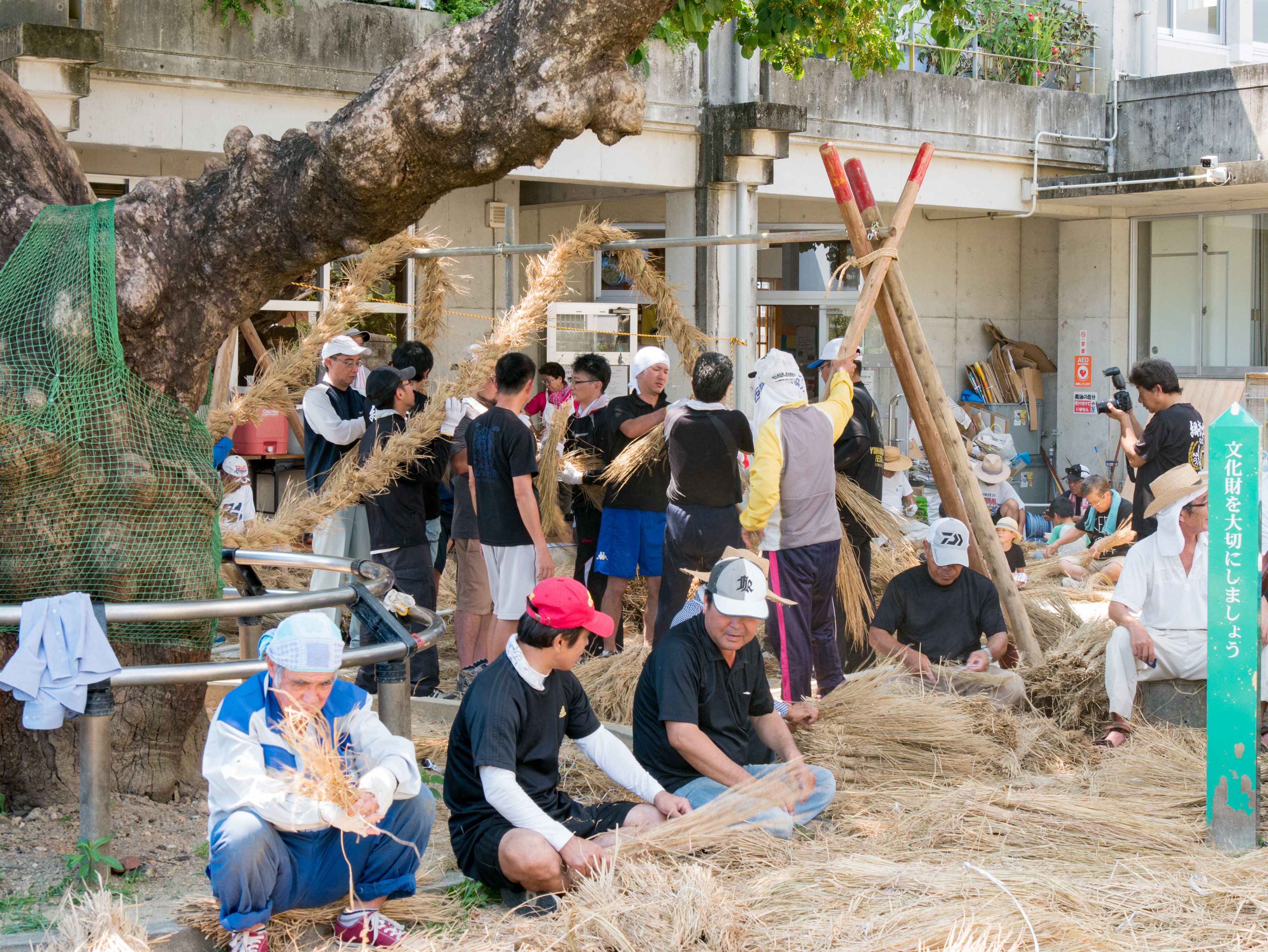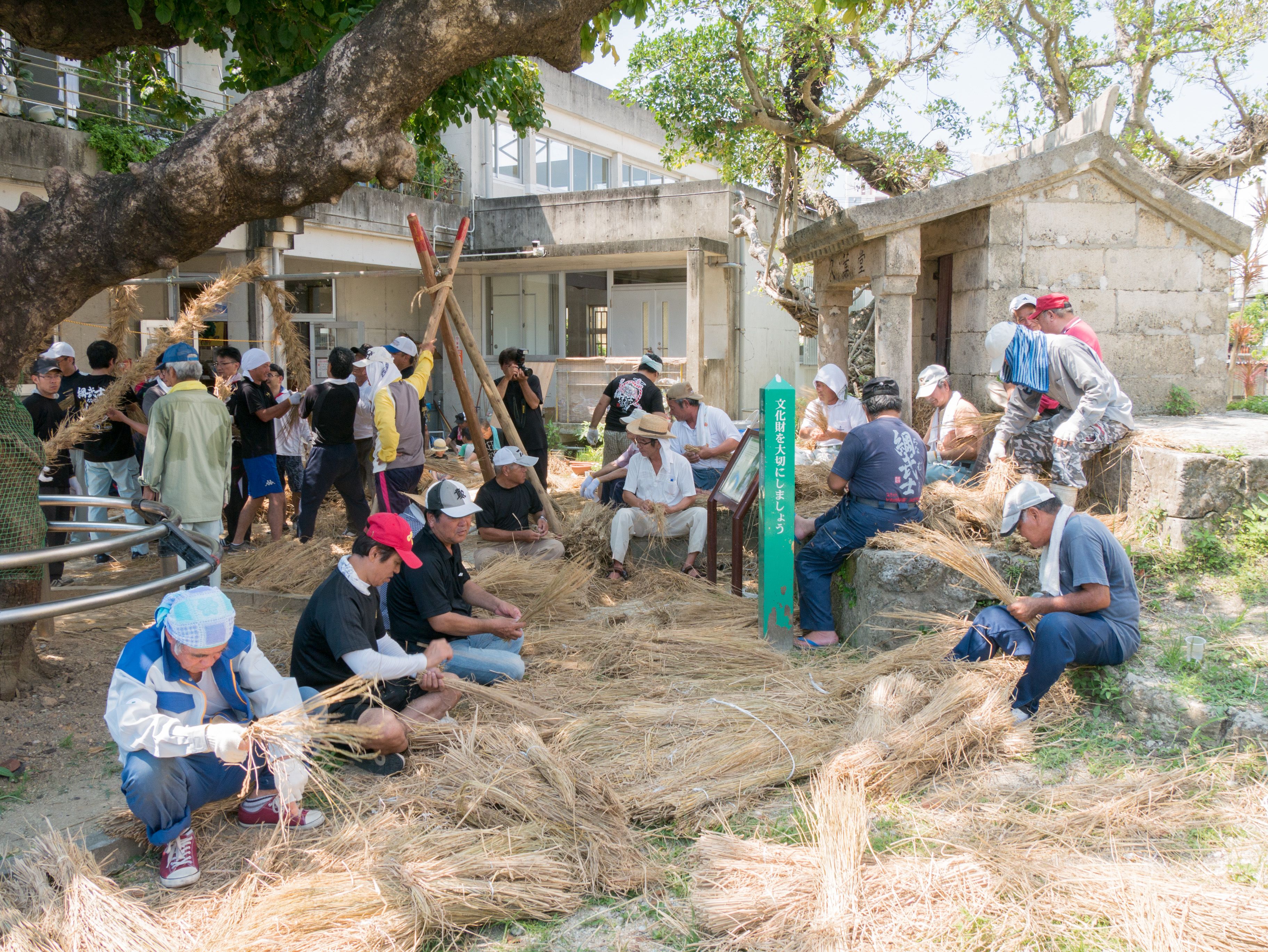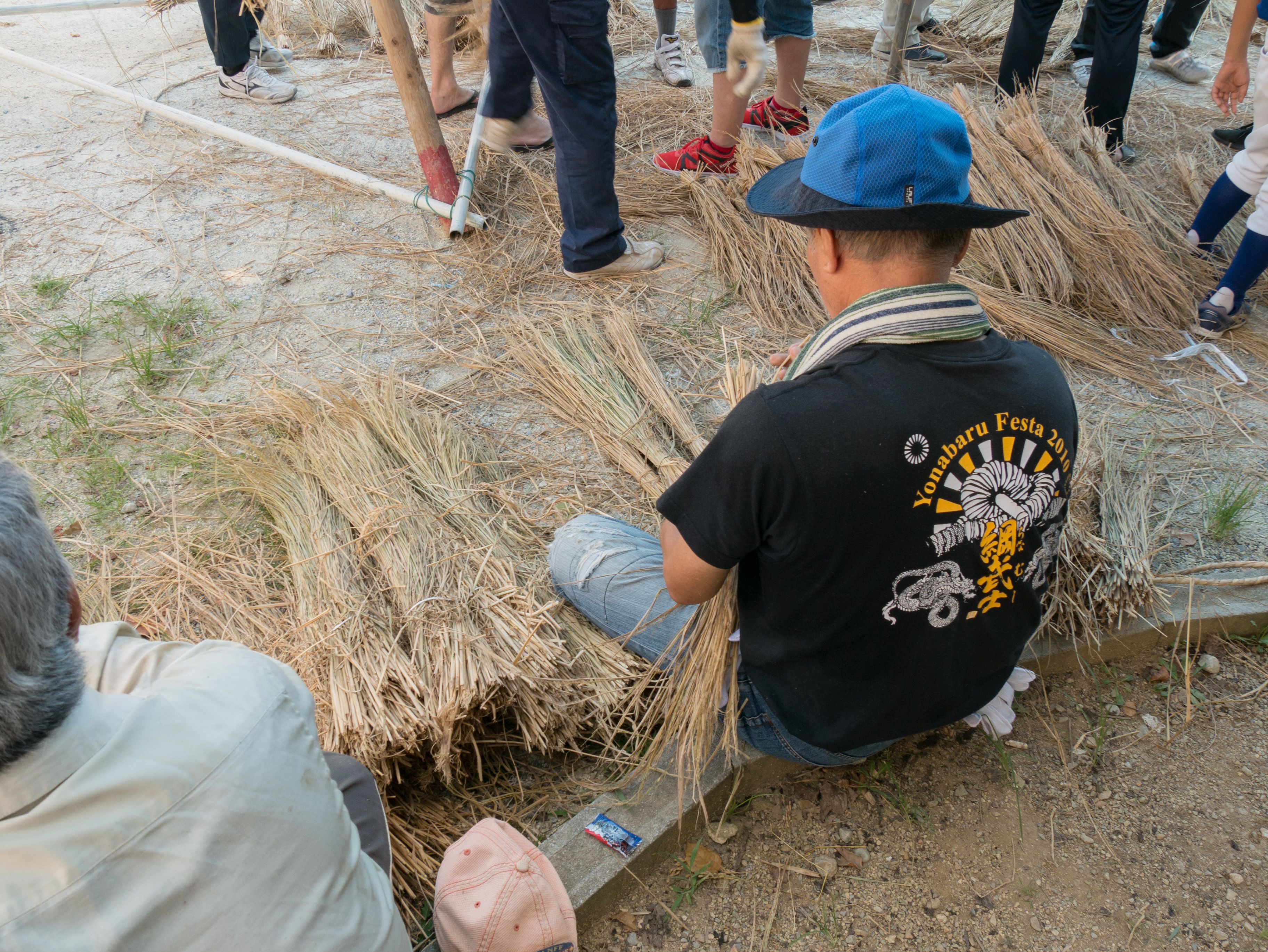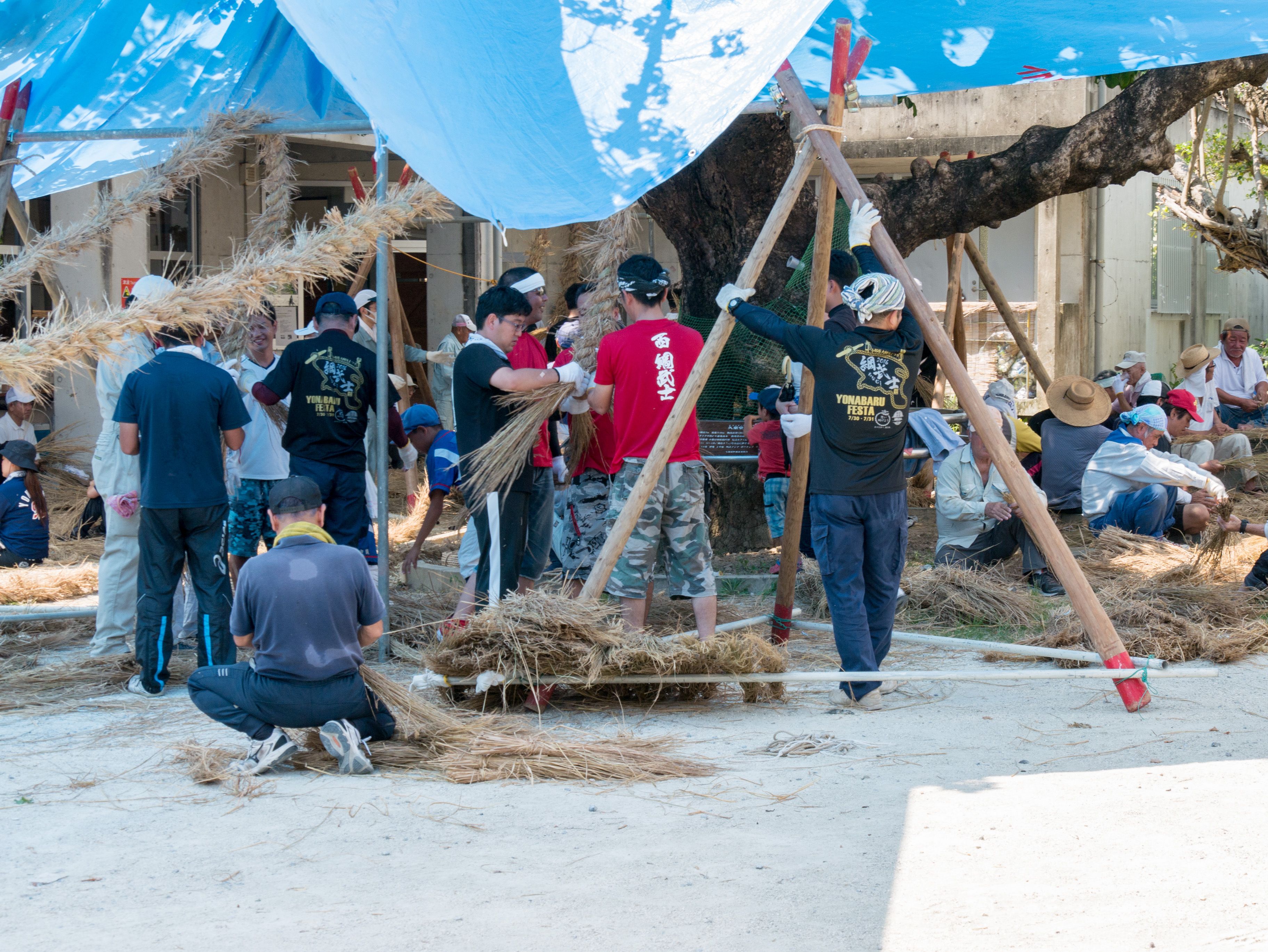 与那原大綱曳で使われる本綱は長さ約90メートル、重量5トンで雄綱(東)と雌綱(西)に分かれており、毎年新しく作られます。本綱の元になる綱は町内12区の分担で作られており、藁の束から細い綱を作り何本もより合わせ太い綱にしていきます。各区が作った綱は大綱曳の前日に本綱として編まれ完成します。各区の割り当て(100m×2本、90m×2本、80m×2本、70m×2本、枝綱35m×4本)