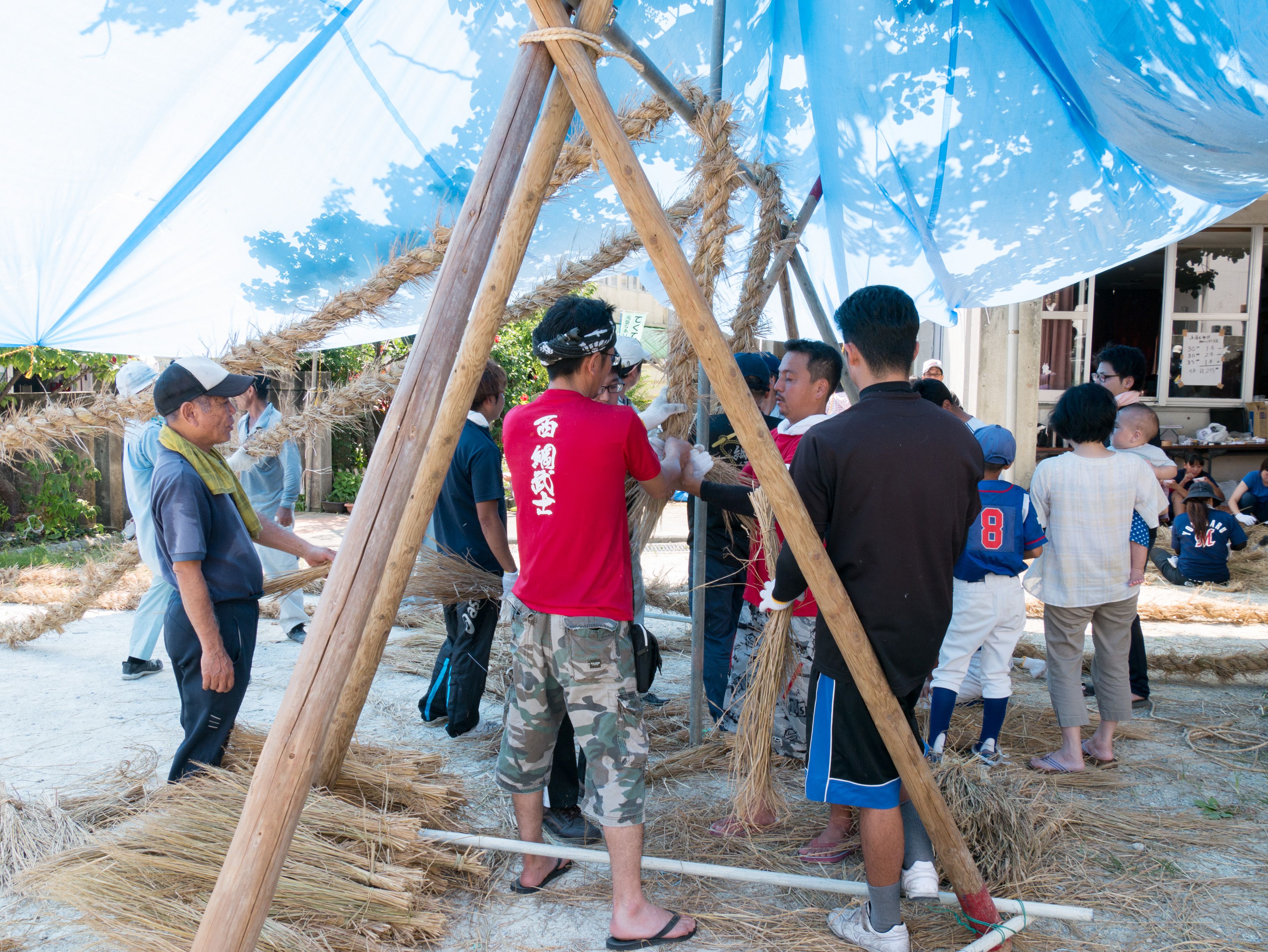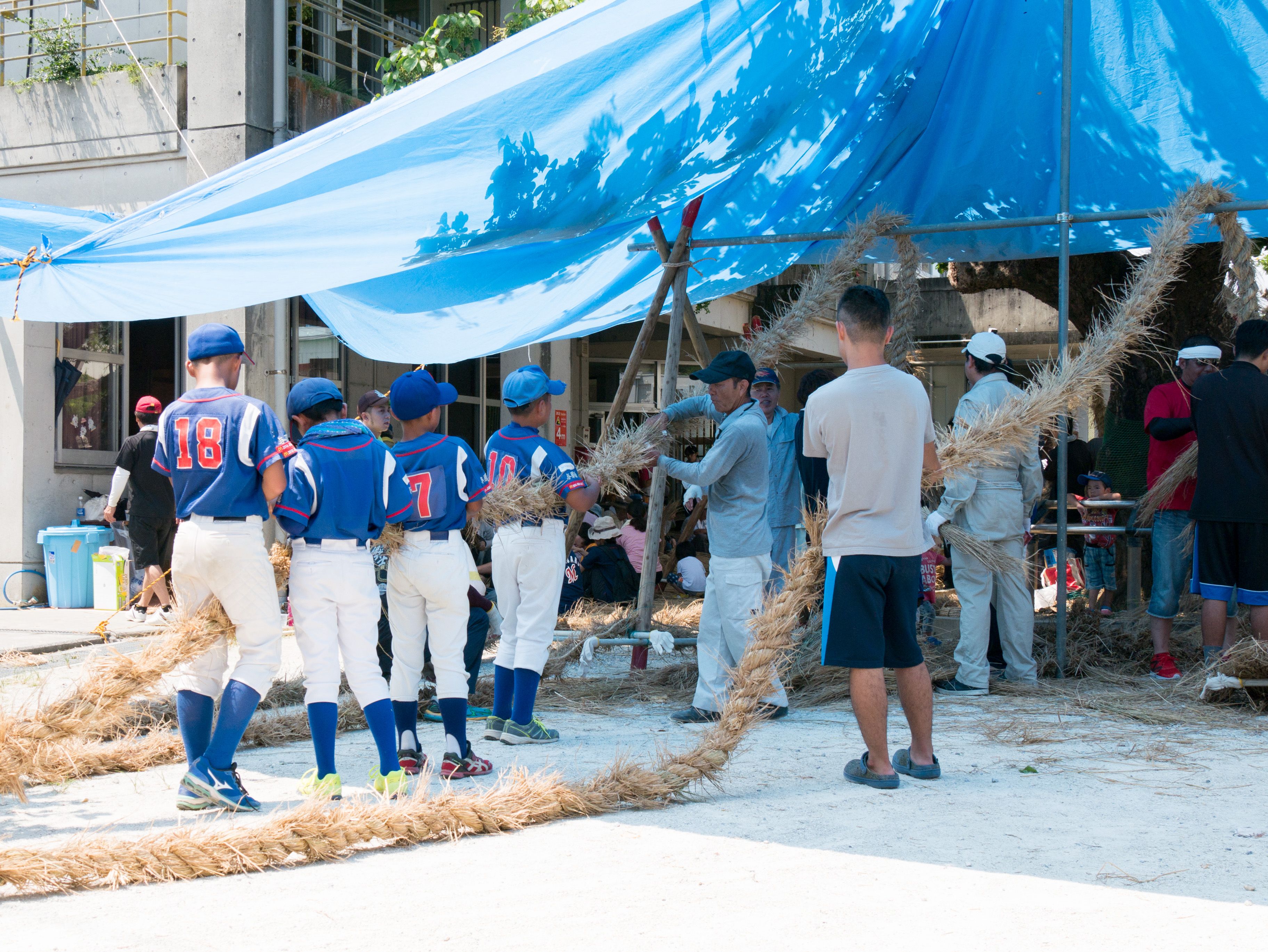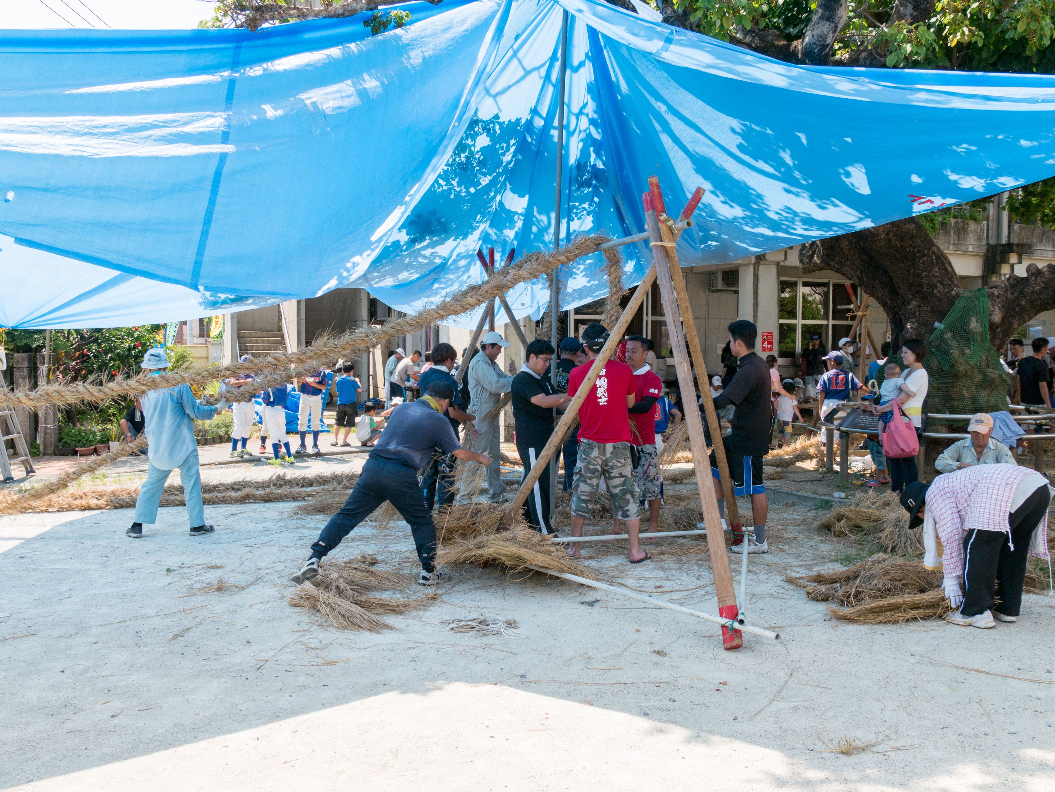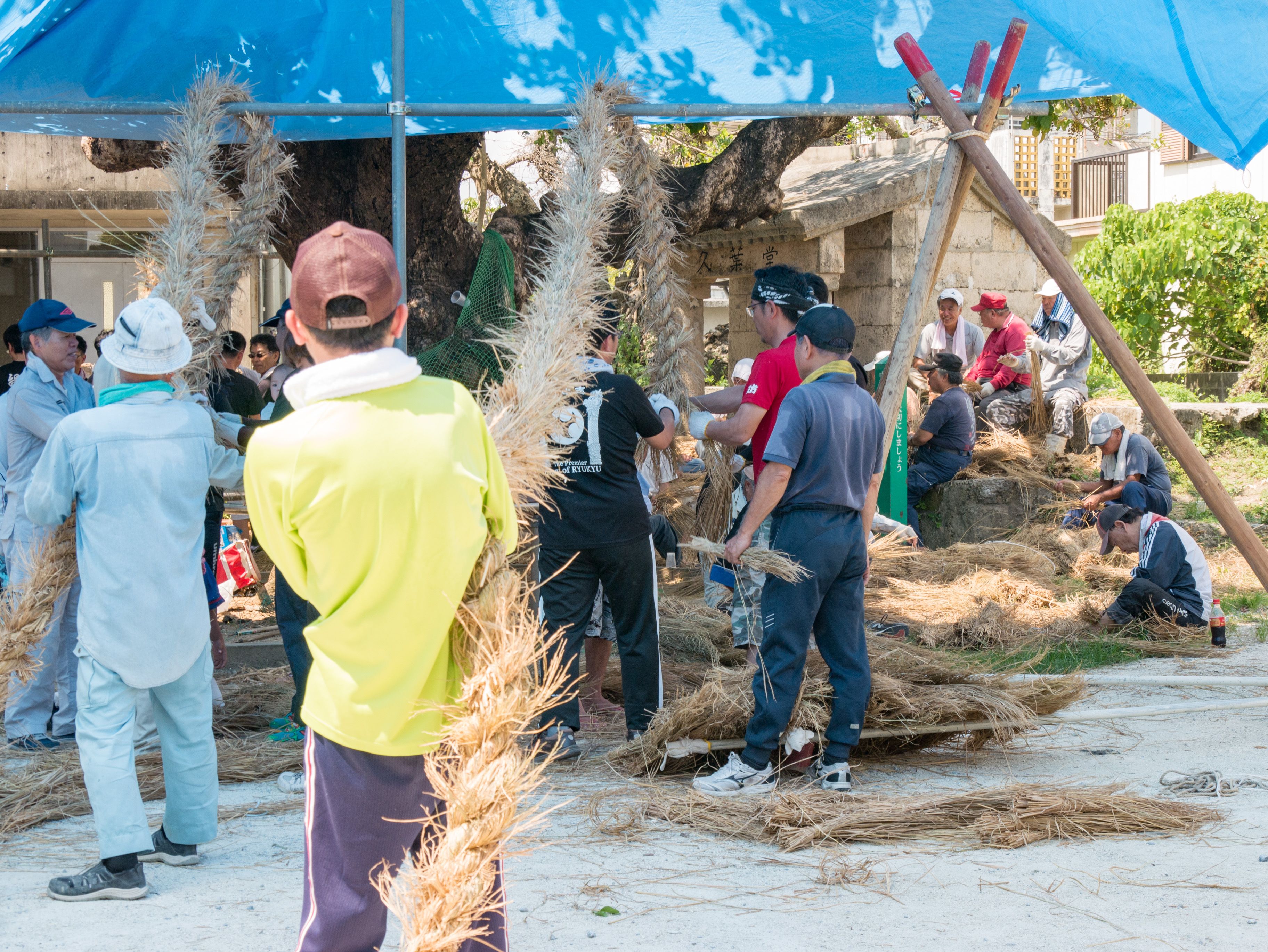与那原大綱曳で使われる本綱は長さ約90メートル、重量5トンで雄綱(東)と雌綱(西)に分かれており、毎年新しく作られます。本綱の元になる綱は町内12区の分担で作られており、藁の束から細い綱を作り何本もより合わせ太い綱にしていきます。各区が作った綱は大綱曳の前日に本綱として編まれ完成します。各区の割り当て(100m×2本、90m×2本、80m×2本、70m×2本、枝綱35m×4本)