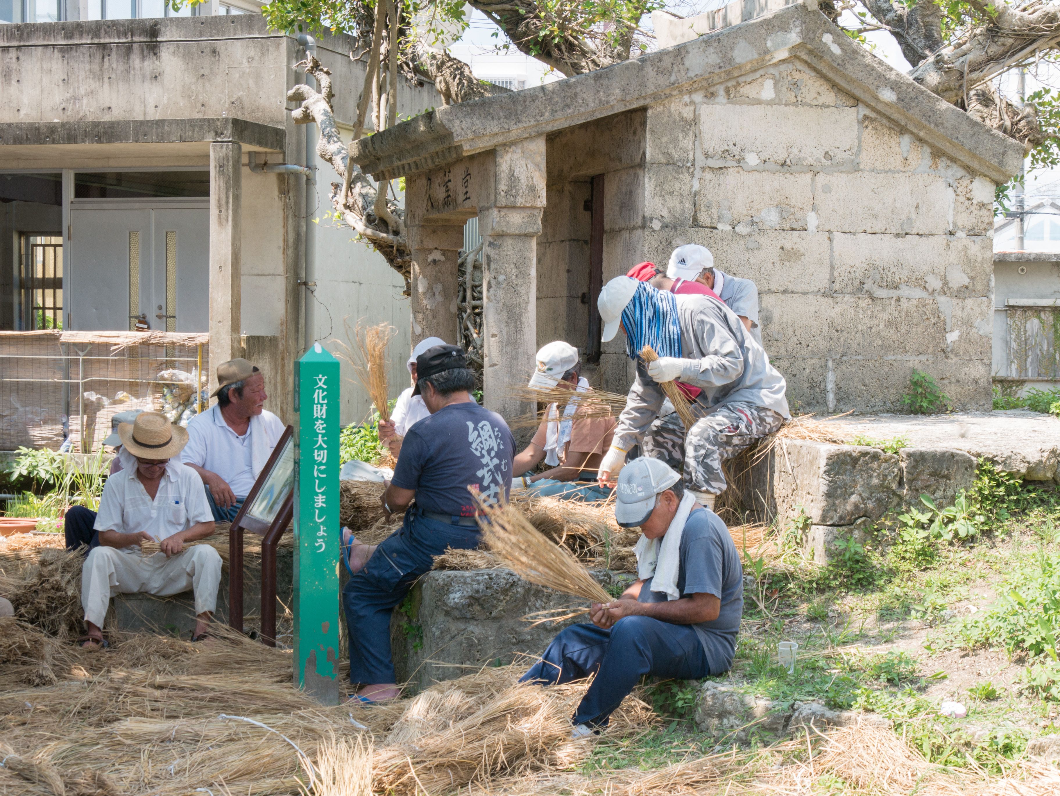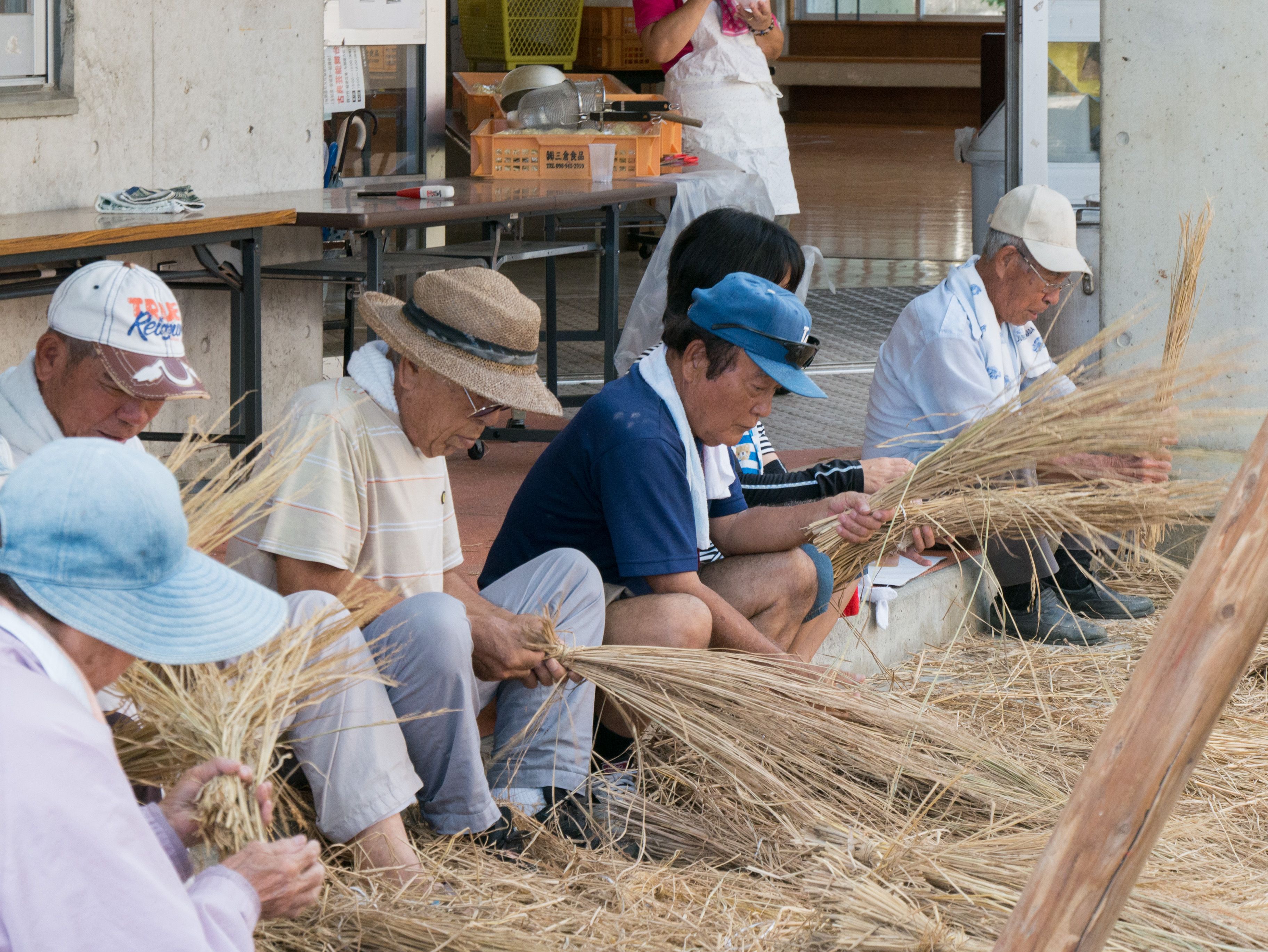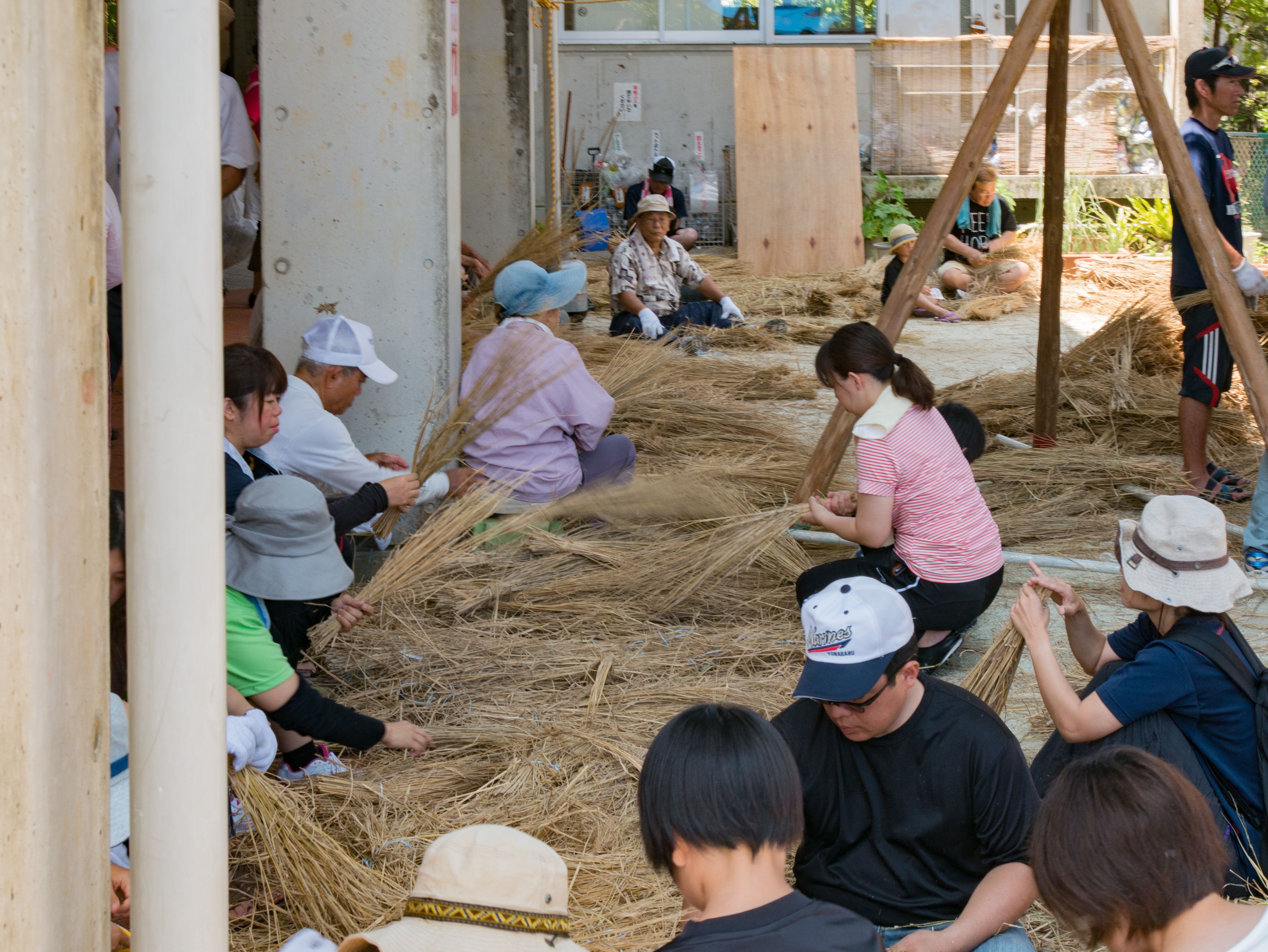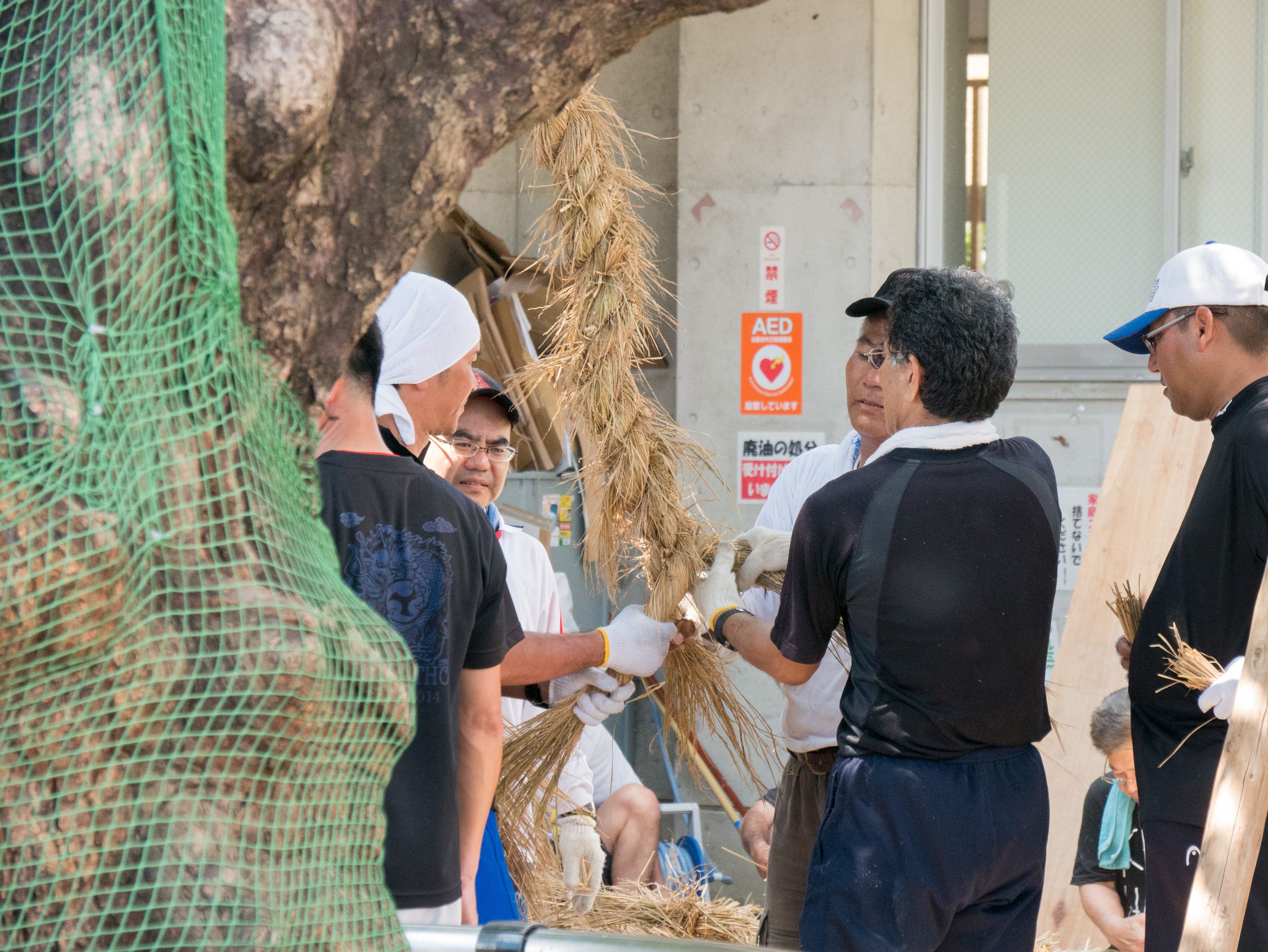 与那原大綱曳で使われる本綱は長さ約90メートル、重量5トンで雄綱(東)と雌綱(西)に分かれており、毎年新しく作られます。本綱の元になる綱は町内12区の分担で作られており、藁の束から細い綱を作り何本もより合わせ太い綱にしていきます。各区が作った綱は大綱曳の前日に本綱として編まれ完成します。各区の割り当て(100m×2本、90m×2本、80m×2本、70m×2本、枝綱35m×4本)