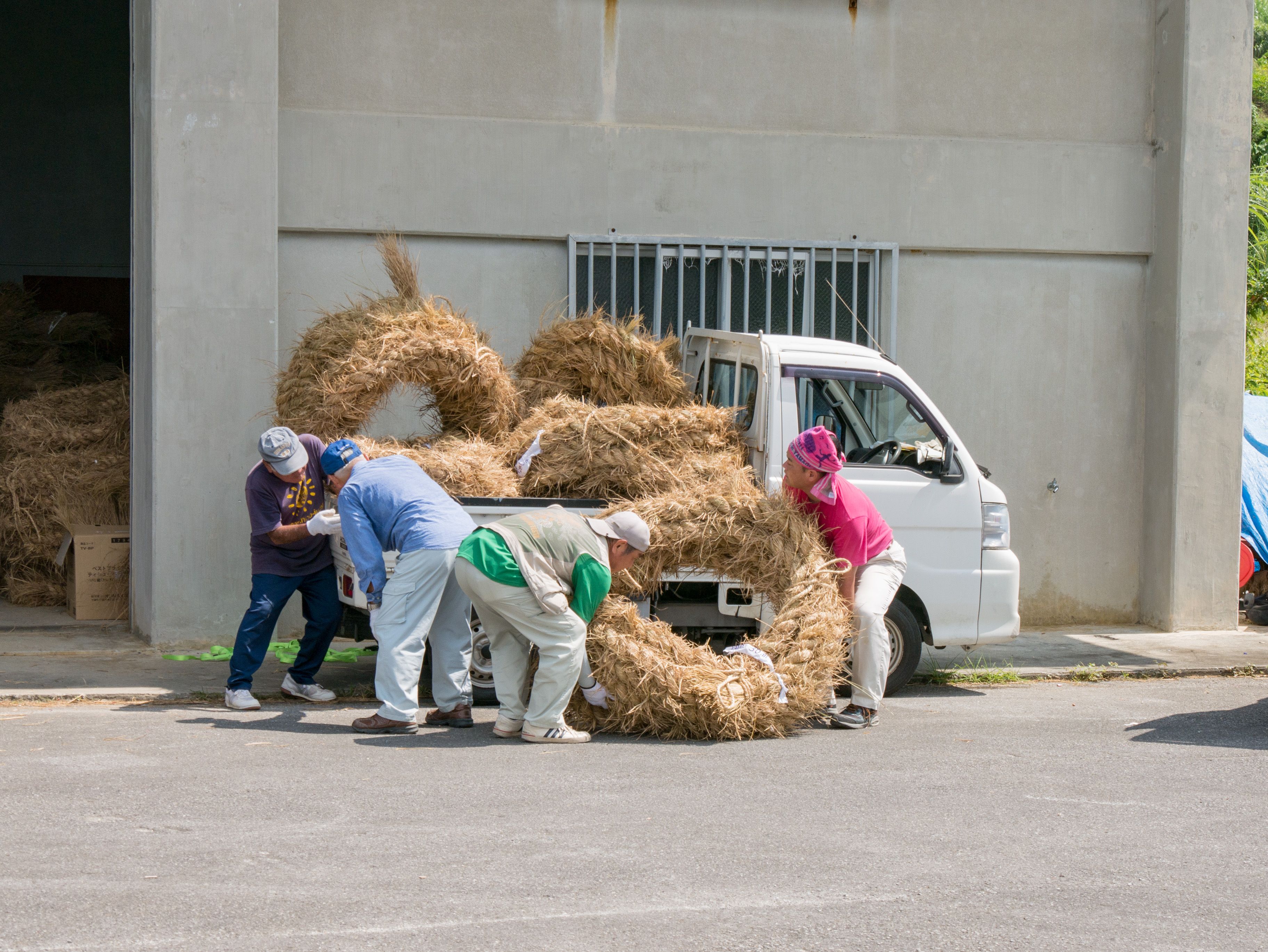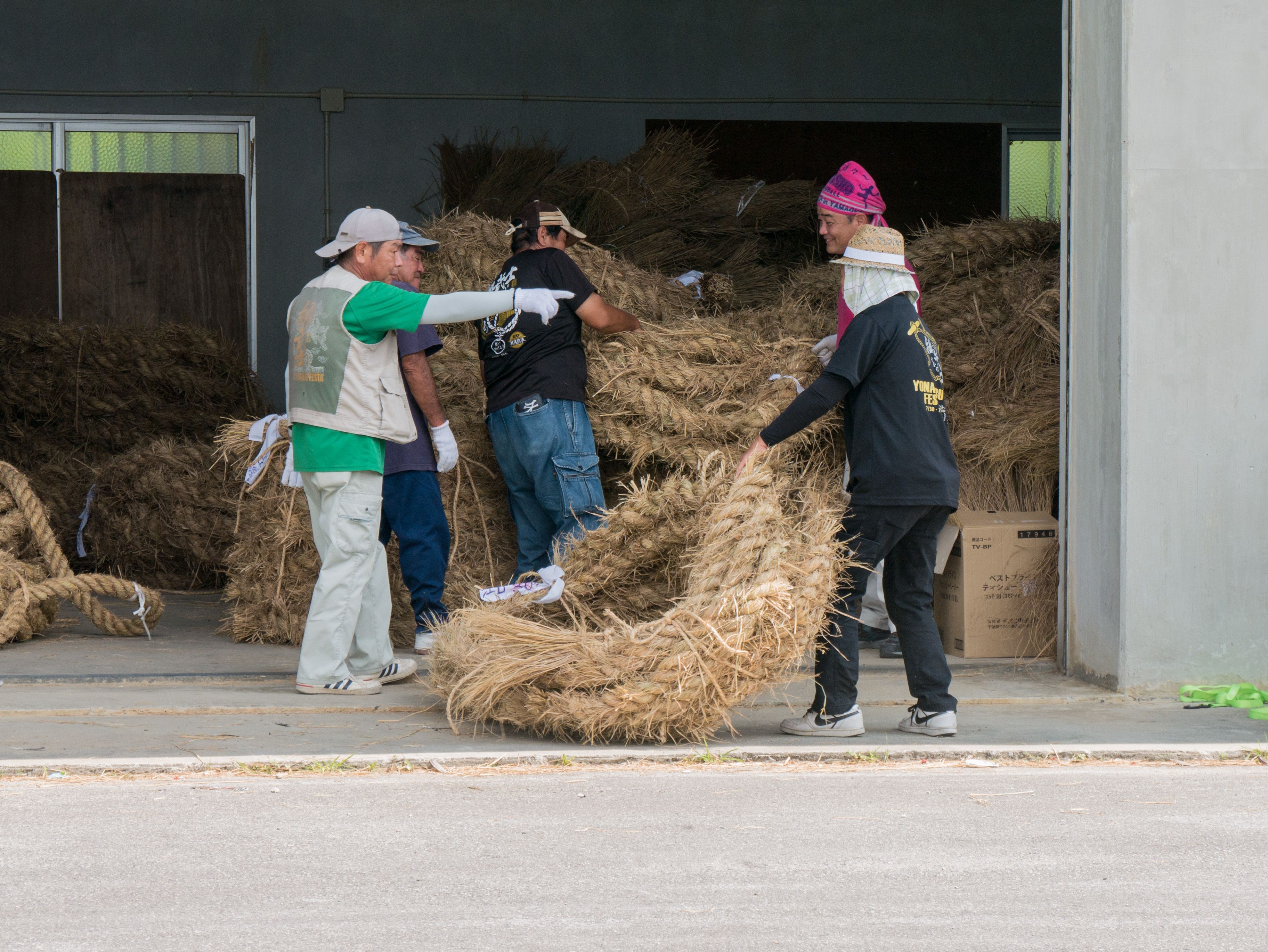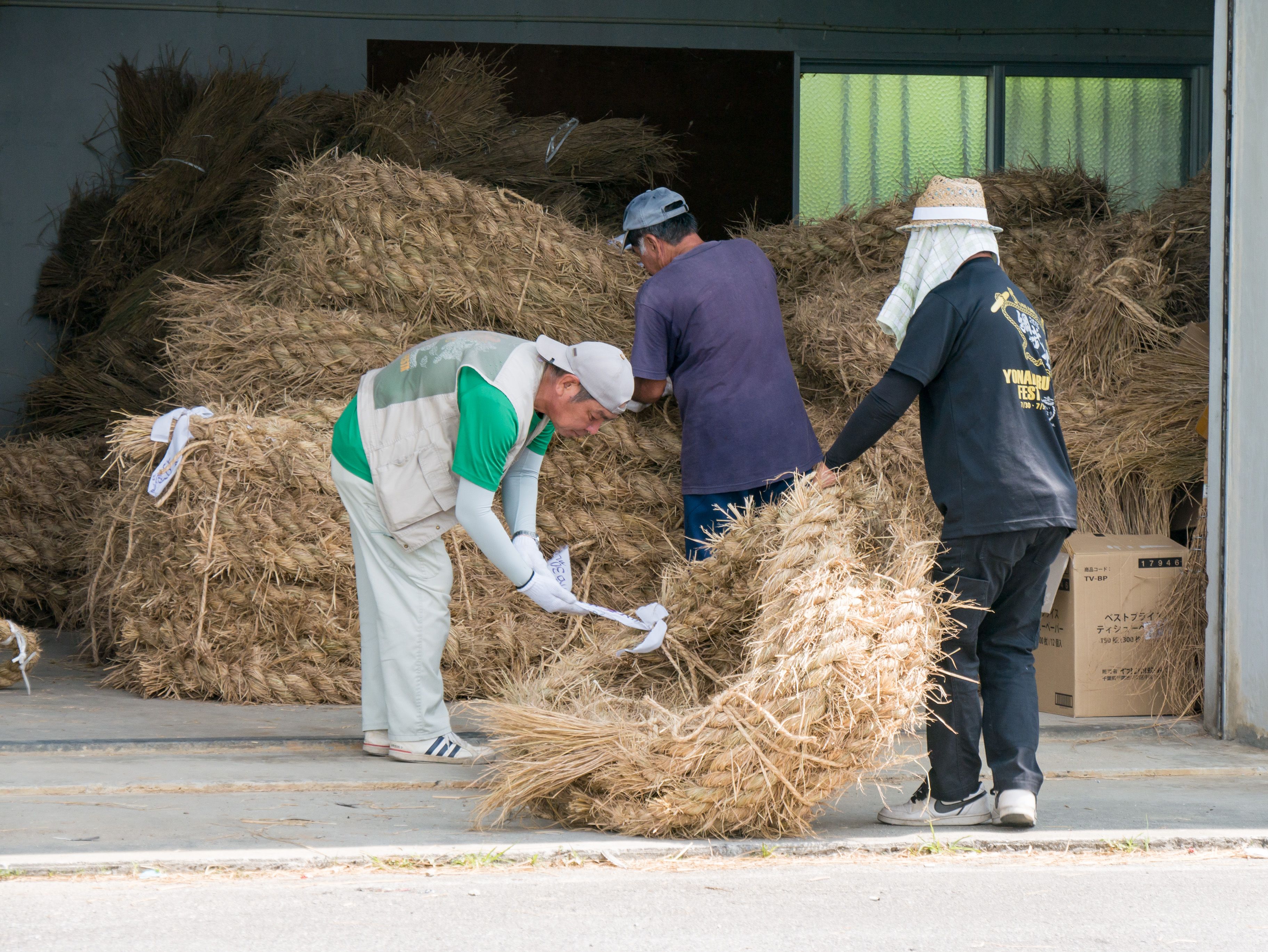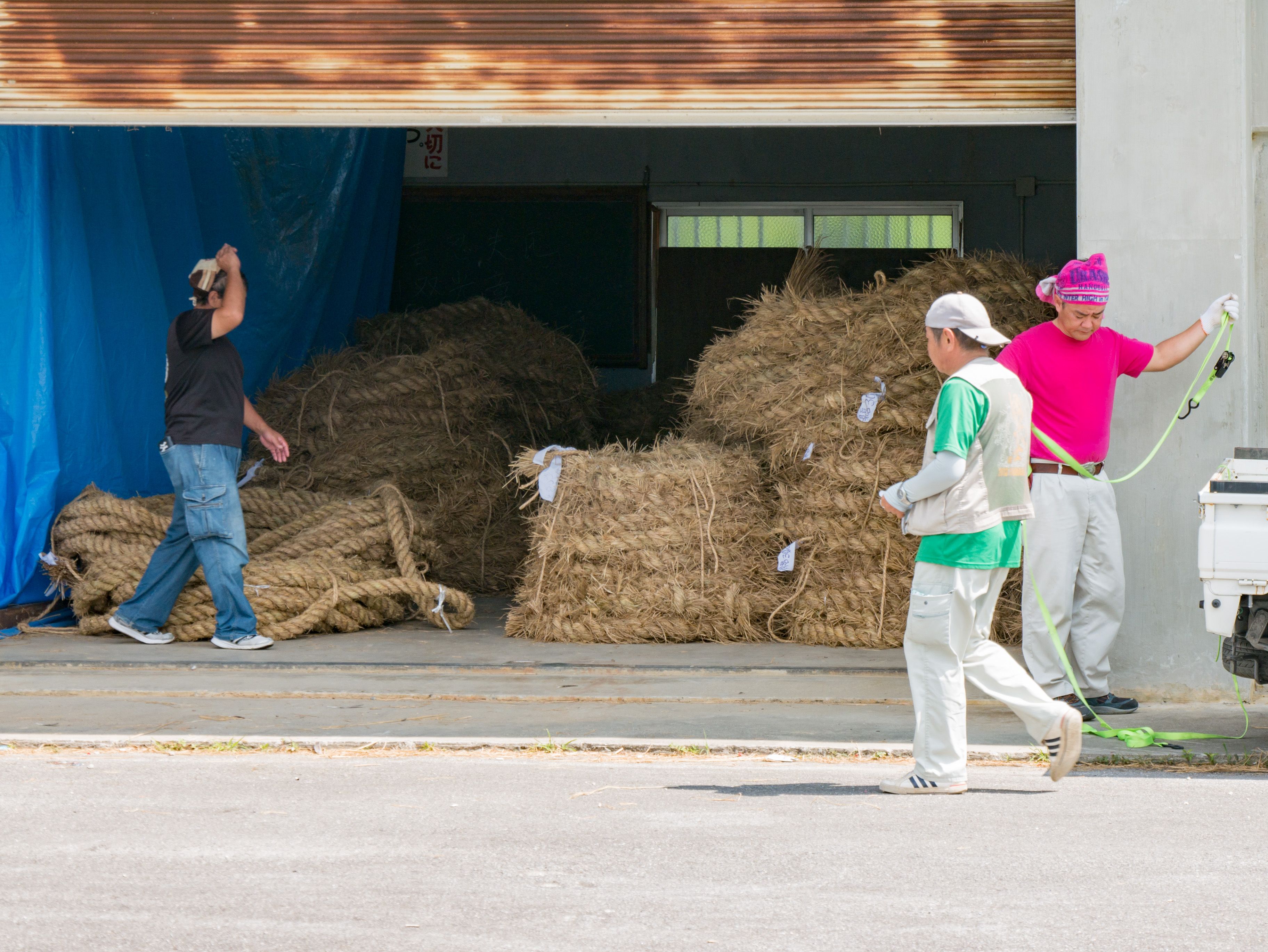 町内12区の分担で作られた綱は一か所の倉庫に集められ本綱製作の日まで保管されます。本綱製作は大綱曳の前日に町内の中央通りで行われます。本綱製作に合わせて倉庫から中央通りまで綱を運びます。