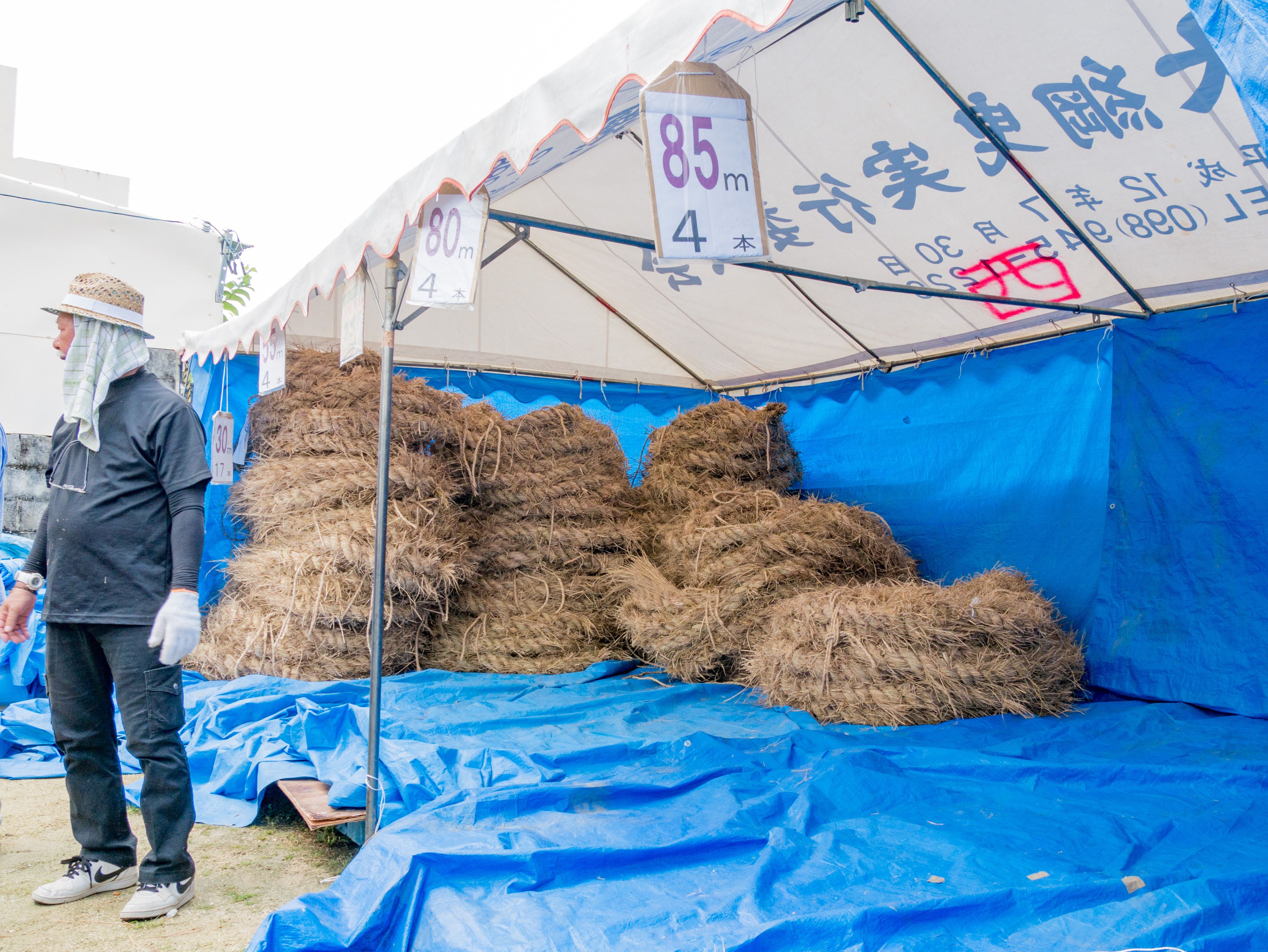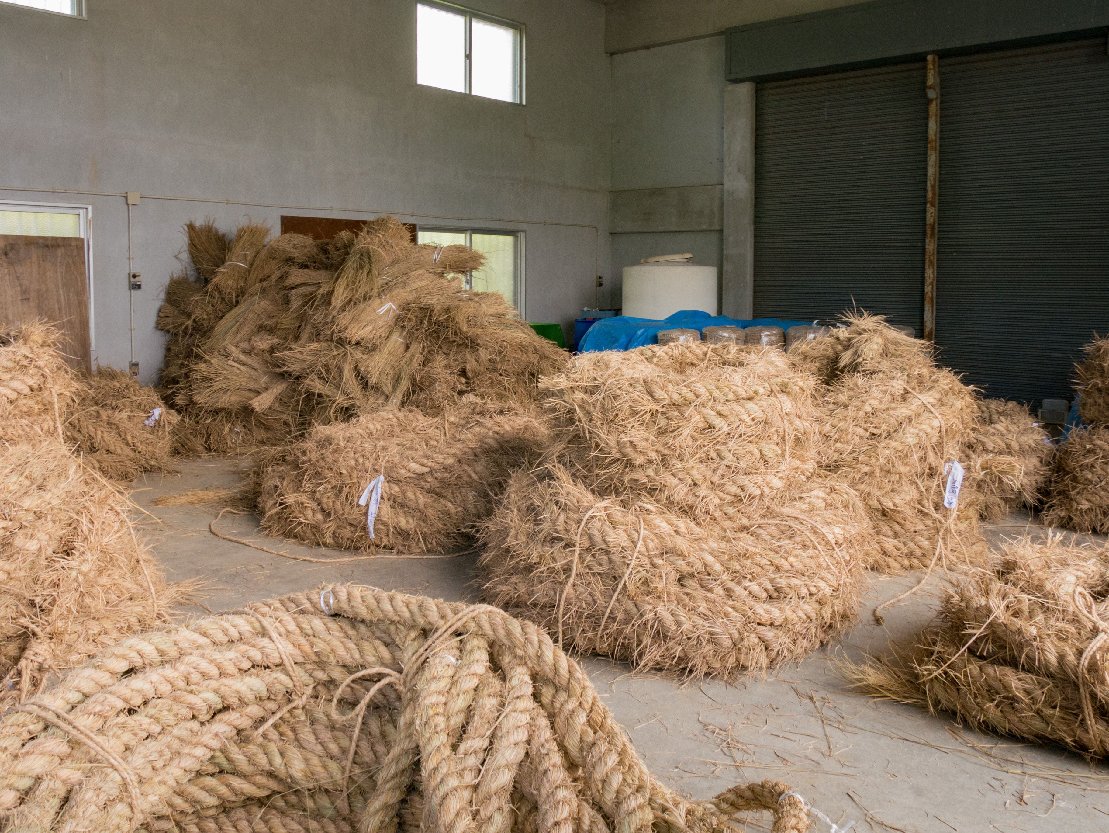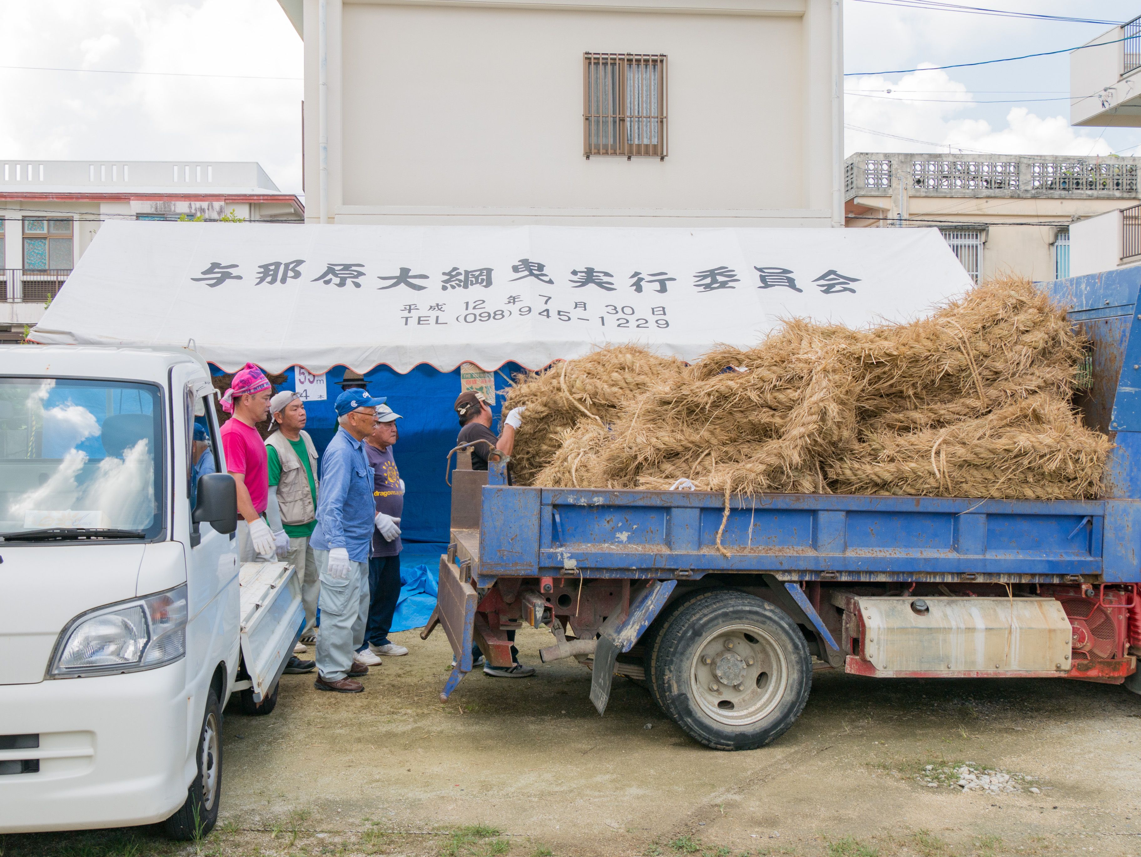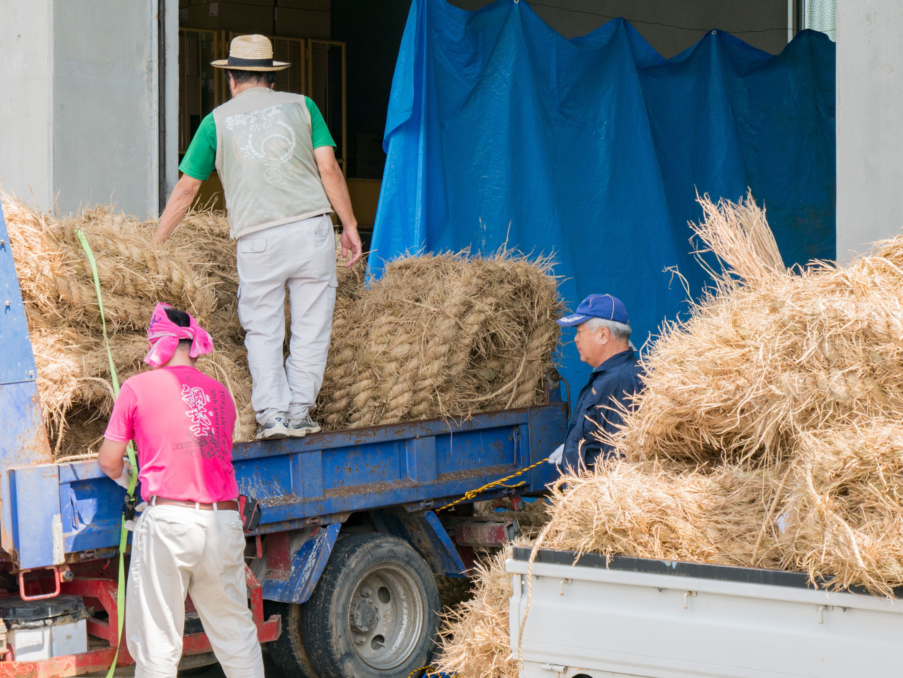 町内12区の分担で作られた綱は一か所の倉庫に集められ本綱製作の日まで保管されます。本綱製作は大綱曳の前日に町内の中央通りで行われます。本綱製作に合わせて倉庫から中央通りまで綱を運びます。
