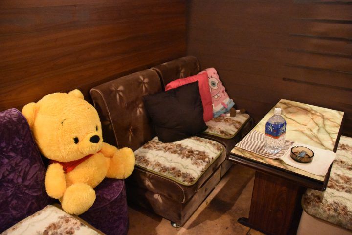 広い店内の奥にちょこんと座ったプーさんが可愛い。お客さまの抱き枕になっているとか。店内でつくるサービスのサラダやチャンプルーはボリュームがあって美味しい。カウンター7席、ボックスは8名、8名、4名と、グループで出かけても対応できますよ。