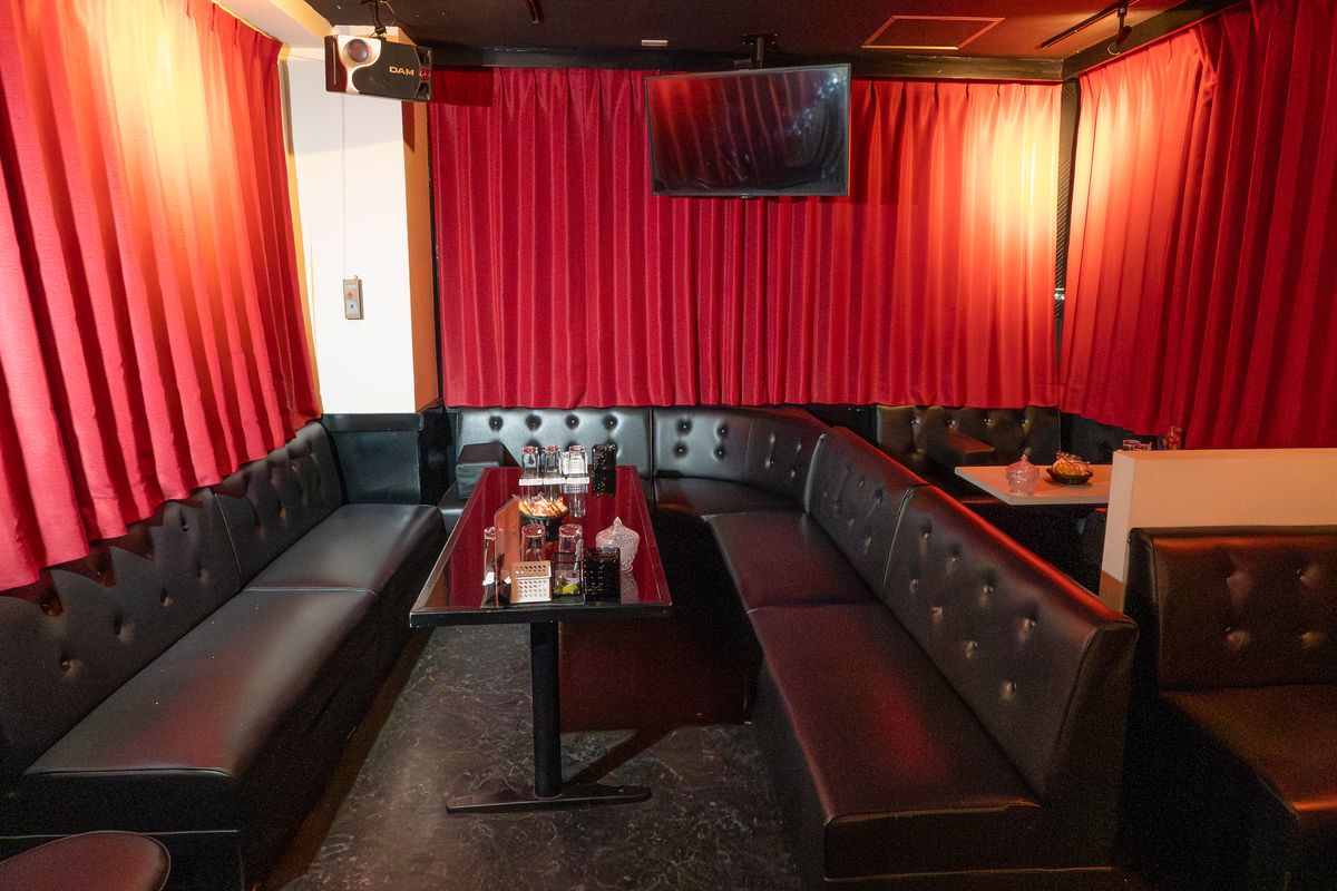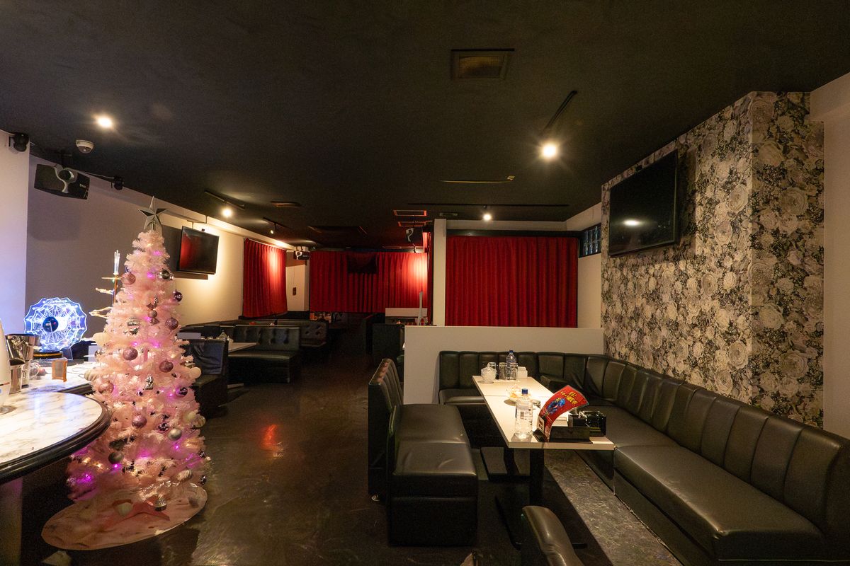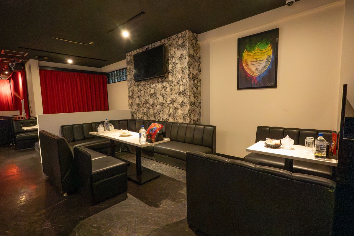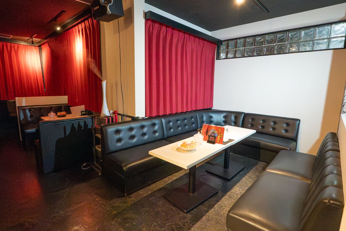 扉を開けると奥行きのある空間に赤いカーテンと黒の床と黒いソファでシックな装いの与那原屈指の大箱ラウンジです。