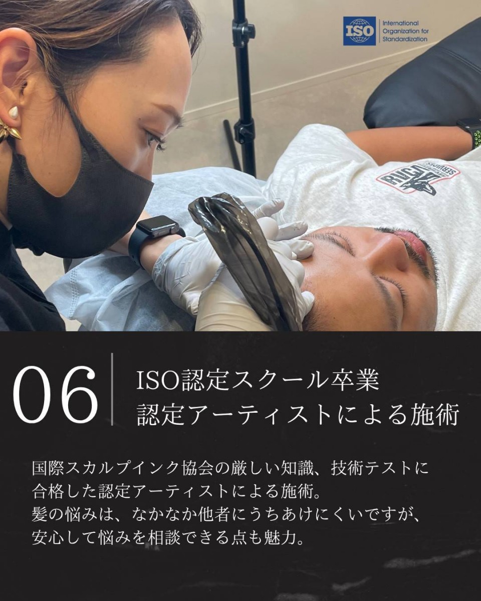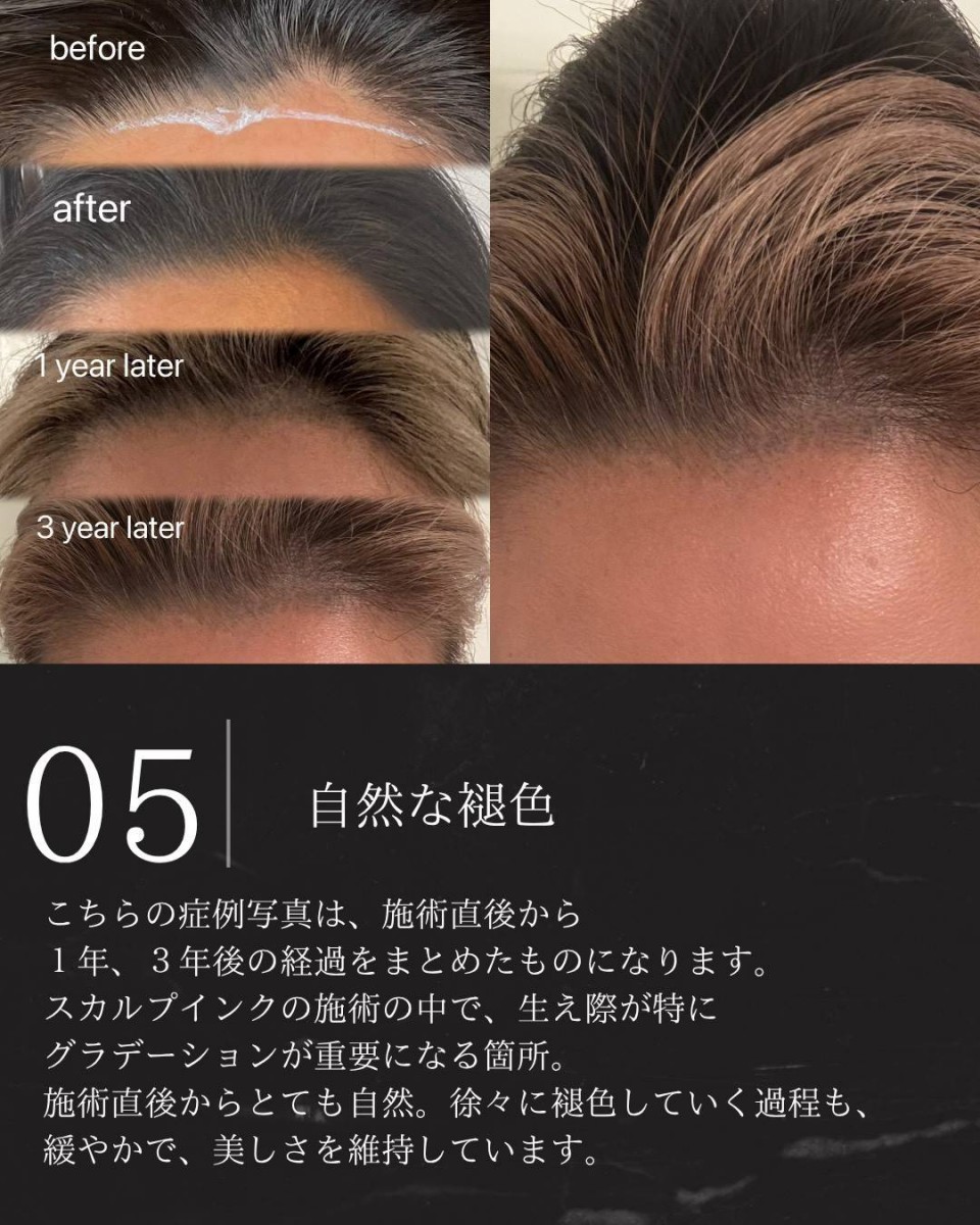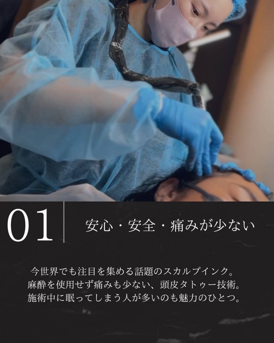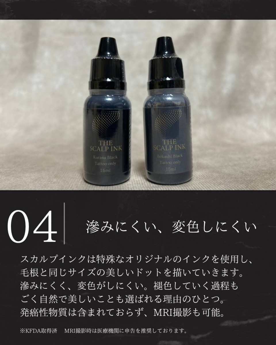 海外の施術例を見ると描かれた点の大きさが不揃いだったりインクが滲んで青くなったりと不自然な仕上がりも見られる事が多かったそうですが、沖縄県宜野湾市のタトゥーアーテイストが安全かつより自然な仕上がりを可能にしたスカルプインクの機器を開発し、日本タトゥー衛生協会も立ち上がった沖縄発の画期的新技術なんです。麻酔不使用なので医療行為には該当せず、使用するインクにも酸化鉄不使用なのでMRIにも入れます。