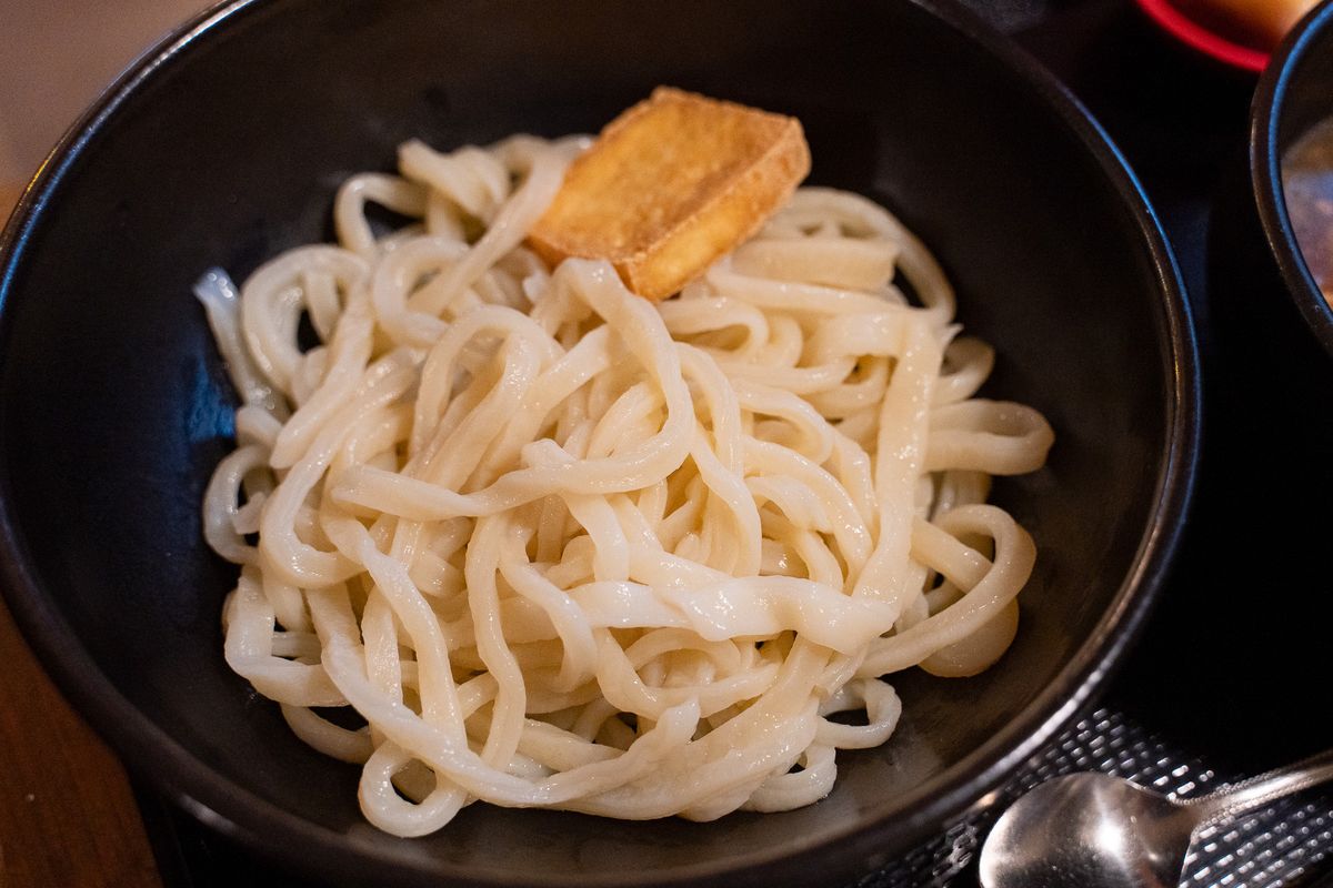 うどんは、その日の朝に打ち立て。釜揚げ後すぐに冷水でキュッと締めることで、しっかりとしたコシと小麦の風味が際立ち、一度食べるとやみつきになる食感です。