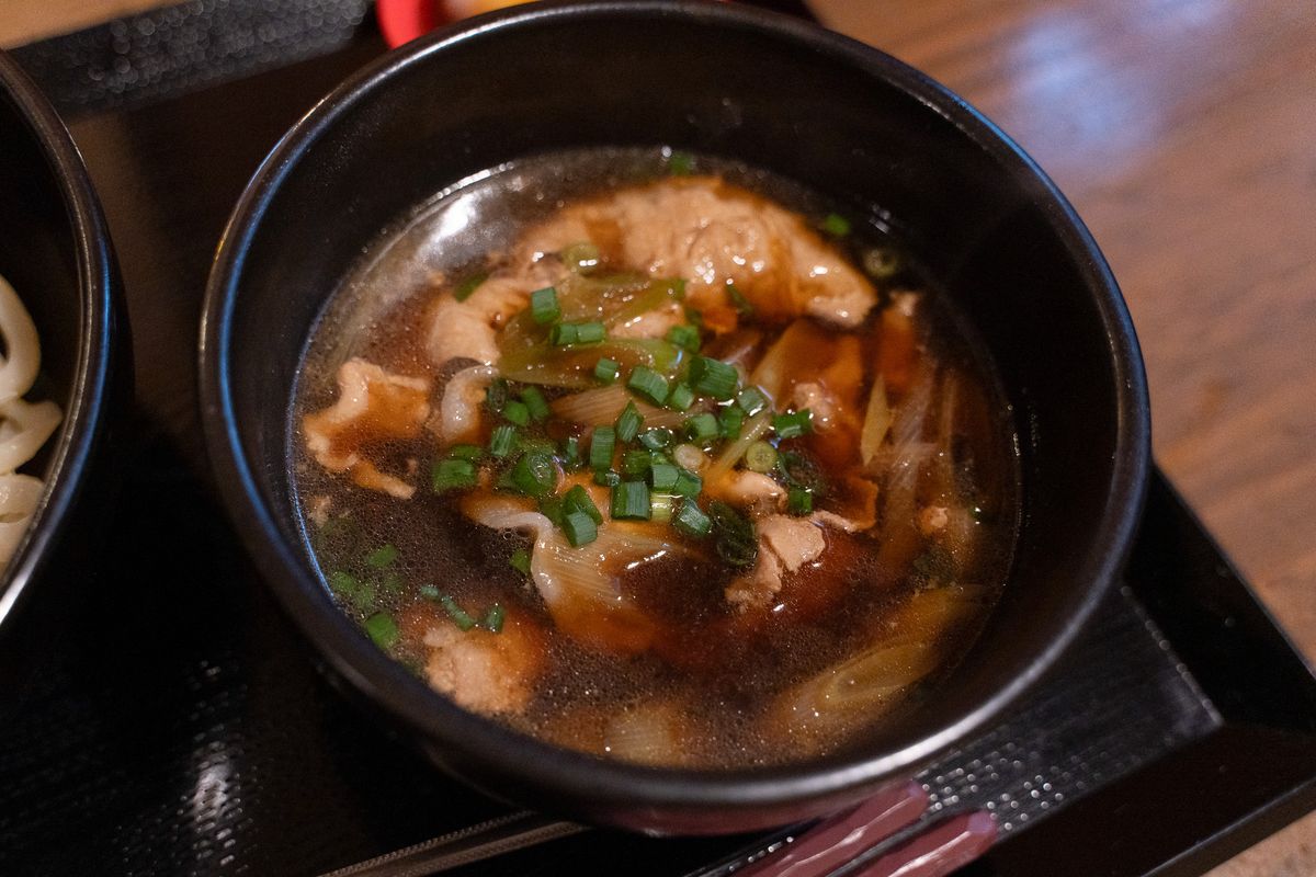 人気の「あぐー肉汁つけうどん」は、しょうゆベースの濃い味わいが特徴の関東風つけ汁で。一方、「あぐーかけうどん」は、あっさりとした出汁が楽しめる関西風。どちらも味の染みた柔らかなあぐー豚がたっぷりのり、食べ応えは抜群です。好みや気分に合わせて出汁を選べるのも、通いたくなる理由のひとつ。