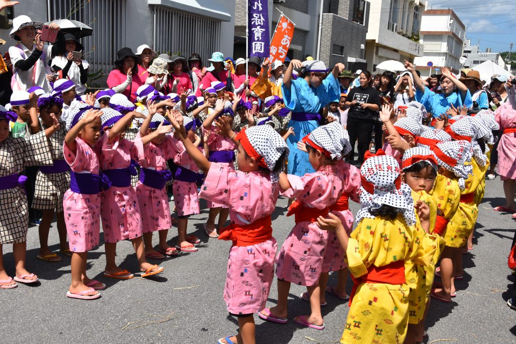 見どころは、午前中(10時~11時半頃)に中央通りにいくと、ちびっこたちが「道ジュネー」(こども用旗頭、金鼓隊きんこたい、前舞いメーモーイ)を行いますよ。元気よく踊って、綱武士(ちなむし)たちを「頑張って!!」と励ましてくれるんです。とても可愛く、大人顔負けの道ジュネーです。