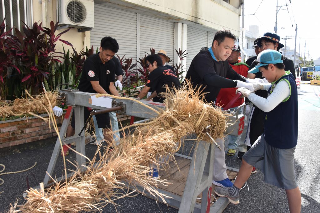 与那原大綱曳は毎年、5t・90メートルの大綱を、朝8時30頃からみんなの力で夜遅くまでかけてつくり上げます。