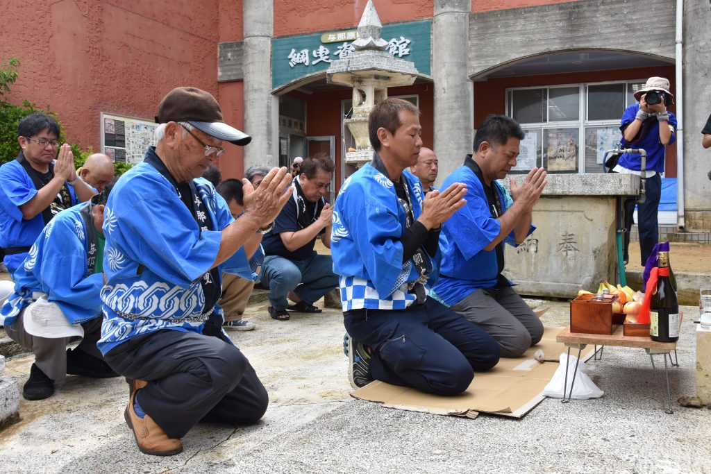 10時になると安全祈願をします。大綱曳は勝ち負けよりも安全第一。怪我無く楽しく進行できるよう、大綱曳実行委員長をはじめ各大綱の係長や町長たちも一緒に拝みをします。