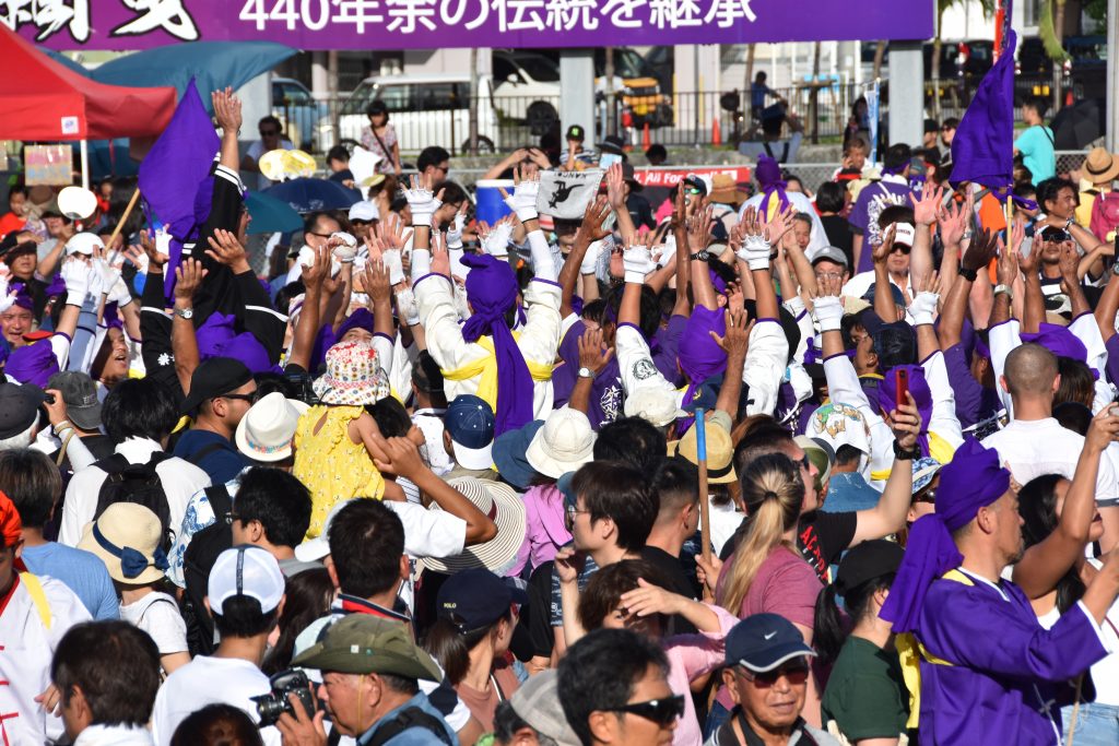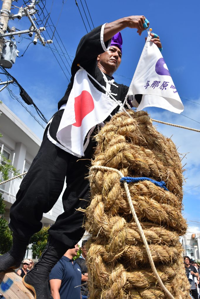 勝ち名乗りをあげて東(あがり)の旗頭が舞い、その後お互いにすり合わせて慰労し合います。与那原大綱曳は「曳きちゅらさ、勝ちちゅらさ、負きちゅらさ」と伝えられていて、「勝っても負けてもわきあいあい」なのです。