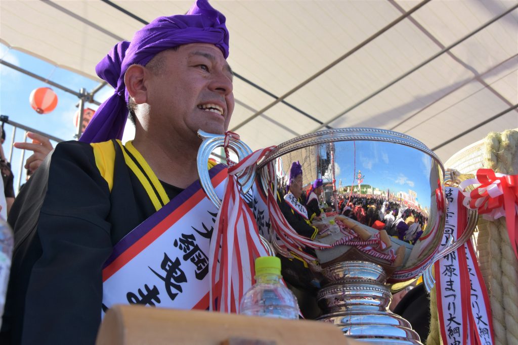本来は2回戦あるのですが、今年は大綱が切れるハプニングがあったため、1回戦で終了。綱武士(ちなむし)たちは会場から、親川(綱曳資料館)に戻って慰労会をします。