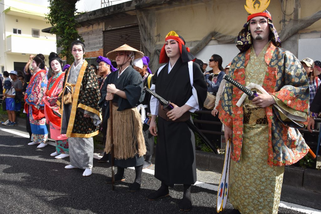 このガーエーで、初めて姿を現すのが琉球の歴史上の人物に扮した「支度」のみなさんです。第37回の支度の演目は、与那原町制70周年を記念して地名のついた「よなばるの浜」と「奥山の牡丹」。