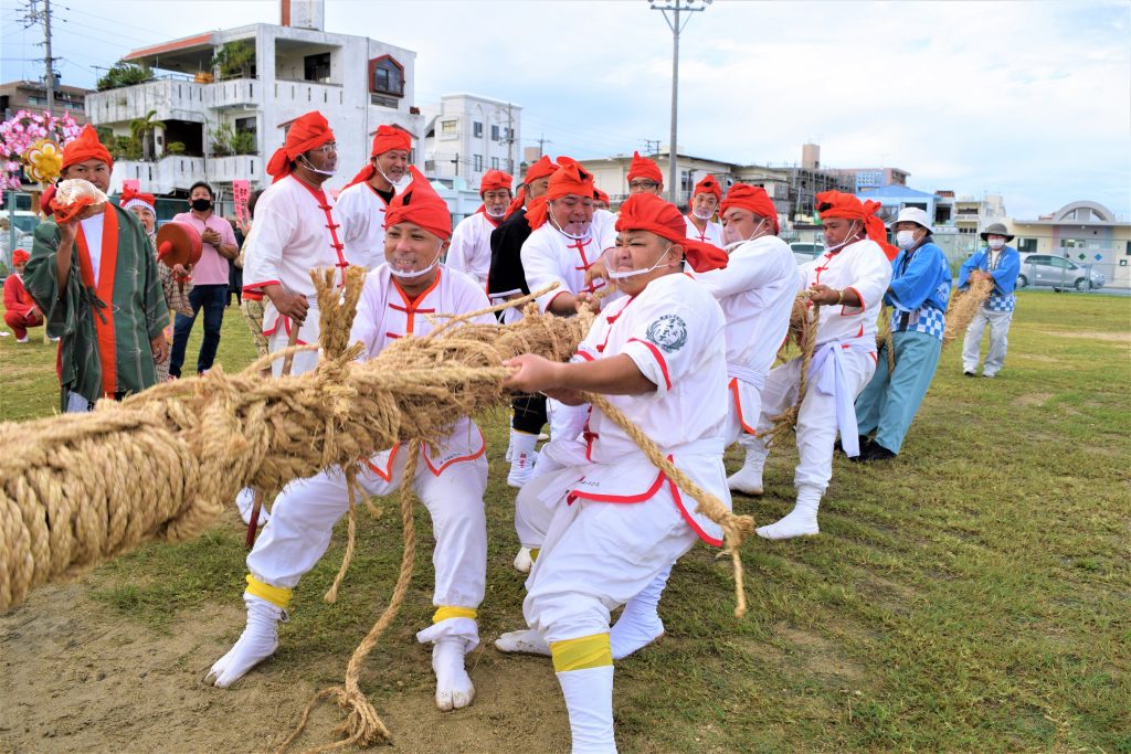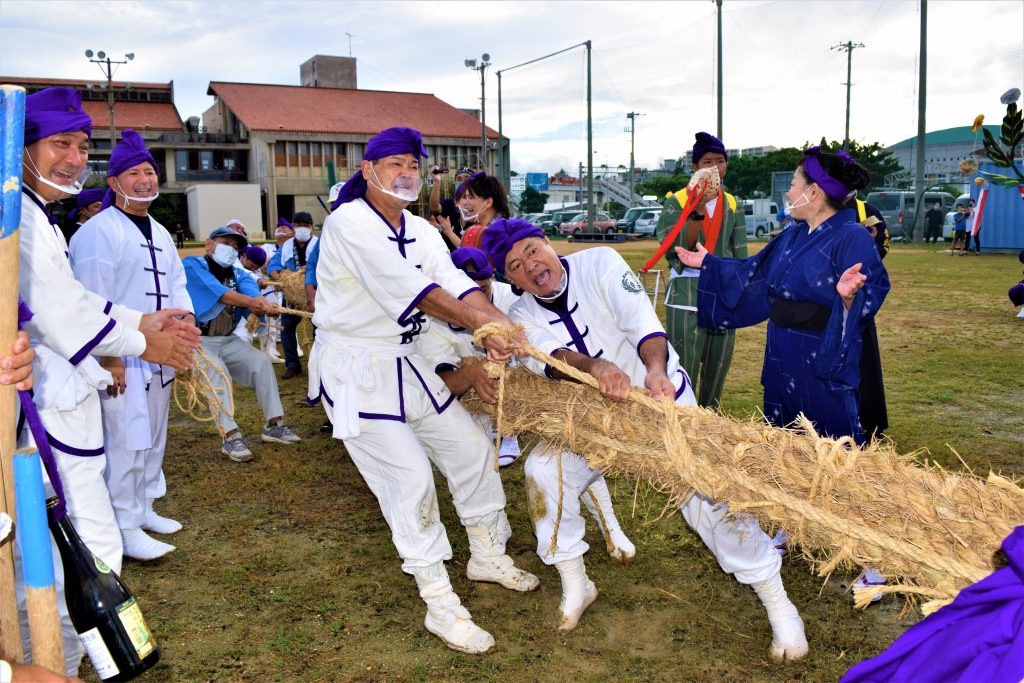 今年の「与那原大綱曳まつり」は新型コロナウイルスの影響で、残念ながら中止となりましたが、9月20日(日)に関係者にて規模を大幅に縮小し、五穀豊穣とコロナウイルスの収束を祈願し「神事の大綱曳」を行いました。綱も20メートルと例年より短いサイズでしたが、「カナチ棒」で東西の綱と綱がつながると約2分強の熱戦が繰り広げられました。結果、東が勝利しましたが、東西共、440年以上の歴史と伝統の大綱曳が規模縮小でしたが、神事として開催できた喜びを分かち合っていました。来年は、多くの人が参加できる「与那原大綱曳まつり」にて皆様とお会いできることを楽しみにしたいと思います。