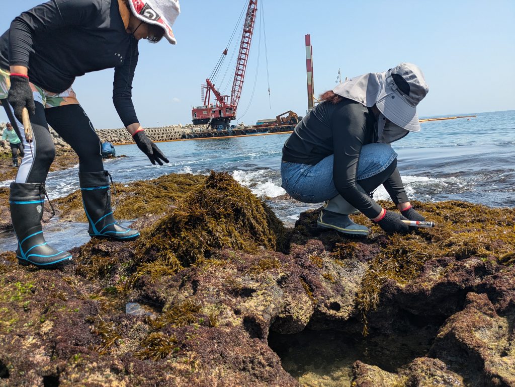 カマで岩に生えたヒジキを収穫していきます。