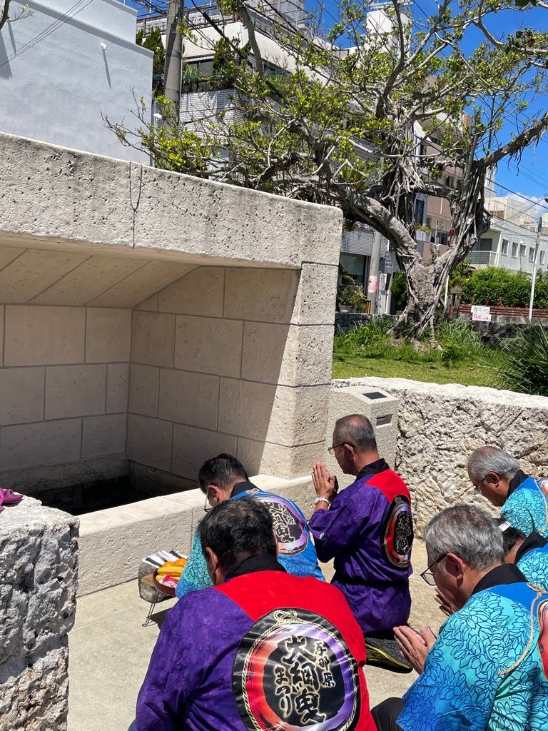 まずは実行委員会と運営委員会役員が親川(うぇーがー)拝所にて神酒を供え、まつりの無事と成功を祈願。