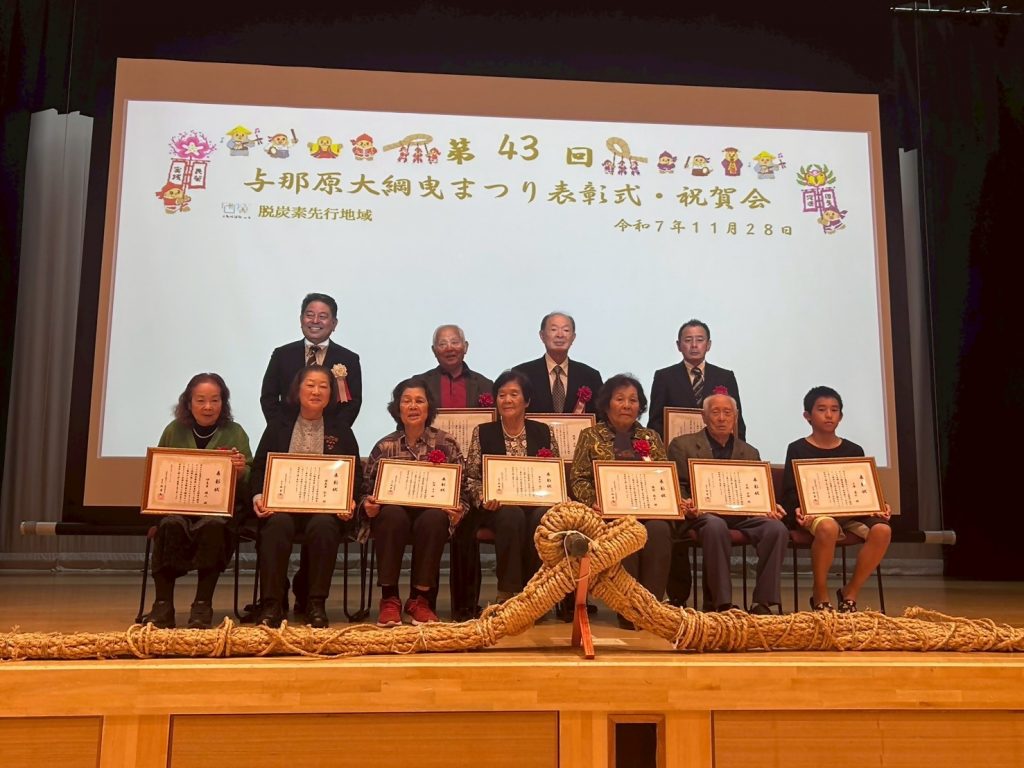 与那原大綱曳まつりの表彰は、地域の誇る伝統行事を未来へ繋ぐため、長年にわたって支えてきた方々を感謝の意を表するものです。