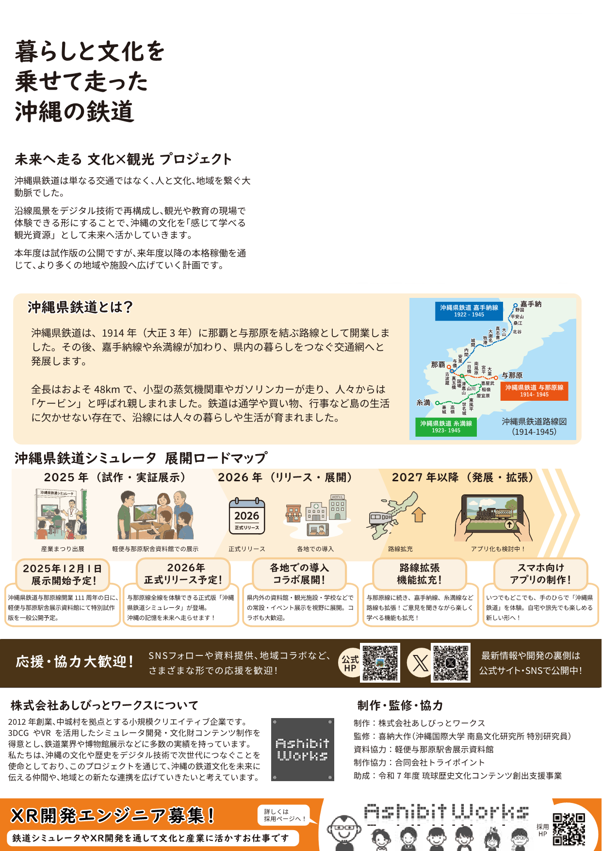 このシミュレーターは、中城村の株式会社あしびっとワークスが、沖縄県の「令和7年度琉球歴史文化コンテンツ創出支援事業」を活用して企画・制作。与那原町立軽便与那原駅舎展示資料館が展示場所を提供するという官民連携で実現しました。