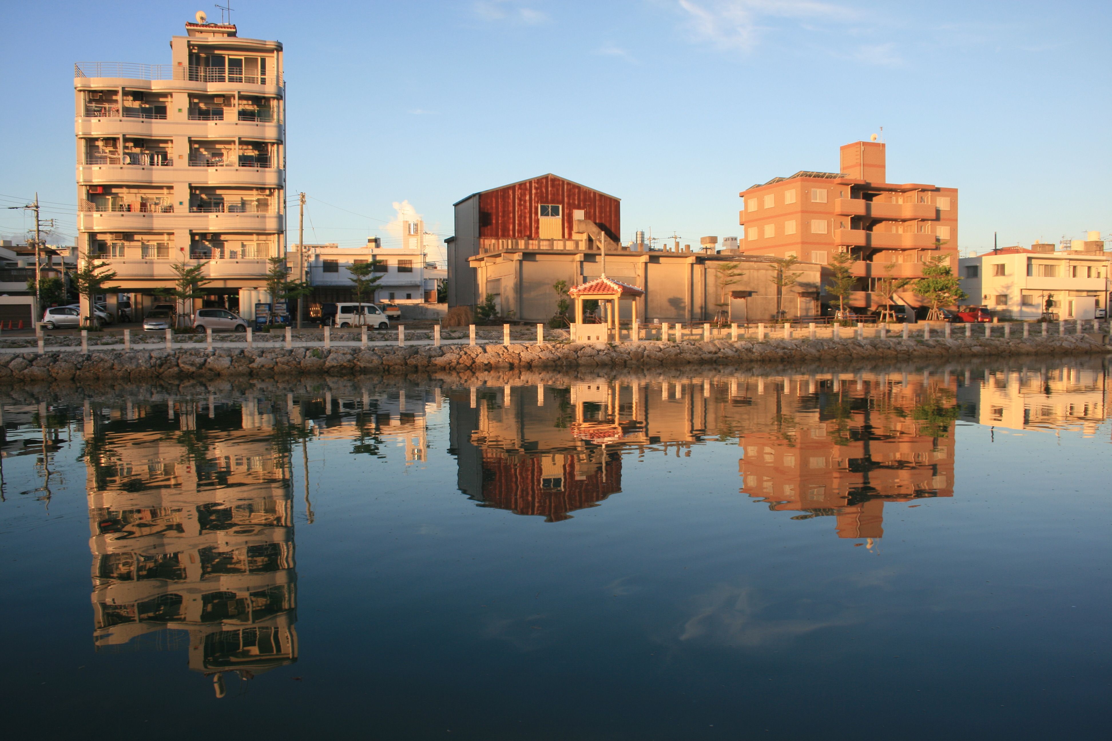 東浜を取り巻いている水路には、時々刻々様々な表情が現われ見る人を楽しませてくれます。 特に、朝凪、夕凪などの無風状態と満潮時が重なったとき、水面は鏡になり、別世界のような風景が現われます。 普段は何の変哲もないマンションや倉庫、工場さえもが、水辺の素敵なオブジェに変化し、見る人を魅了します。