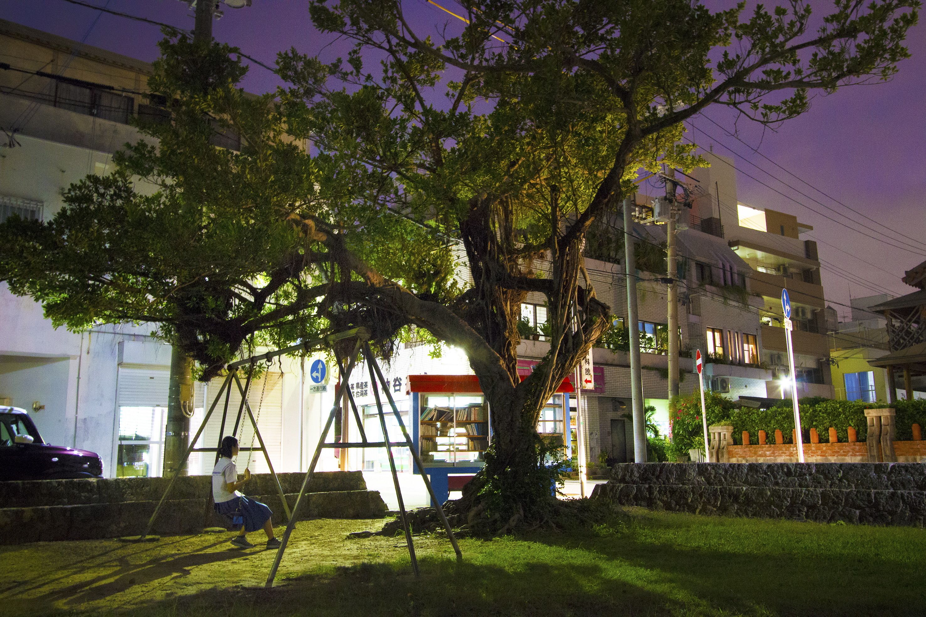 与那原町を散歩していた時にブランコを見つけ、暗い中三脚を立てて撮りました。