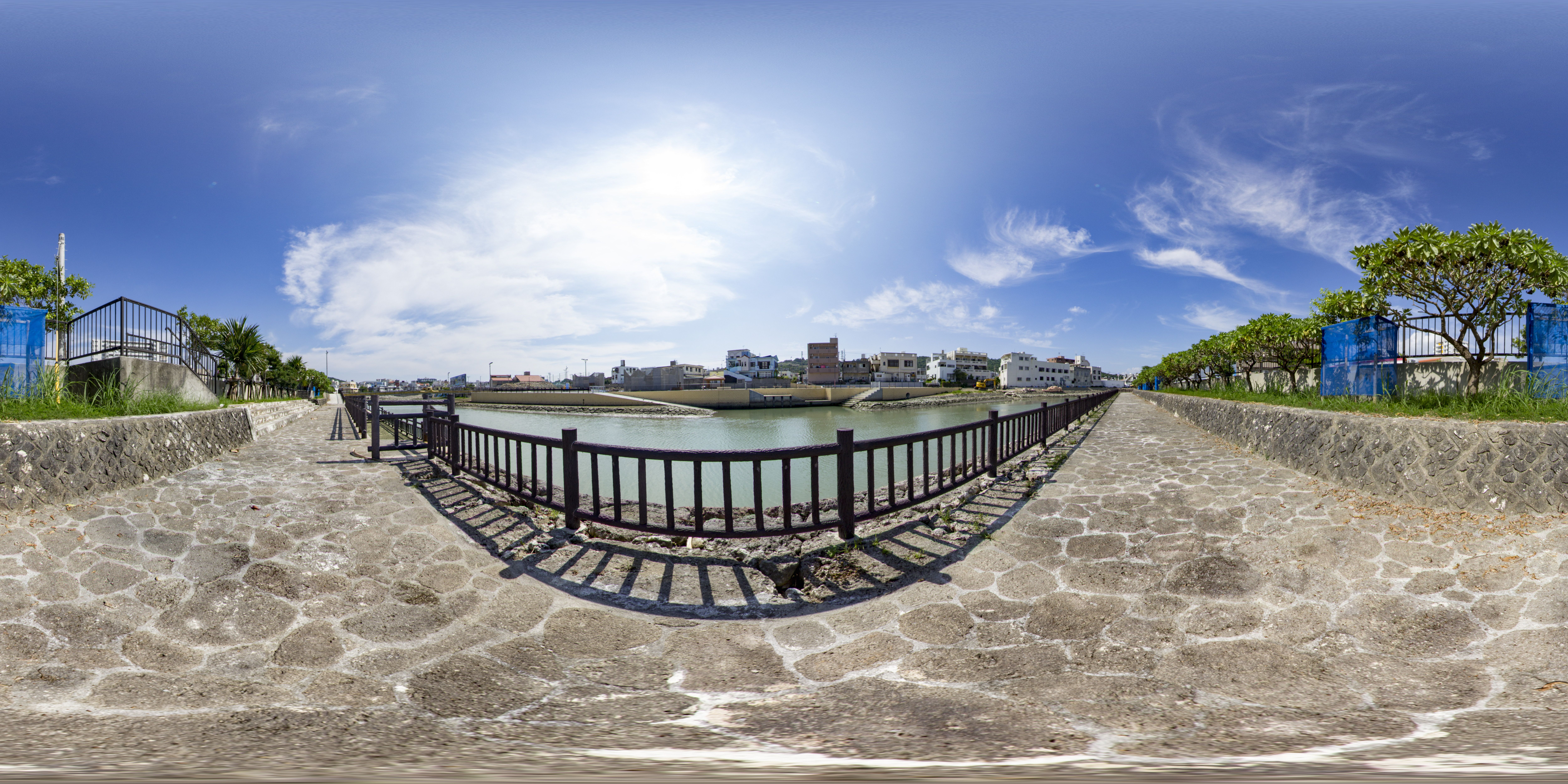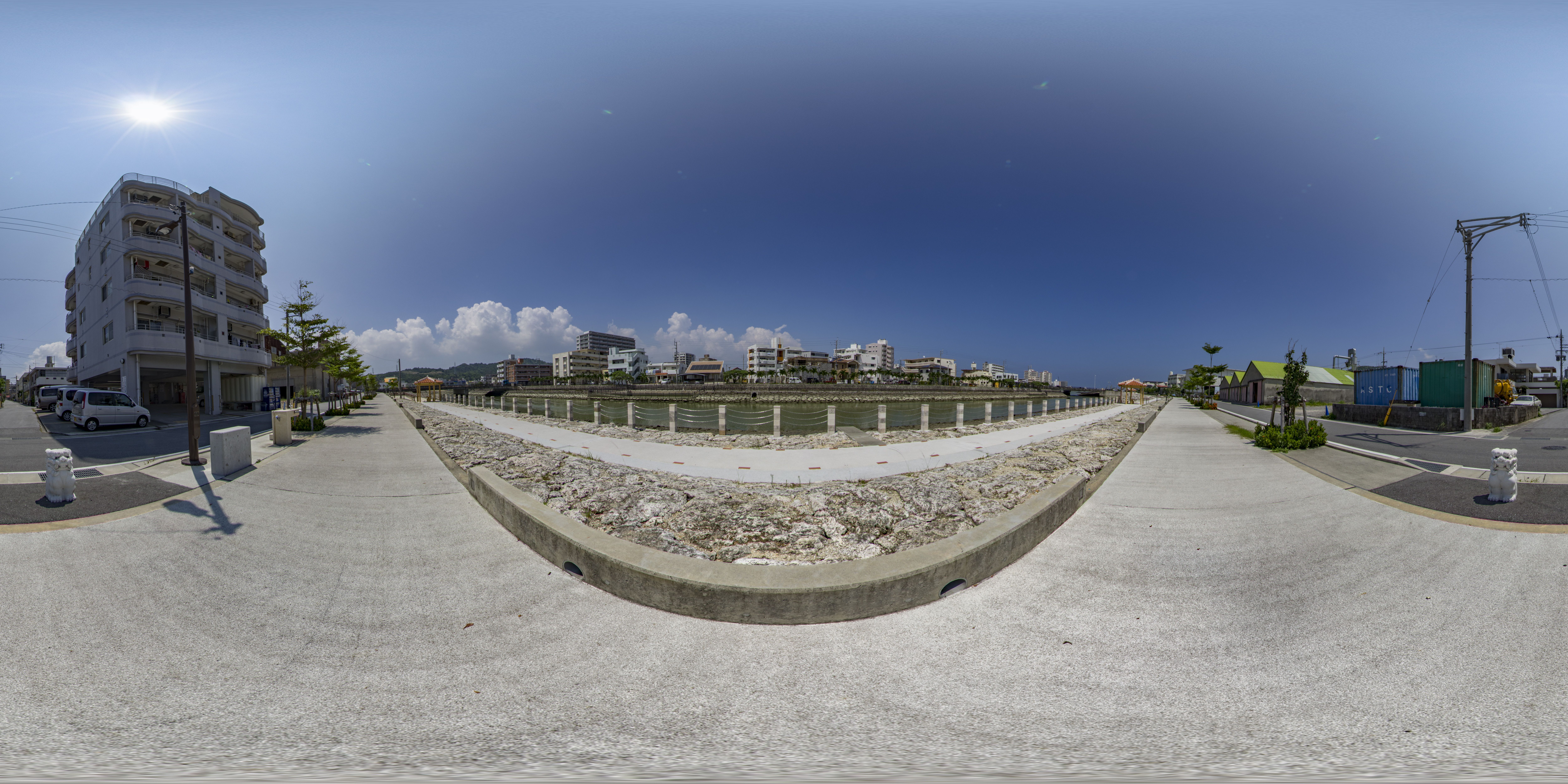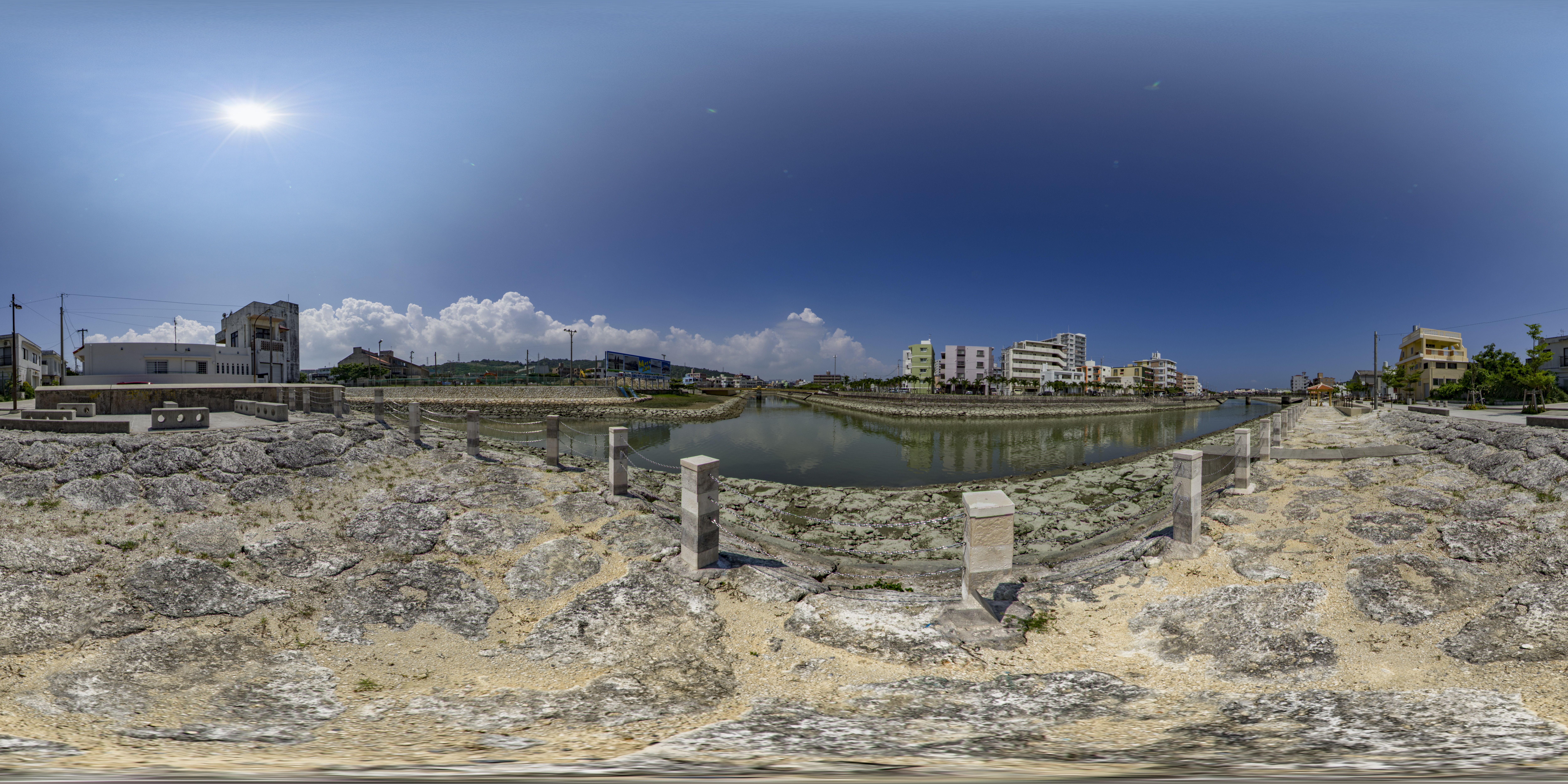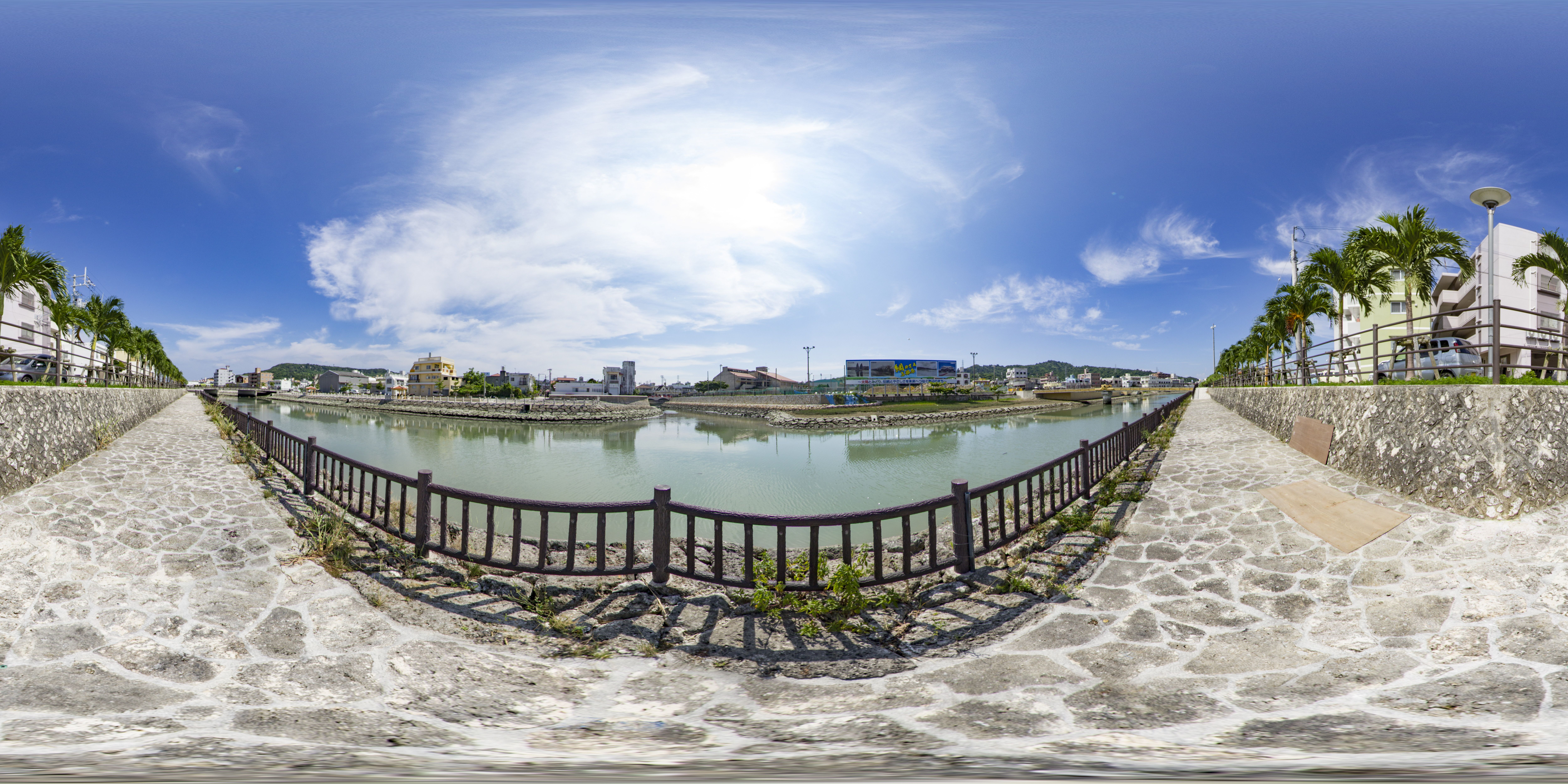 与那原町には東浜地区を取り囲む大きな水路があります。水路脇の遊歩道は散歩に適しており、東屋で休憩することもできます。釣りなども楽しまれ、地域の憩いの場所となっています。(equirectangular形式の360度パノラマ画像を提供しています。)