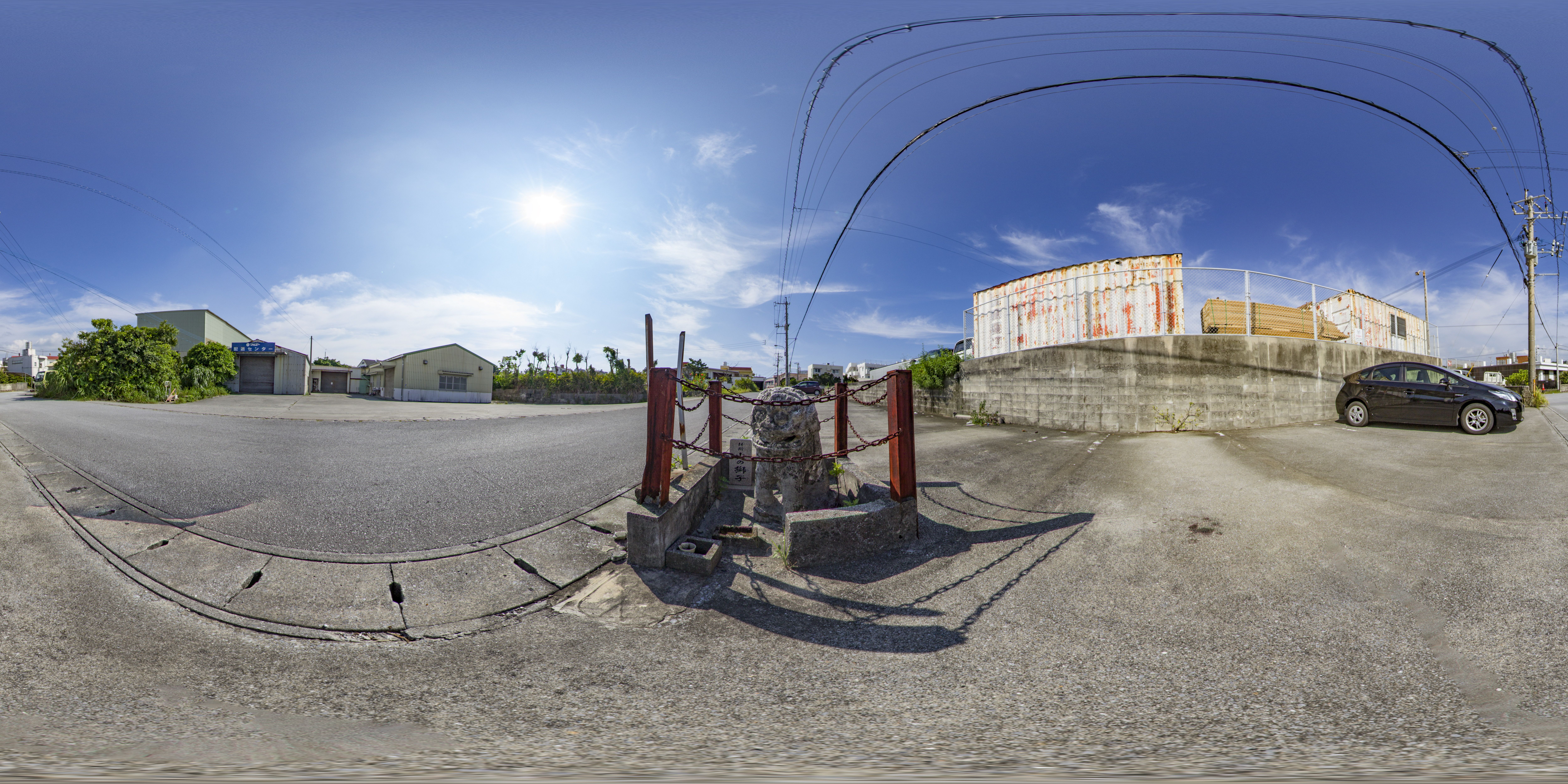 集落内に設置された石獅子は村落獅子とも呼ばれ、沖縄県内の地域でいくつか見られます。石獅子はフーチゲーシ(邪鬼返し)やヒーゲーシ(火返し)などの厄除けとして置かれていると考えられています。与那原町内には7体あり地域を見守っています。(equirectangular形式の360度パノラマ画像を提供しています。)