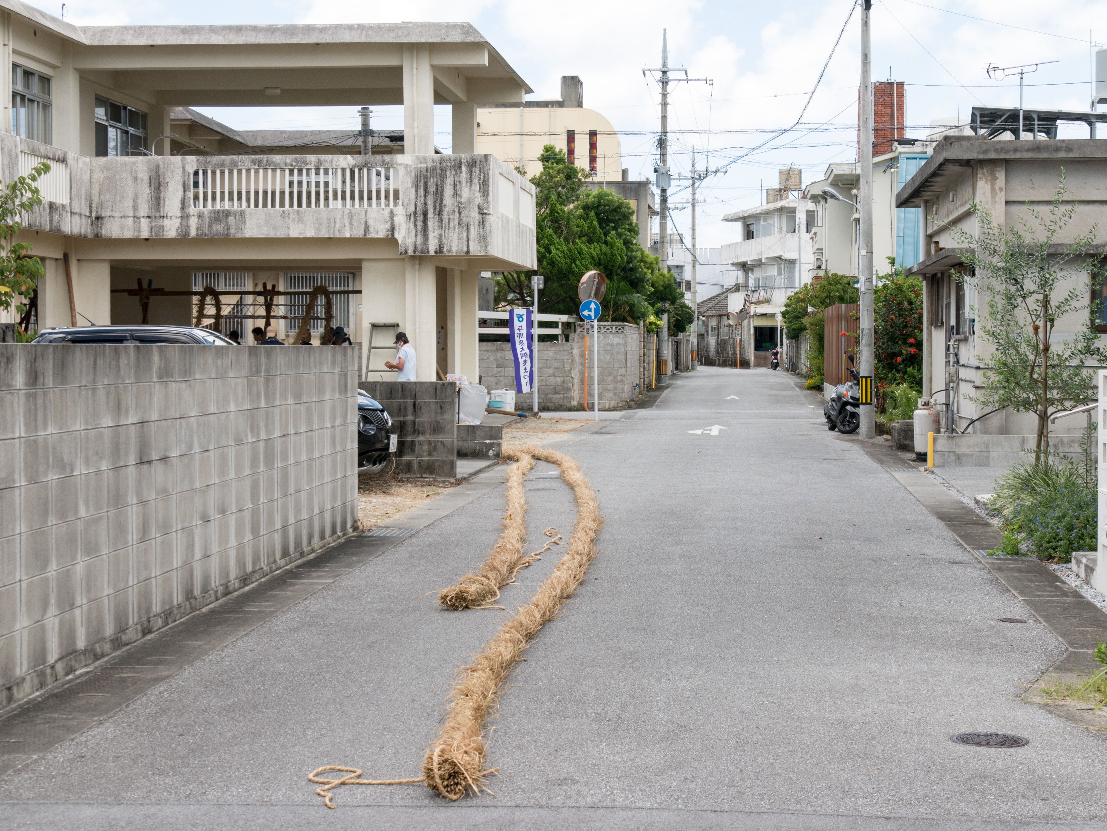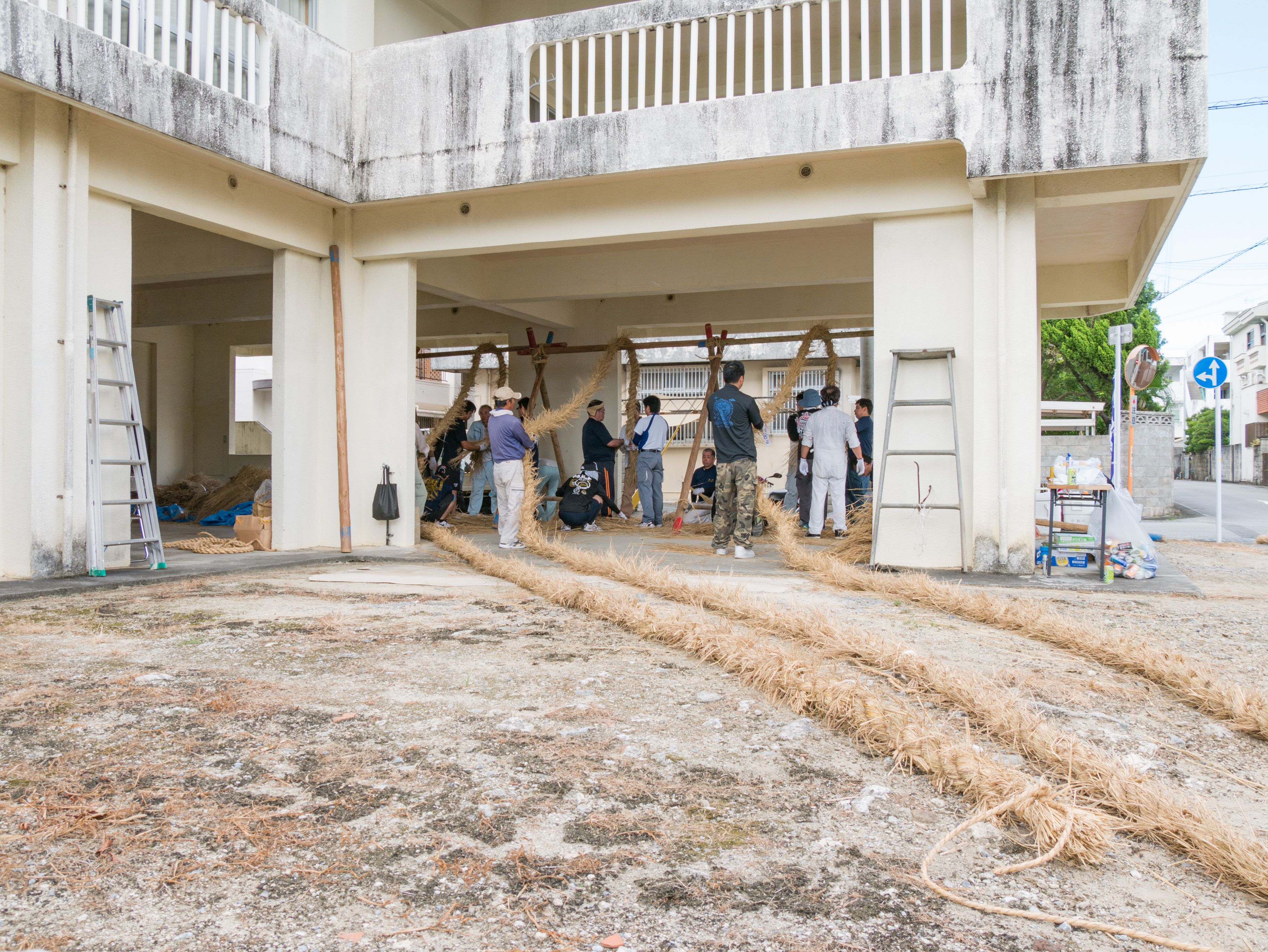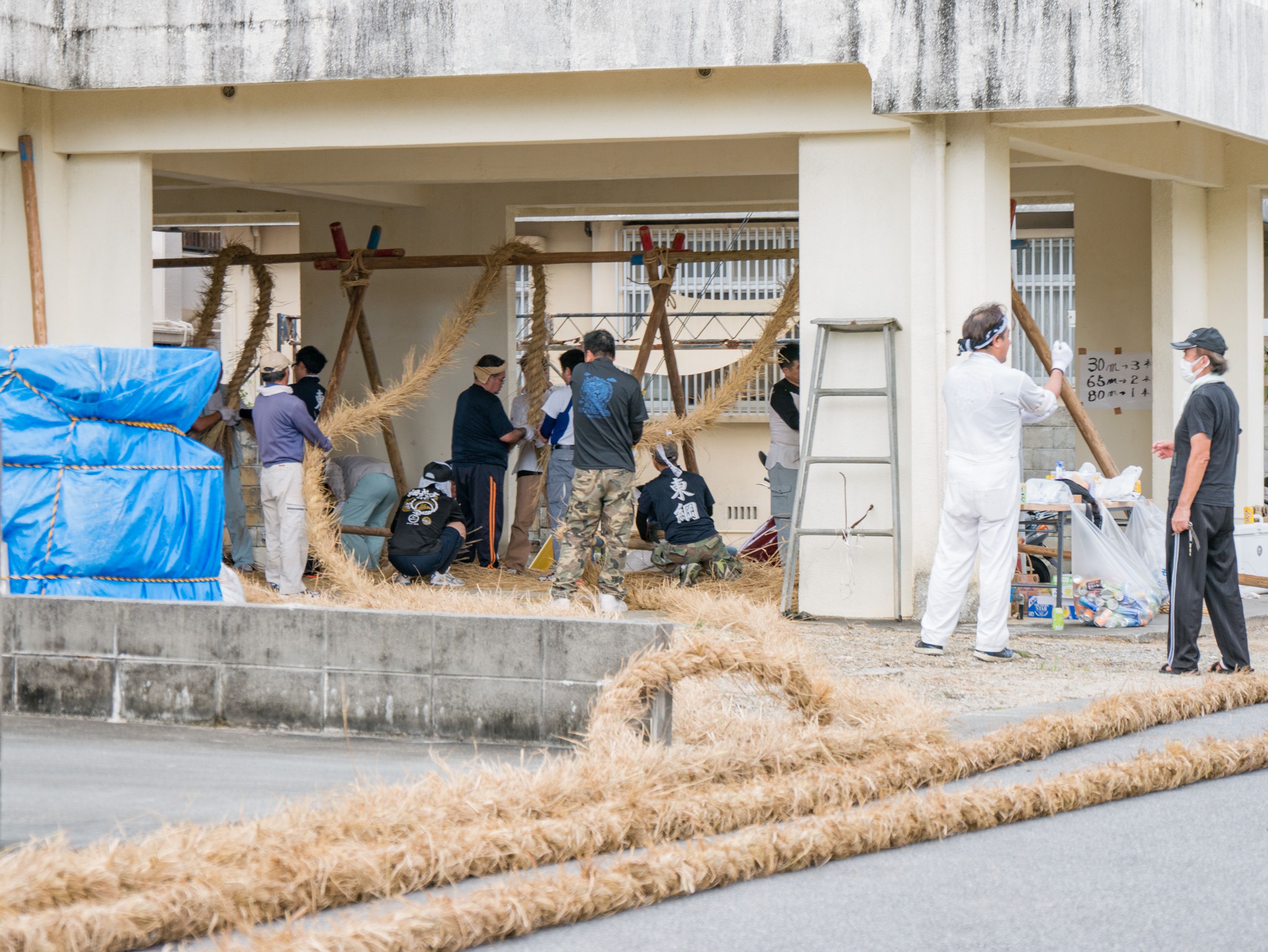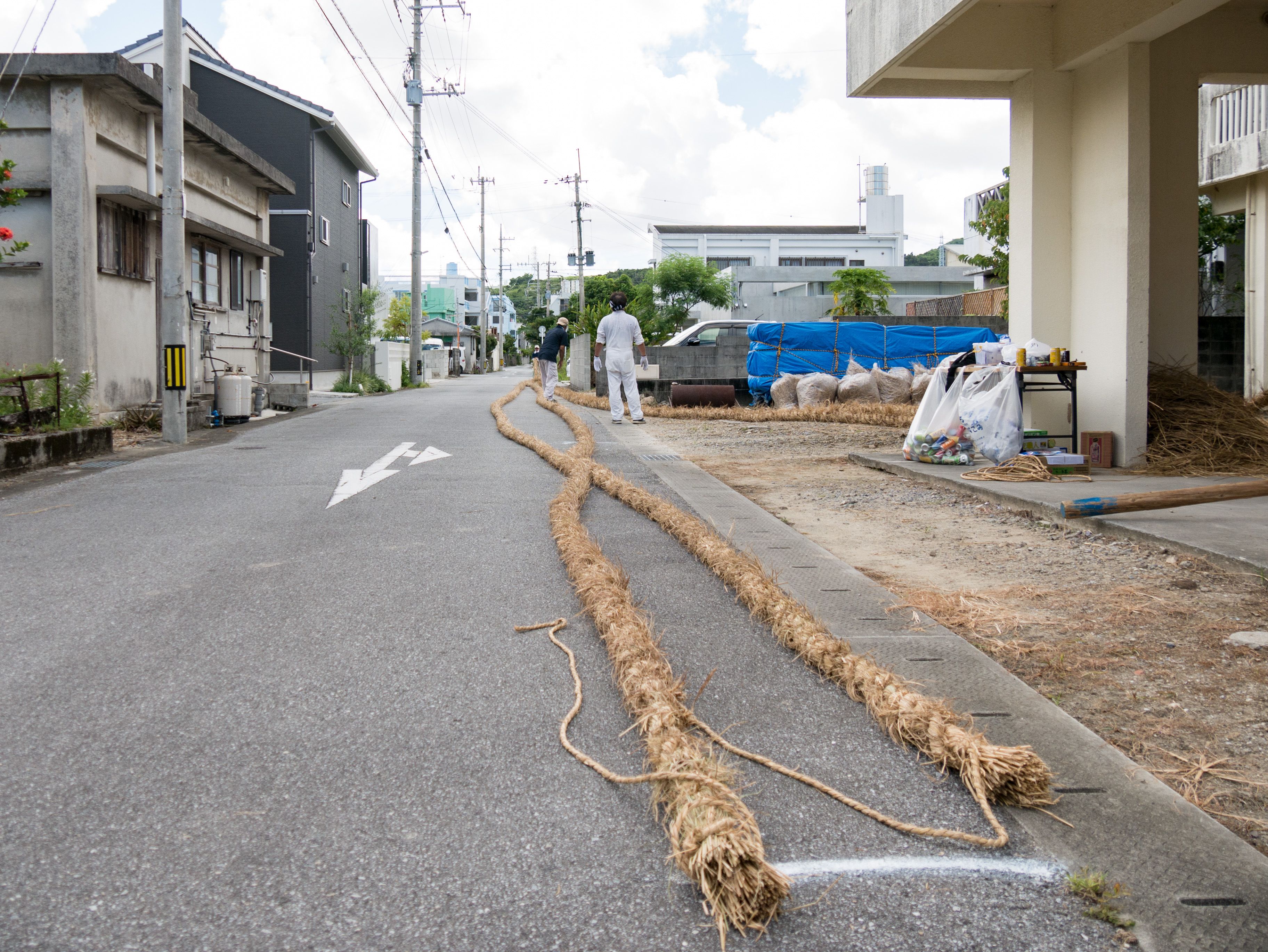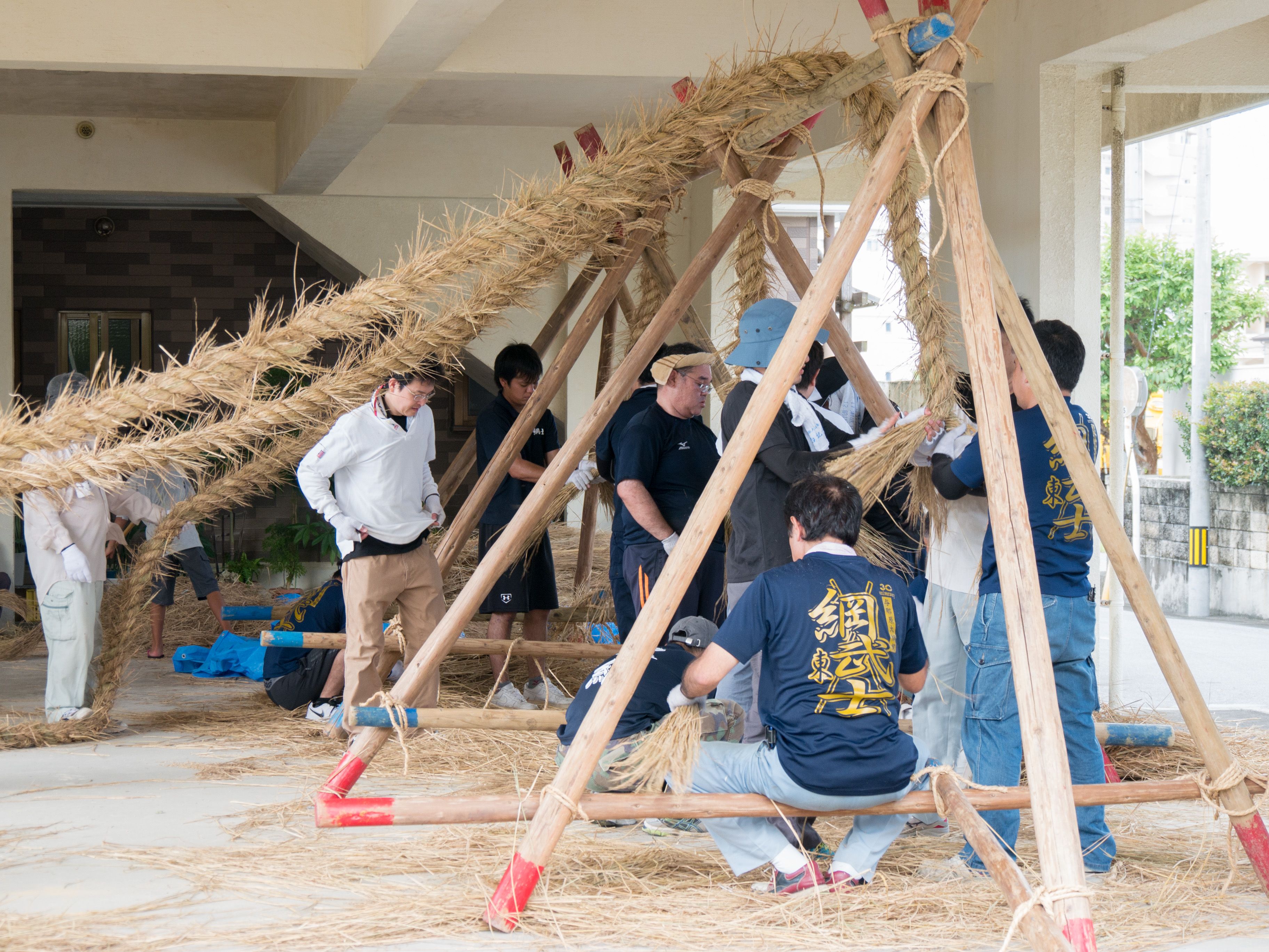 与那原大綱曳で使われる本綱は長さ約90メートル、重量5トンで雄綱(東)と雌綱(西)に分かれており、毎年新しく作られます。本綱の元になる綱は町内12区の分担で作られており、藁の束から細い綱を作り何本もより合わせ太い綱にしていきます。各区が作った綱は大綱曳の前日に本綱として編まれ完成します。各区の割り当て(100m×2本、90m×2本、80m×2本、70m×2本、枝綱35m×4本)