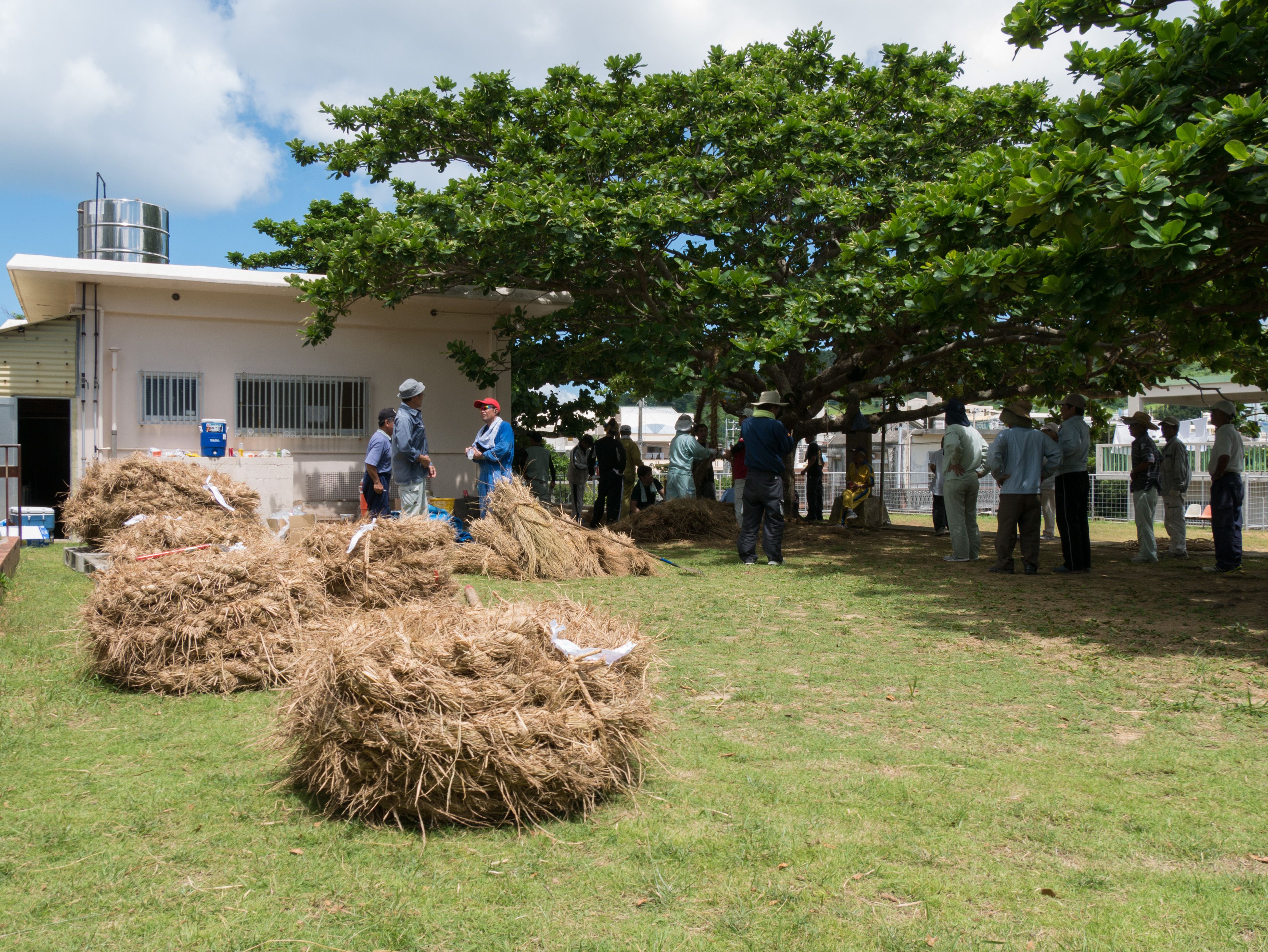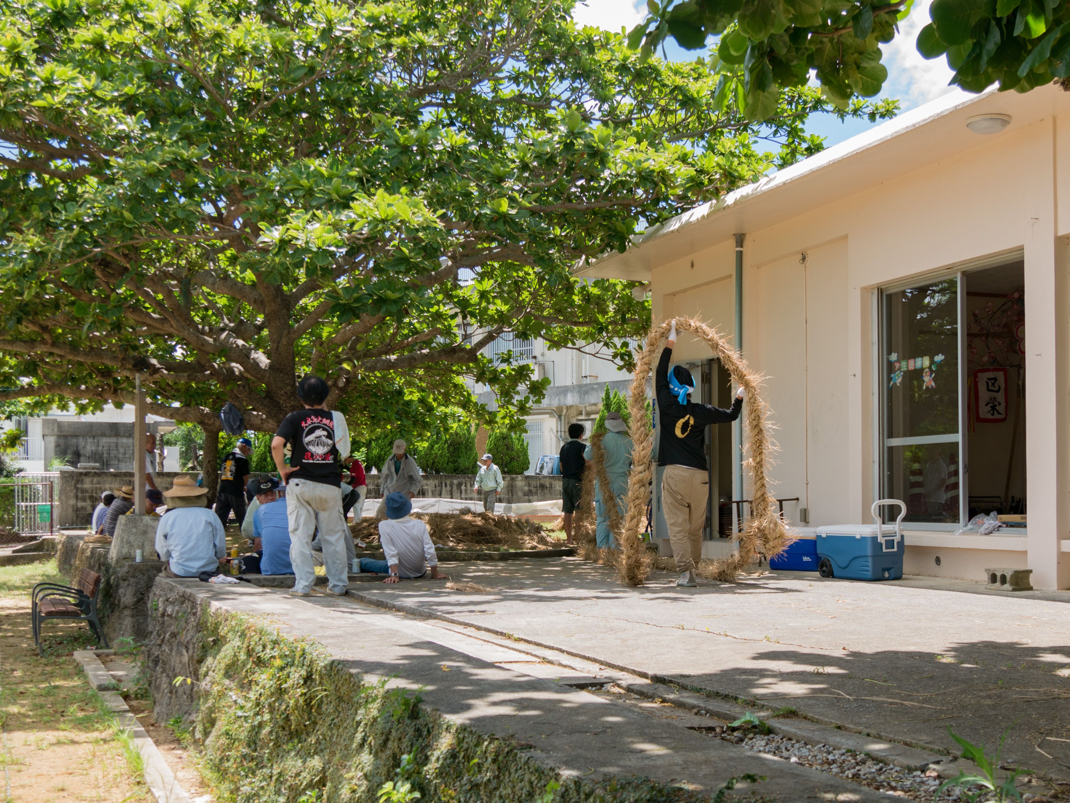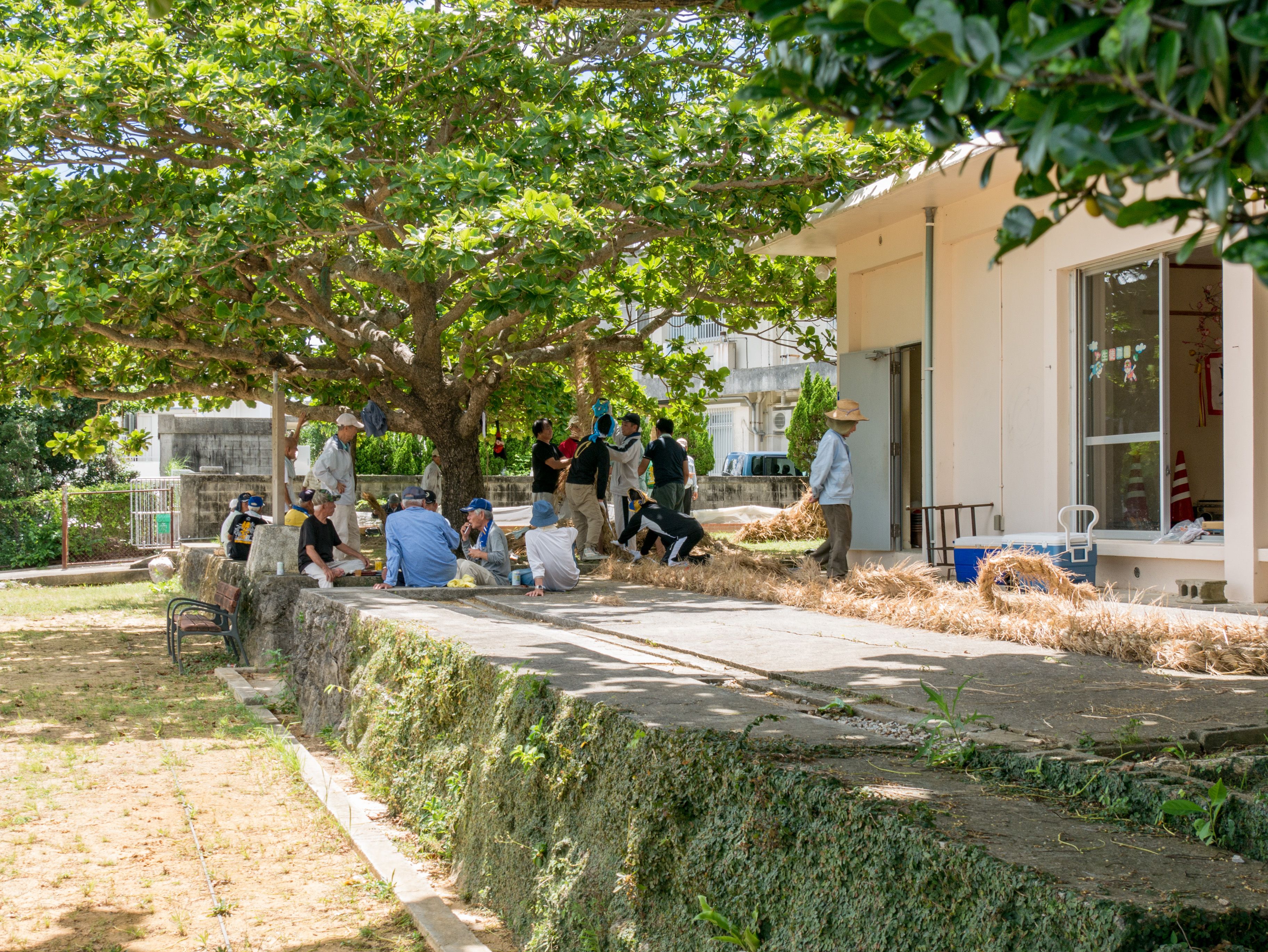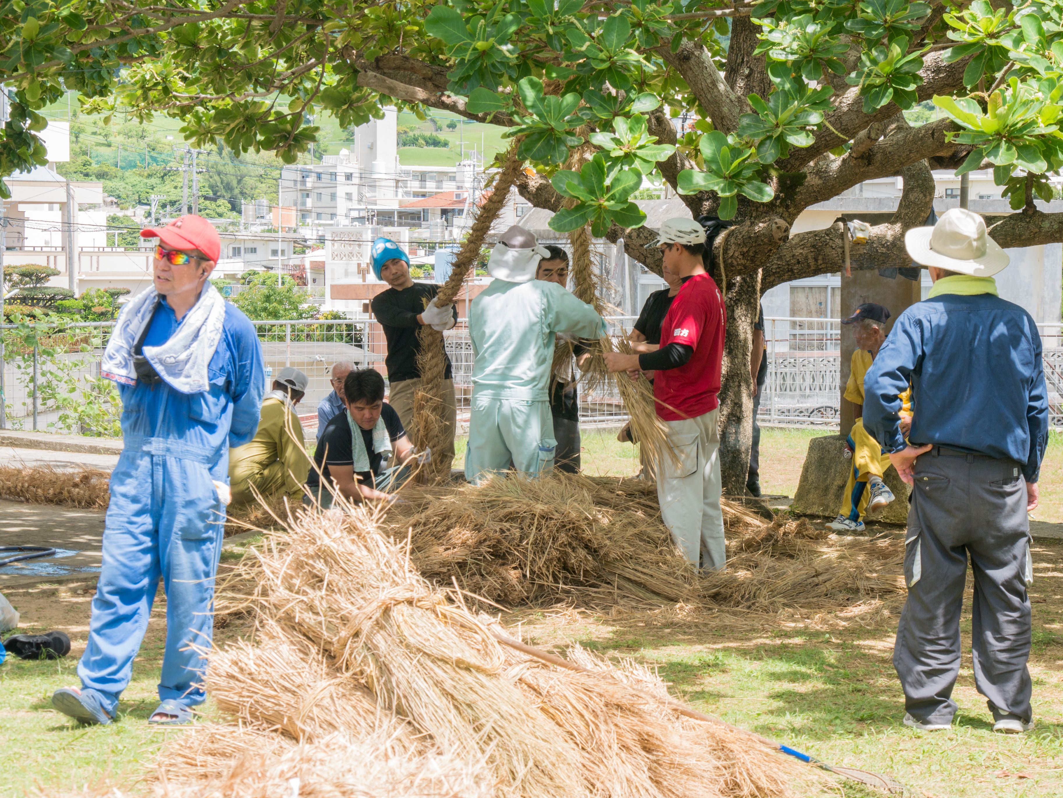 与那原大綱曳で使われる本綱は長さ約90メートル、重量5トンで雄綱(東)と雌綱(西)に分かれており、毎年新しく作られます。本綱の元になる綱は町内12区の分担で作られており、藁の束から細い綱を作り何本もより合わせ太い綱にしていきます。各区が作った綱は大綱曳の前日に本綱として編まれ完成します。各区の割り当て(100m×2本、90m×2本、80m×2本、70m×2本、枝綱35m×4本)