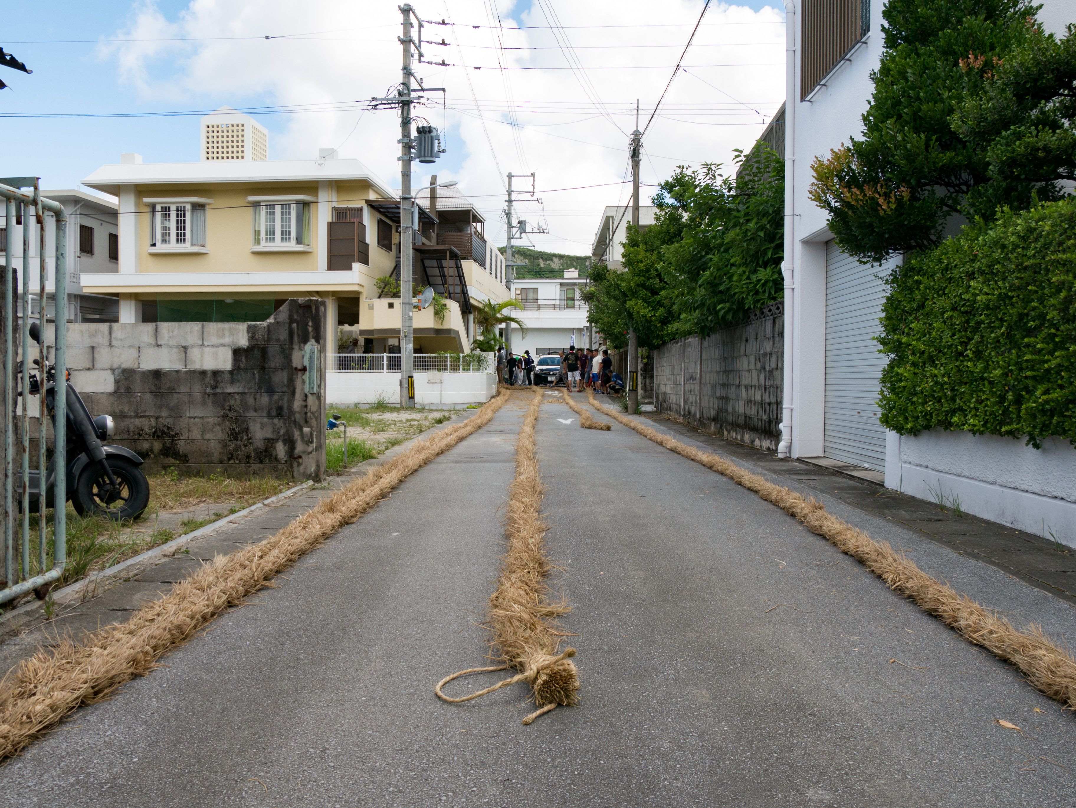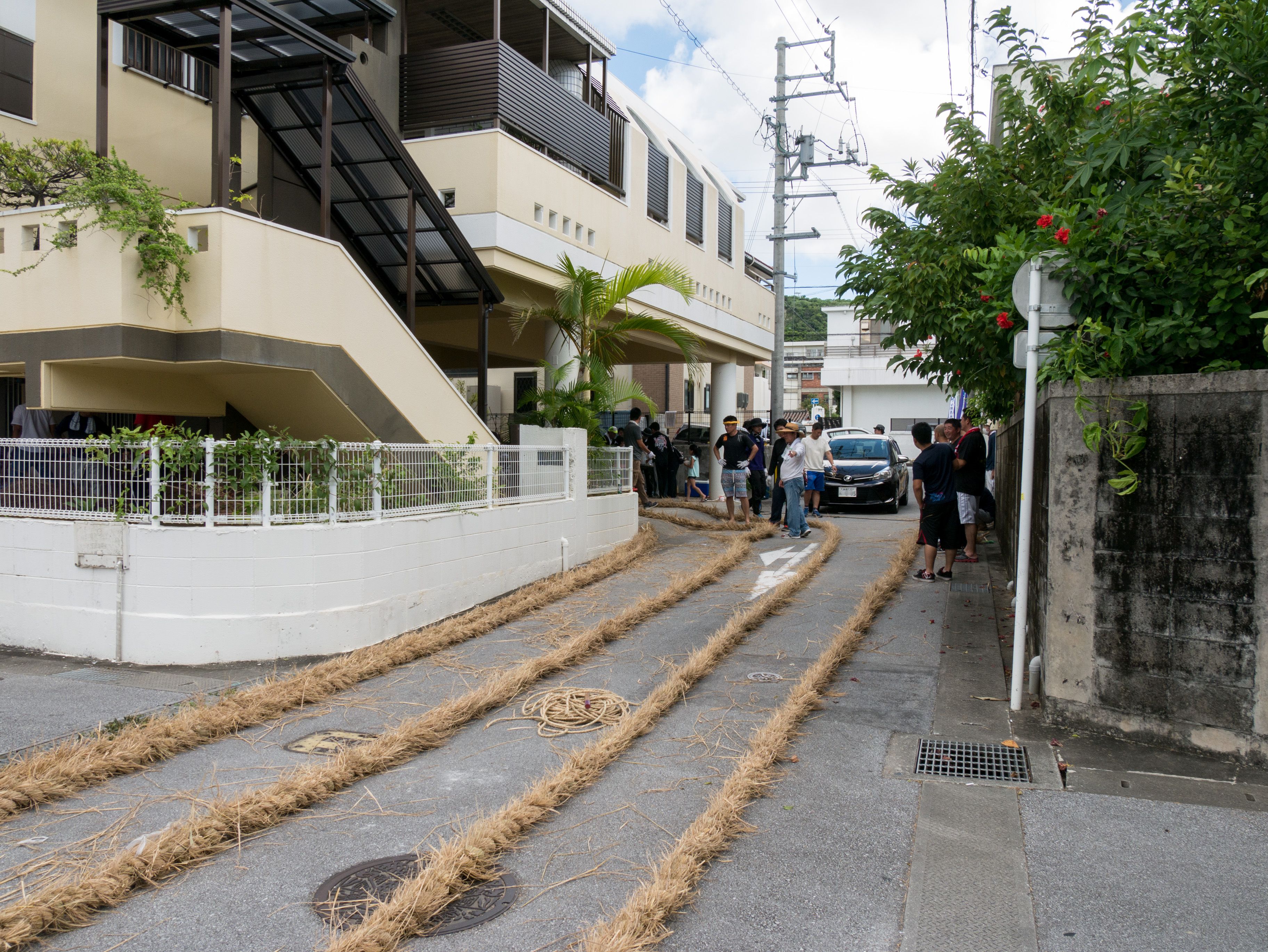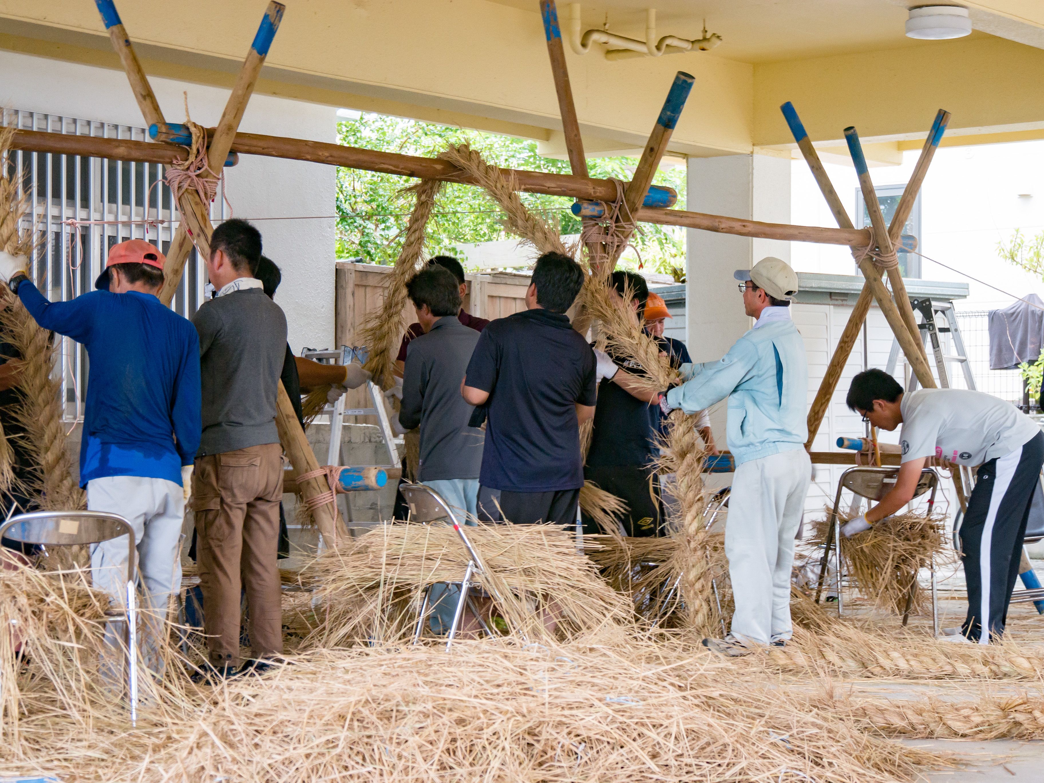 与那原大綱曳で使われる本綱は長さ約90メートル、重量5トンで雄綱(東)と雌綱(西)に分かれており、毎年新しく作られます。本綱の元になる綱は町内12区の分担で作られており、藁の束から細い綱を作り何本もより合わせ太い綱にしていきます。各区が作った綱は大綱曳の前日に本綱として編まれ完成します。各区の割り当て(100m×2本、90m×2本、80m×2本、70m×2本、枝綱35m×4本)