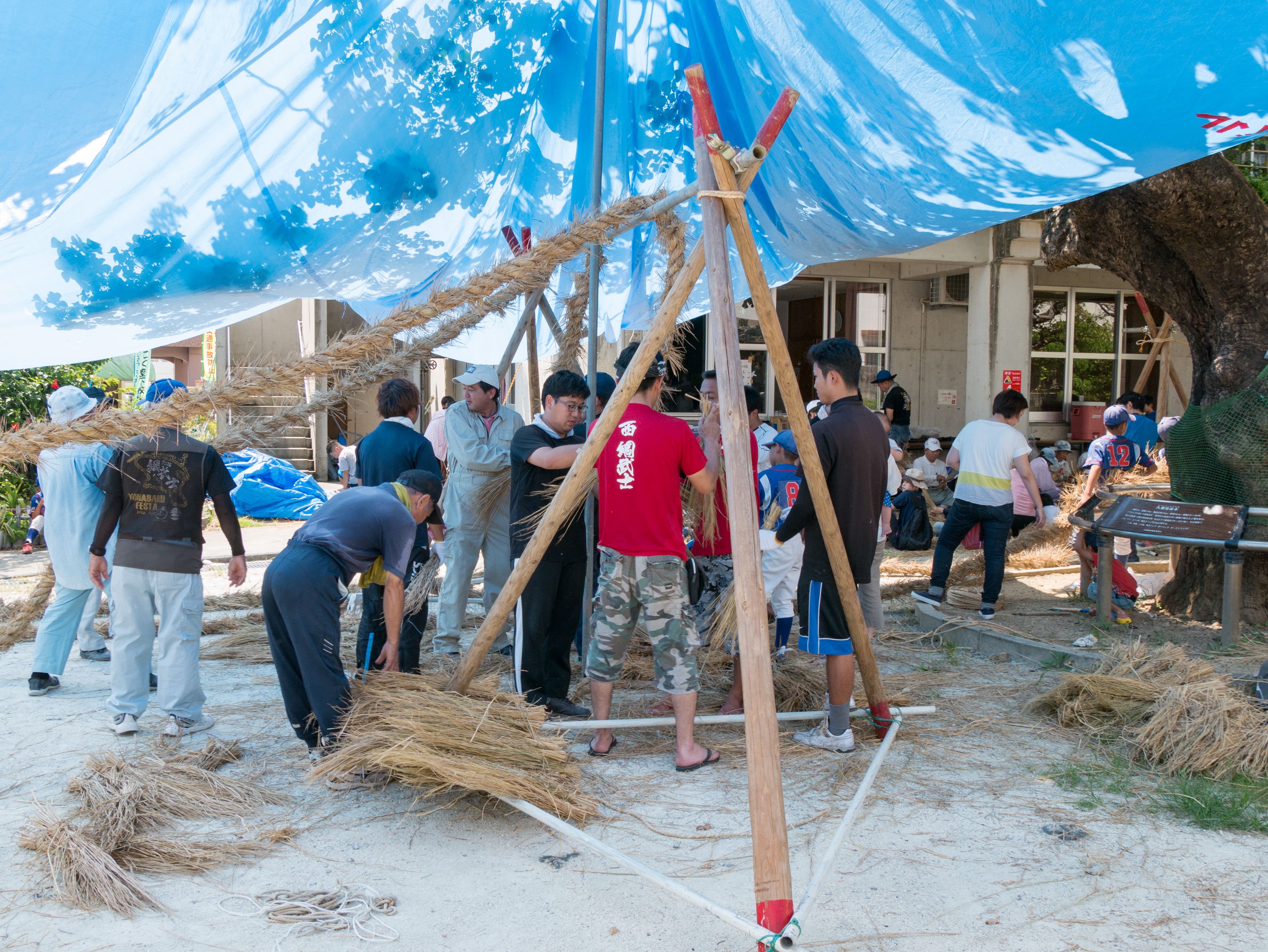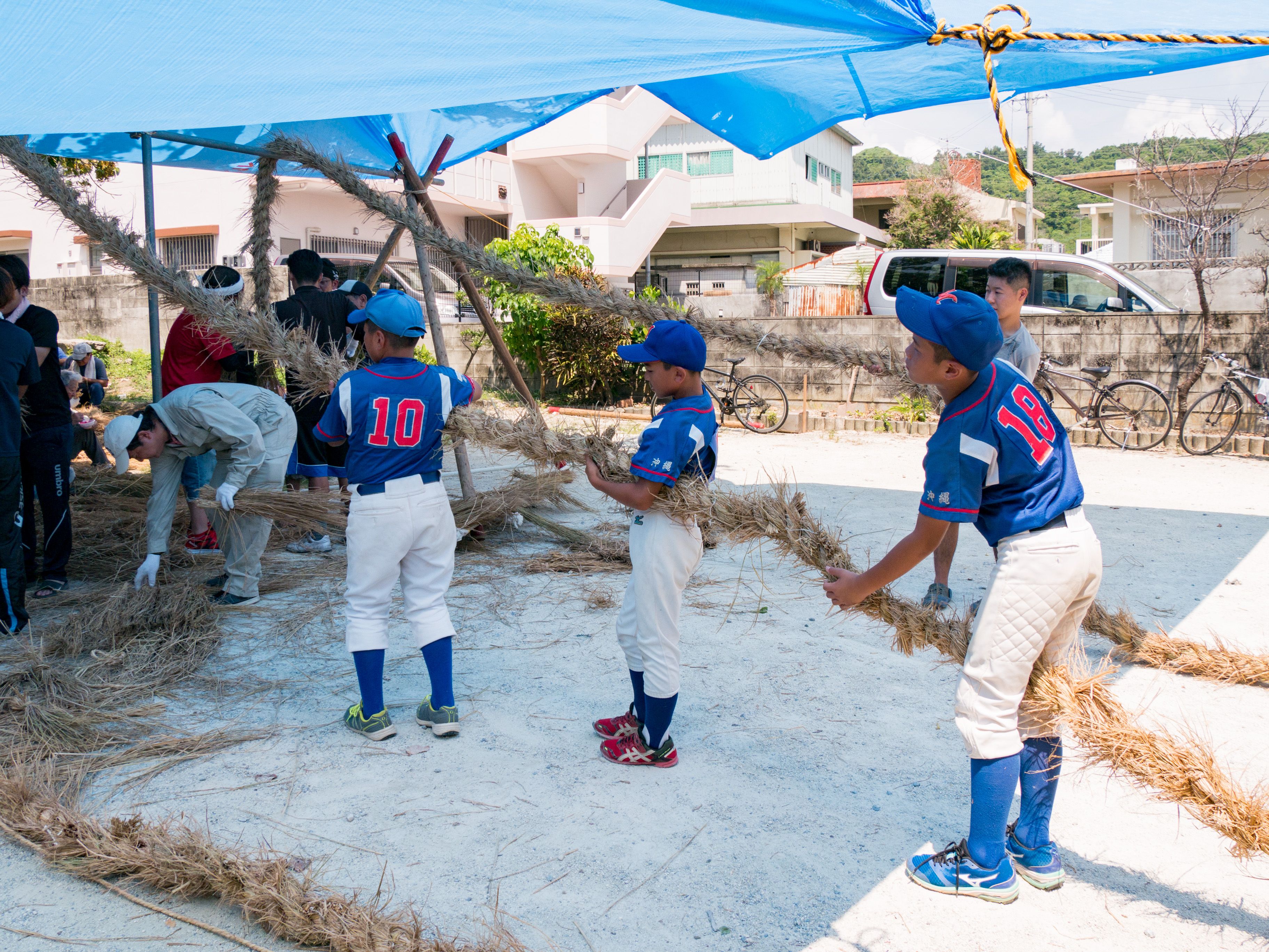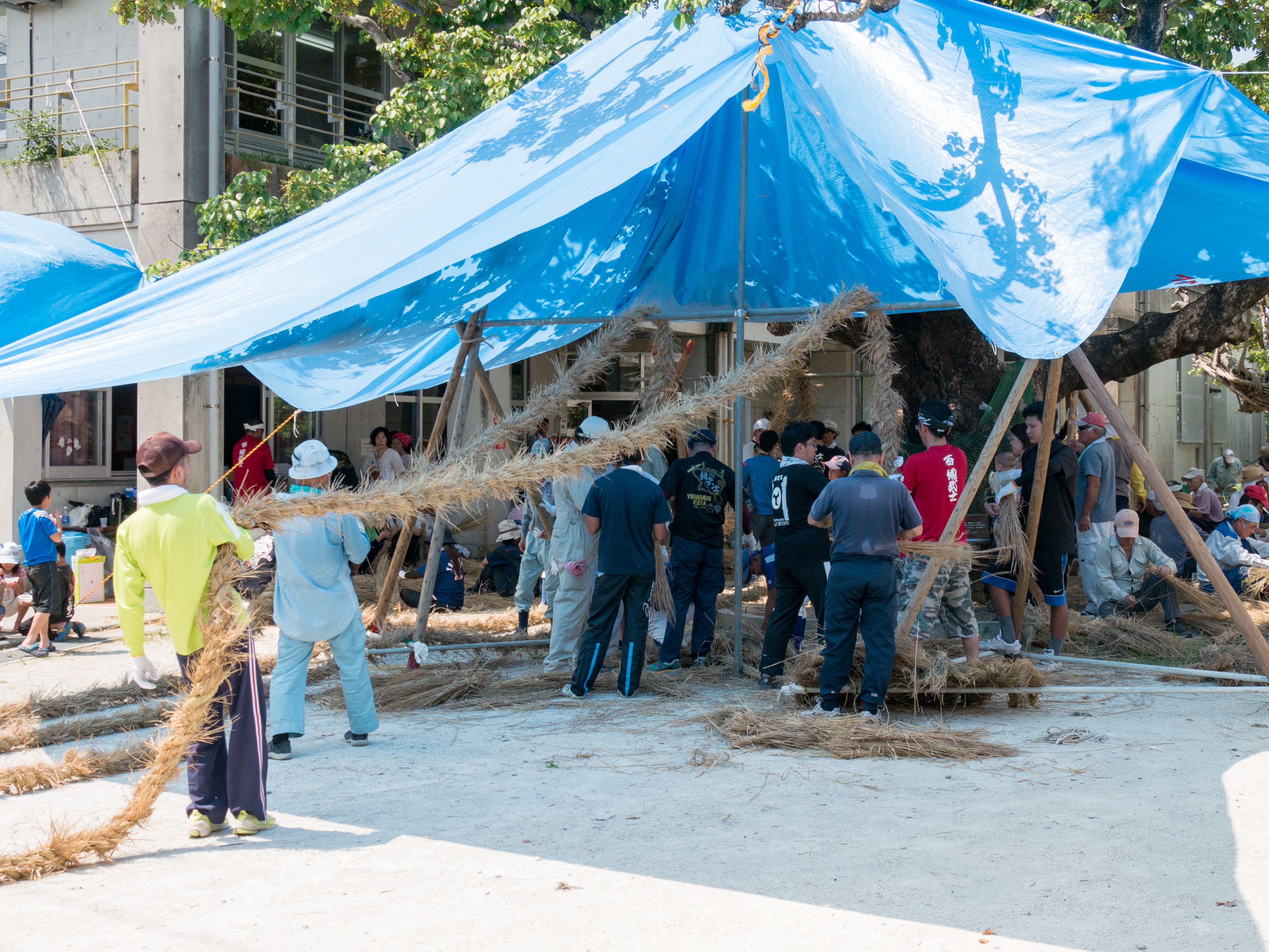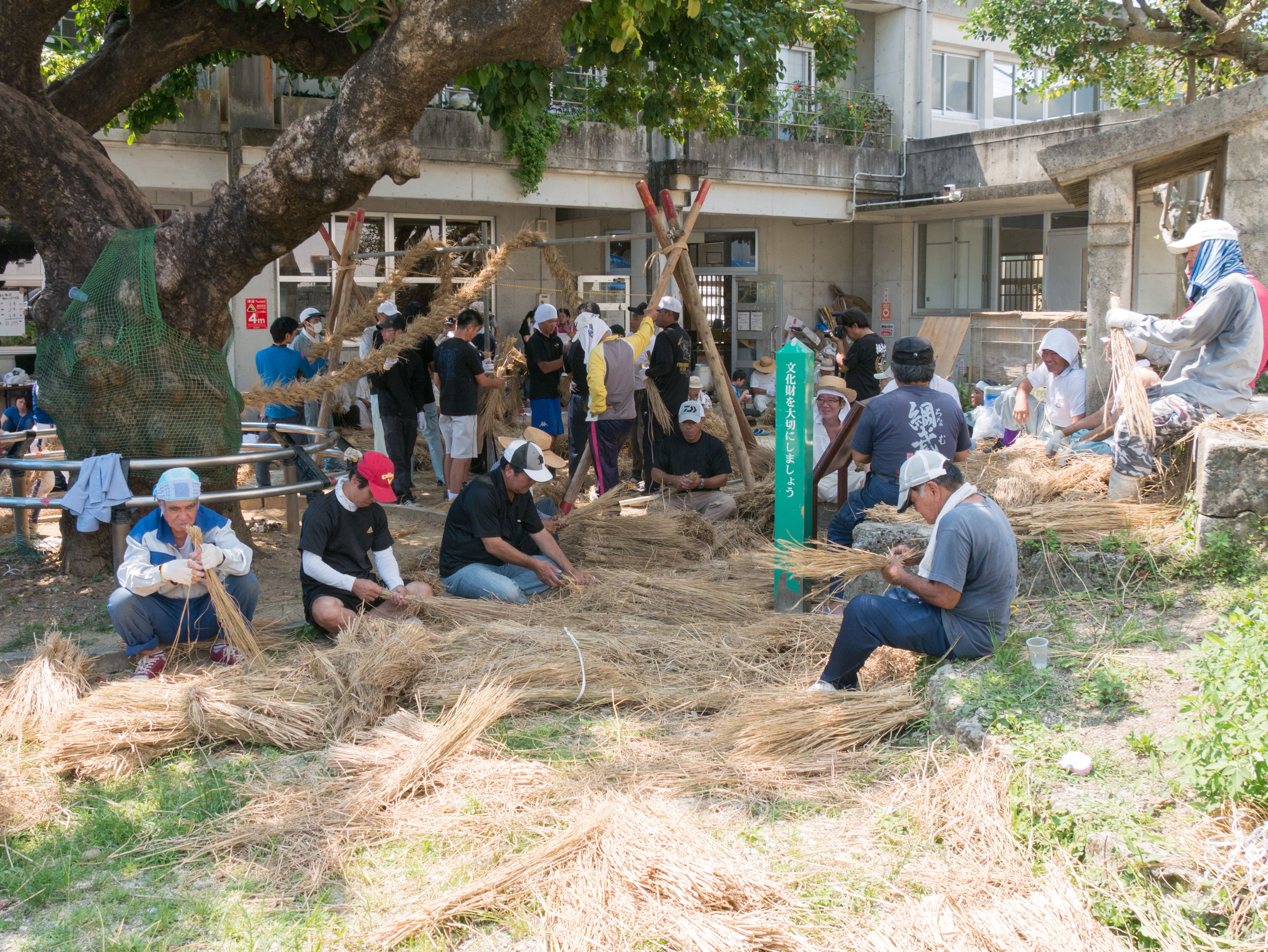 与那原大綱曳で使われる本綱は長さ約90メートル、重量5トンで雄綱(東)と雌綱(西)に分かれており、毎年新しく作られます。本綱の元になる綱は町内12区の分担で作られており、藁の束から細い綱を作り何本もより合わせ太い綱にしていきます。各区が作った綱は大綱曳の前日に本綱として編まれ完成します。各区の割り当て(100m×2本、90m×2本、80m×2本、70m×2本、枝綱35m×4本)