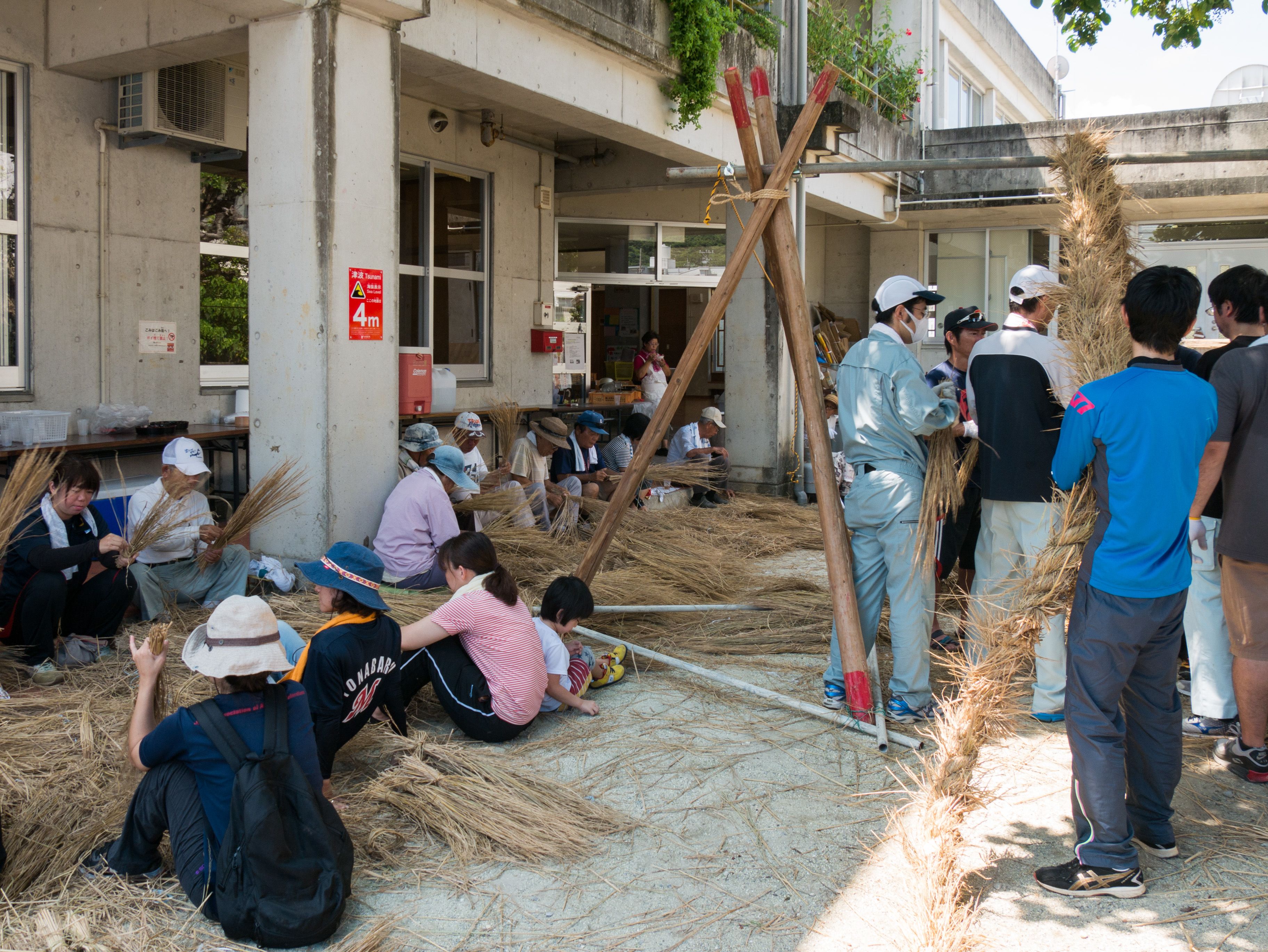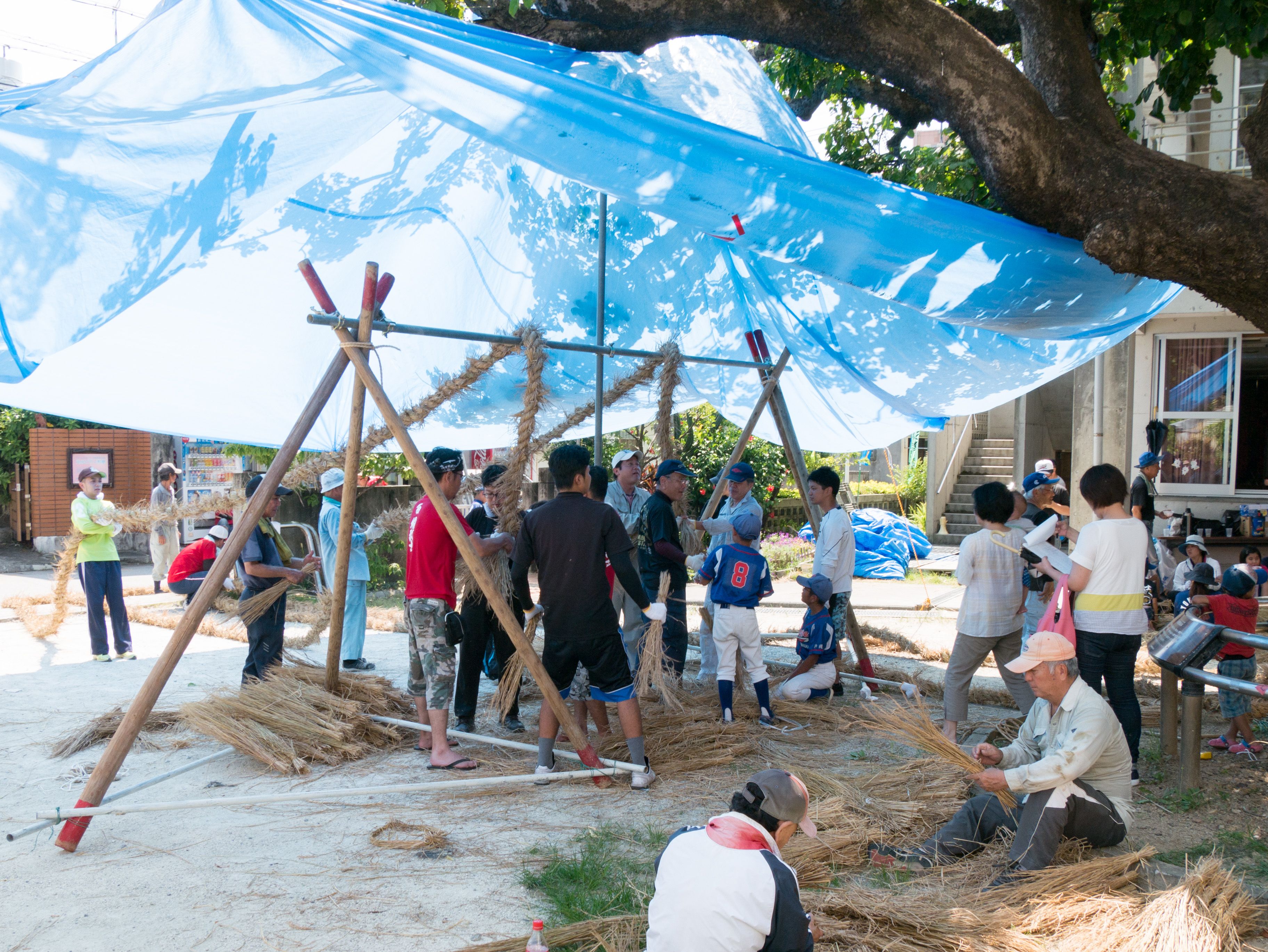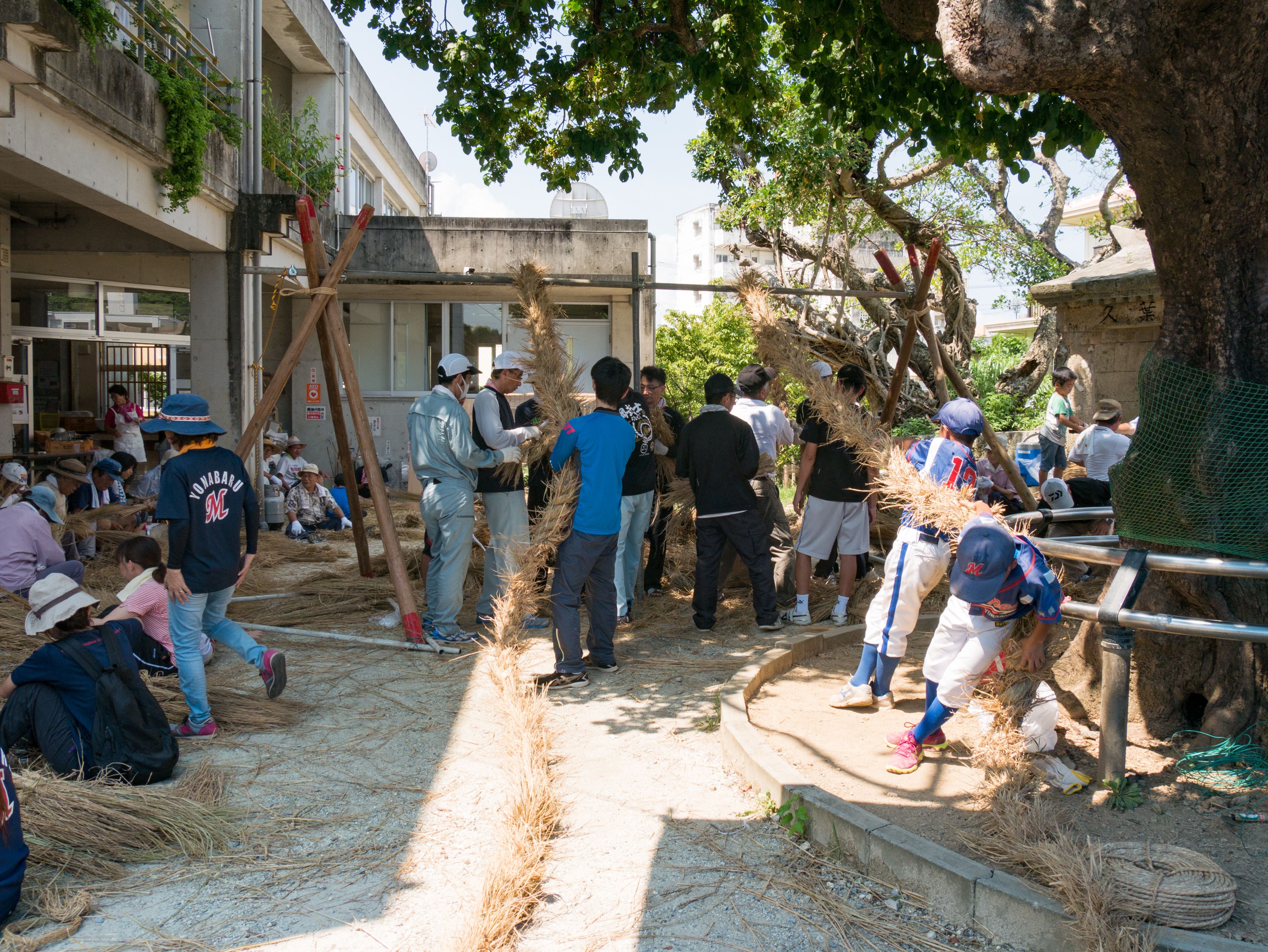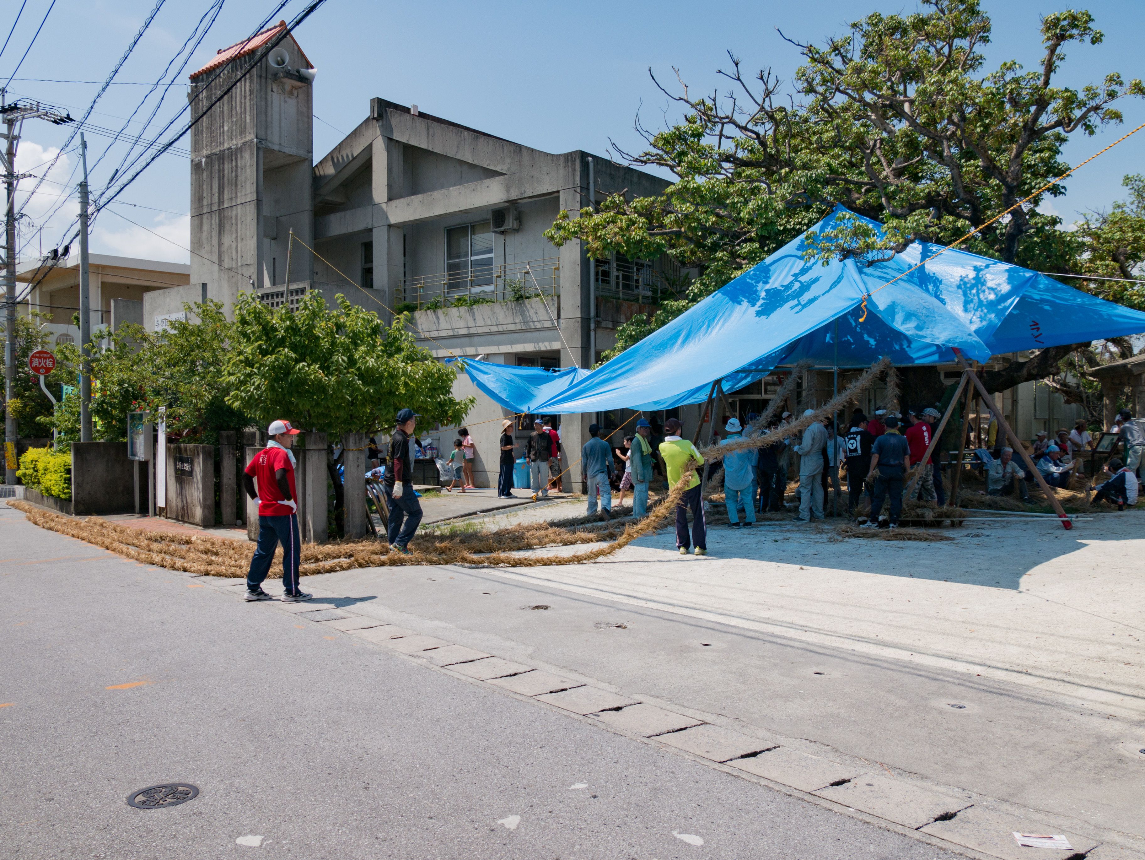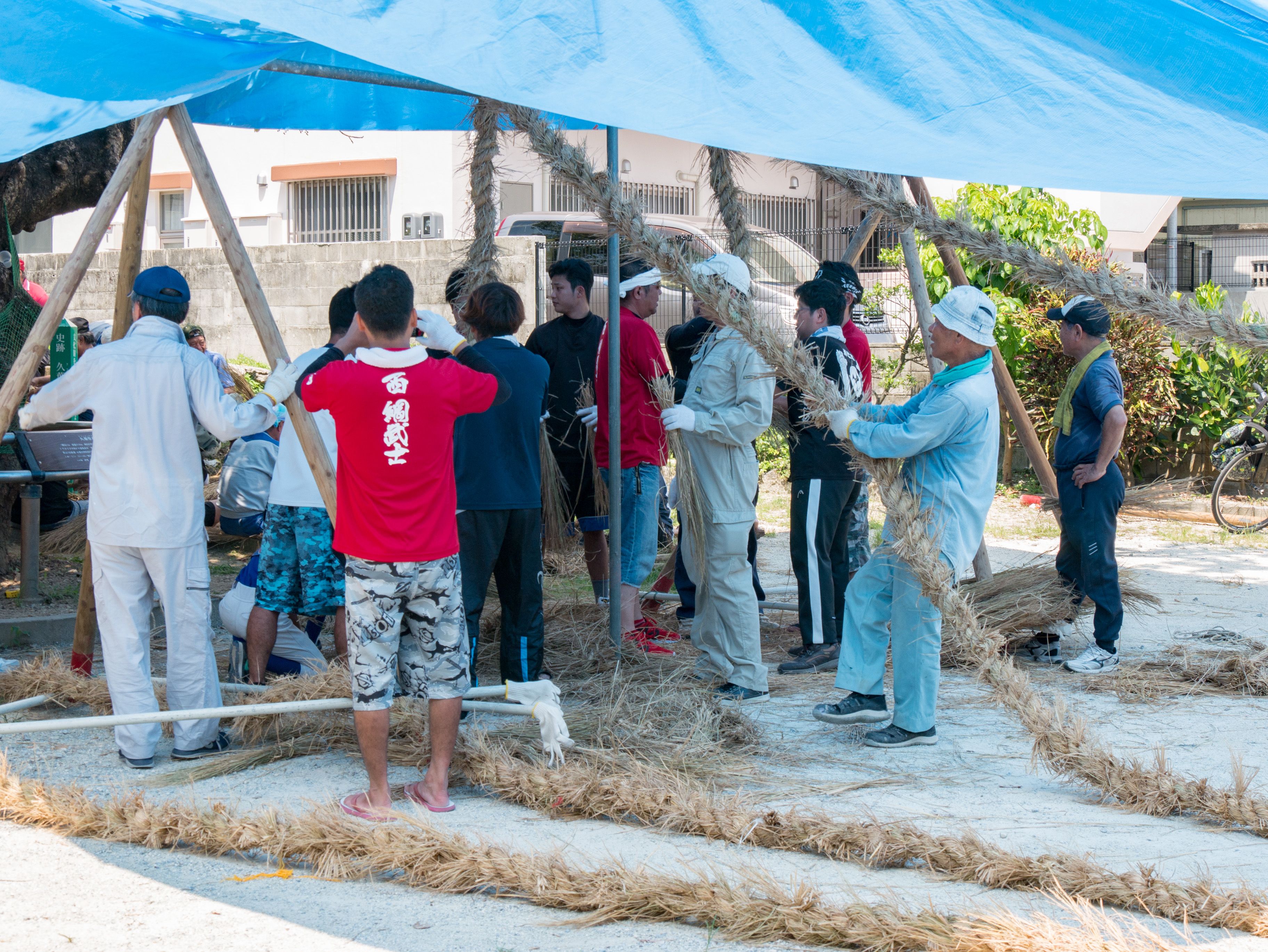 与那原大綱曳で使われる本綱は長さ約90メートル、重量5トンで雄綱(東)と雌綱(西)に分かれており、毎年新しく作られます。本綱の元になる綱は町内12区の分担で作られており、藁の束から細い綱を作り何本もより合わせ太い綱にしていきます。各区が作った綱は大綱曳の前日に本綱として編まれ完成します。各区の割り当て(100m×2本、90m×2本、80m×2本、70m×2本、枝綱35m×4本)