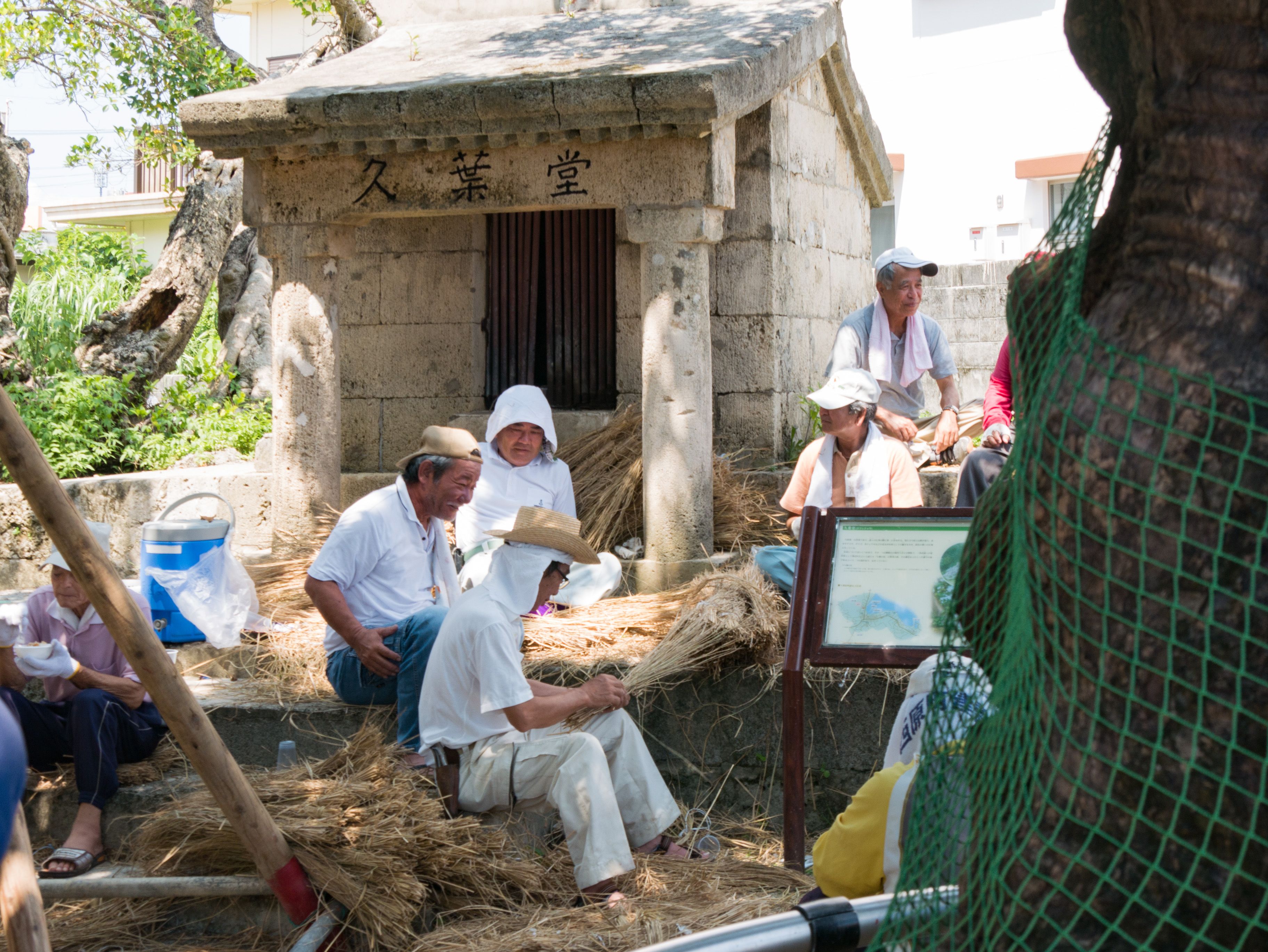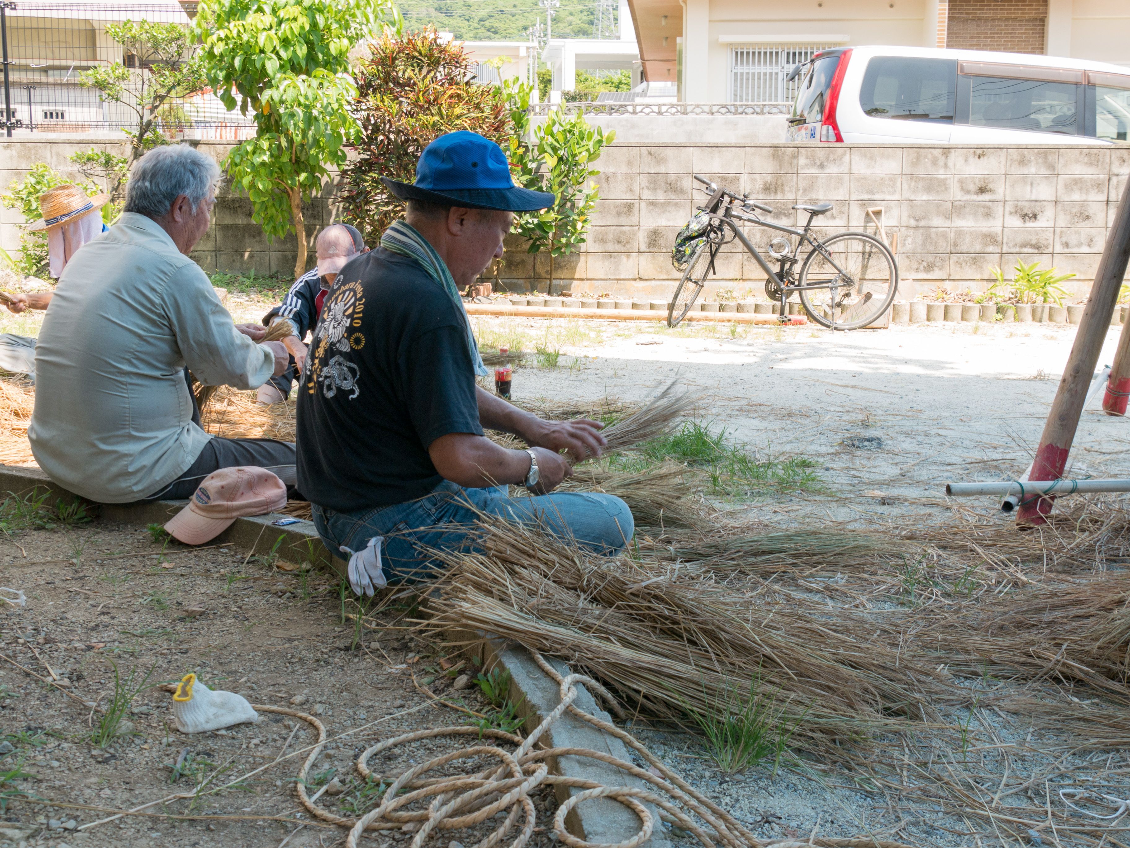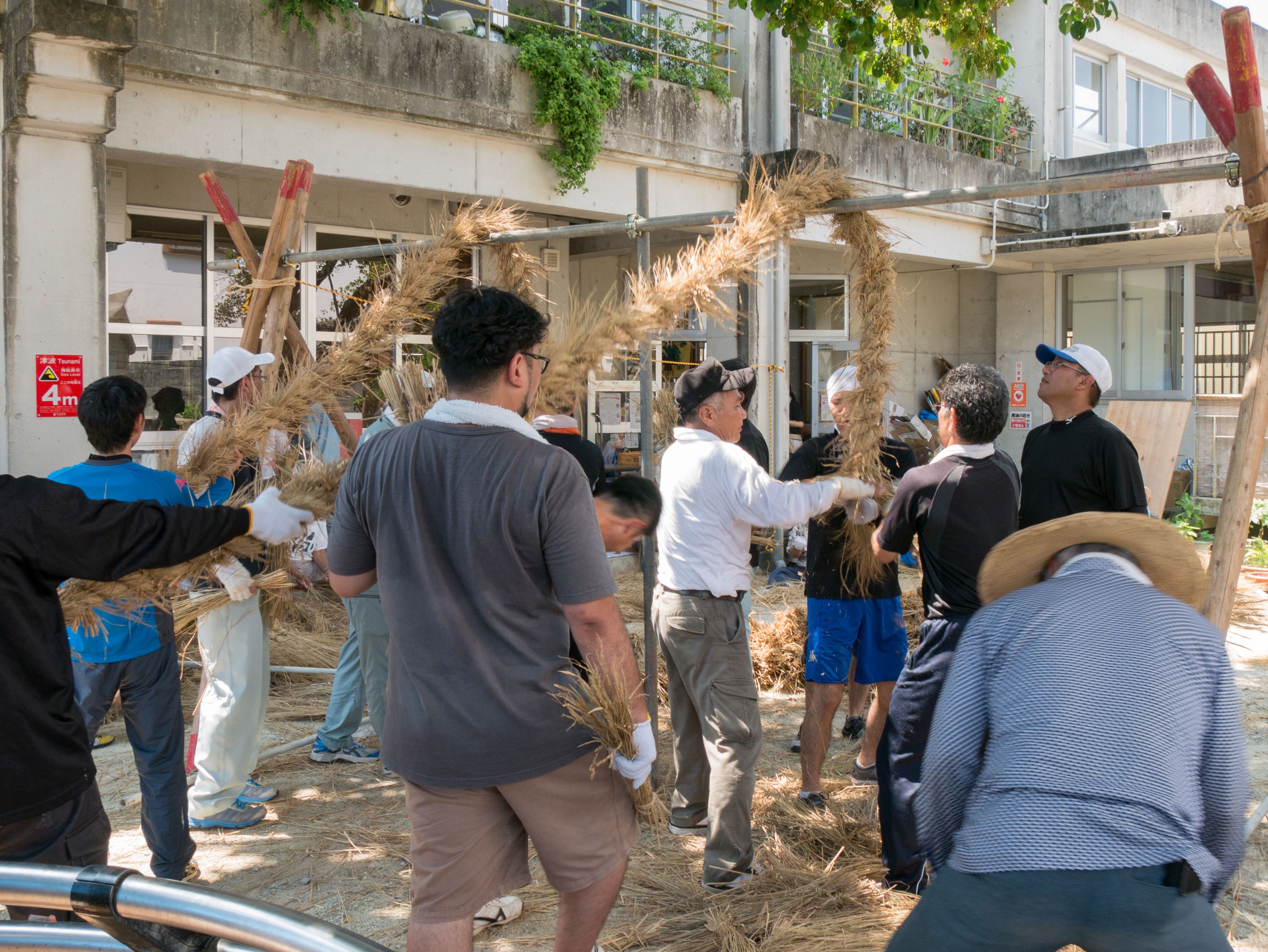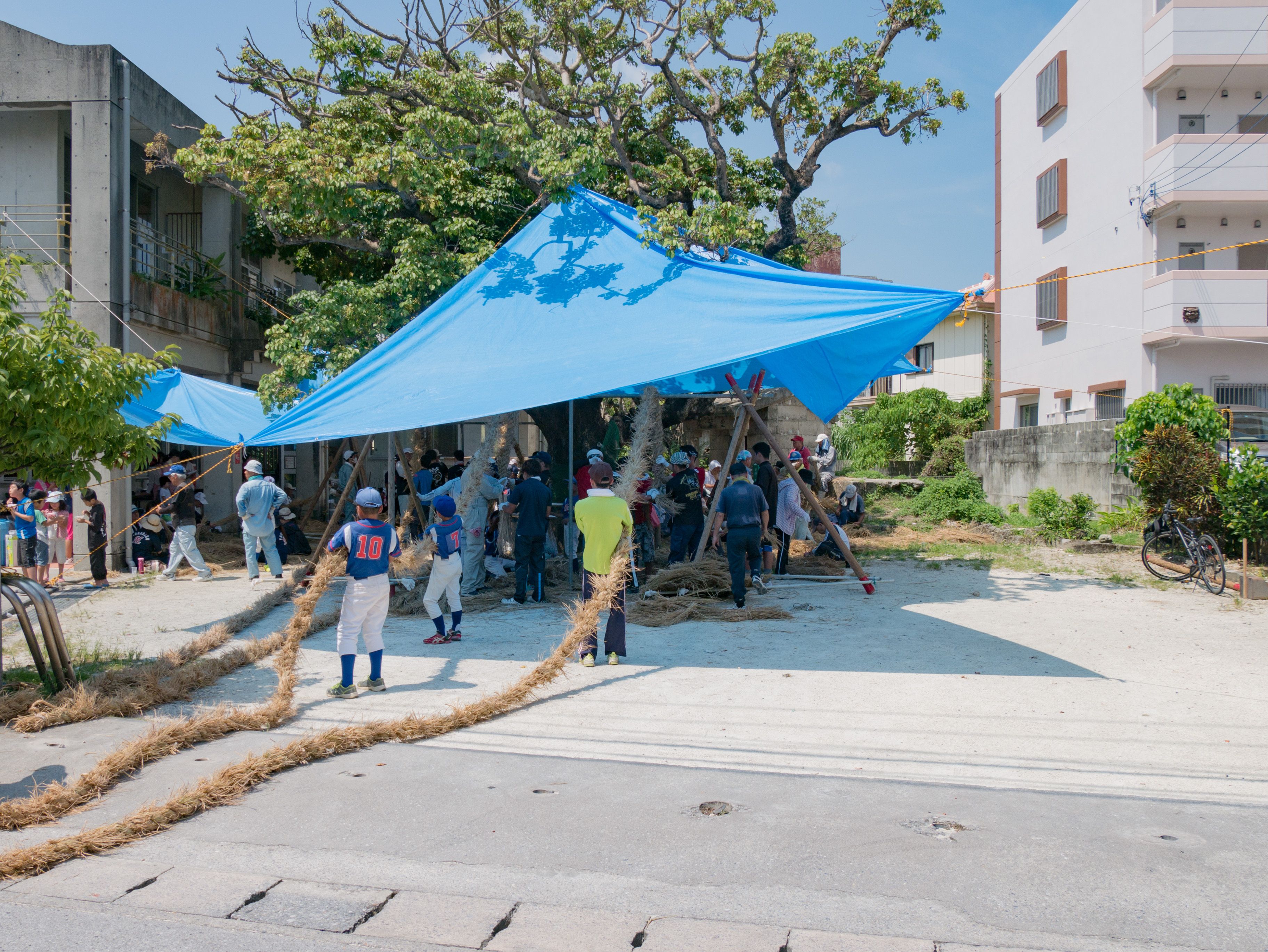 与那原大綱曳で使われる本綱は長さ約90メートル、重量5トンで雄綱(東)と雌綱(西)に分かれており、毎年新しく作られます。本綱の元になる綱は町内12区の分担で作られており、藁の束から細い綱を作り何本もより合わせ太い綱にしていきます。各区が作った綱は大綱曳の前日に本綱として編まれ完成します。各区の割り当て(100m×2本、90m×2本、80m×2本、70m×2本、枝綱35m×4本)