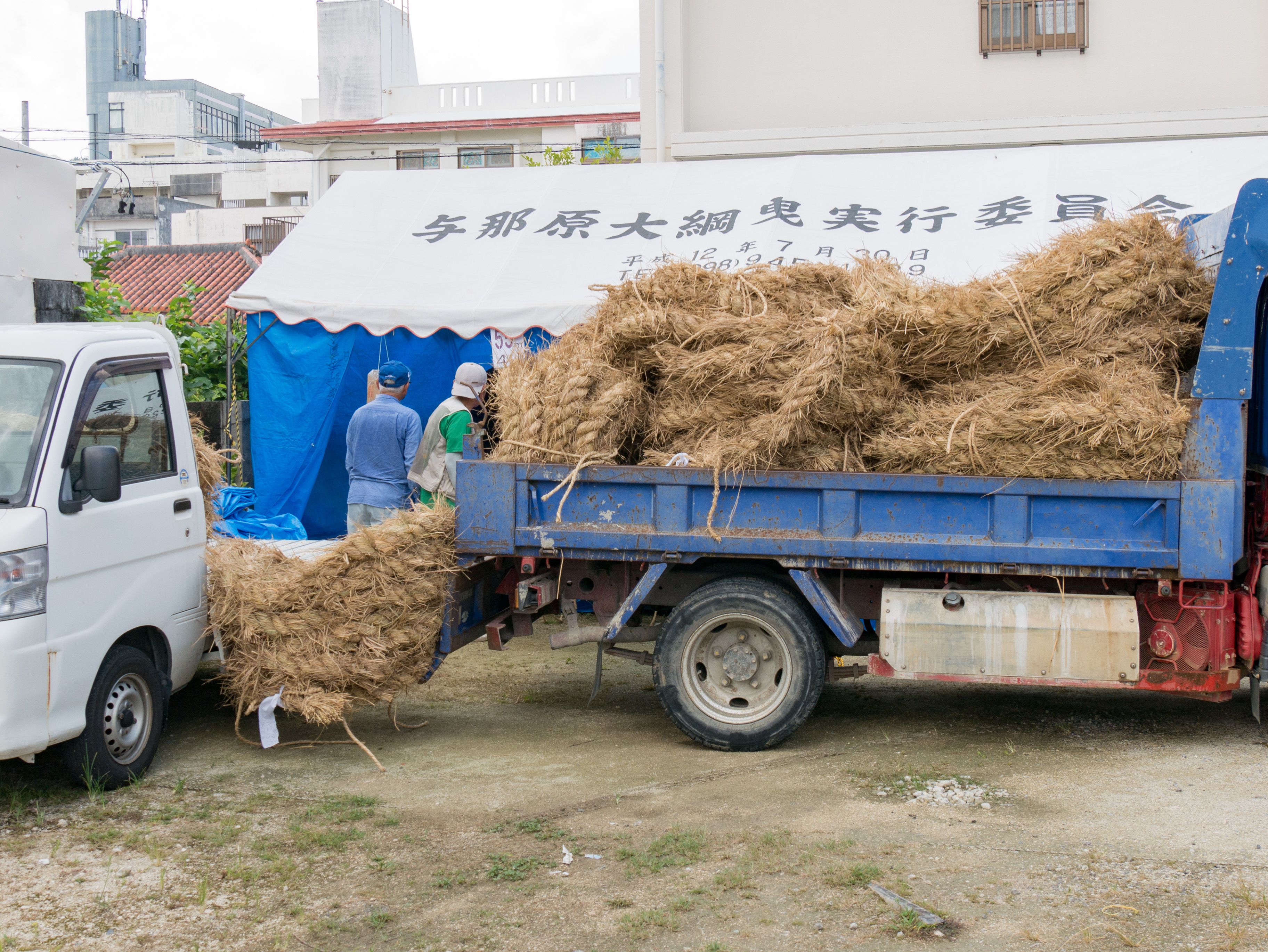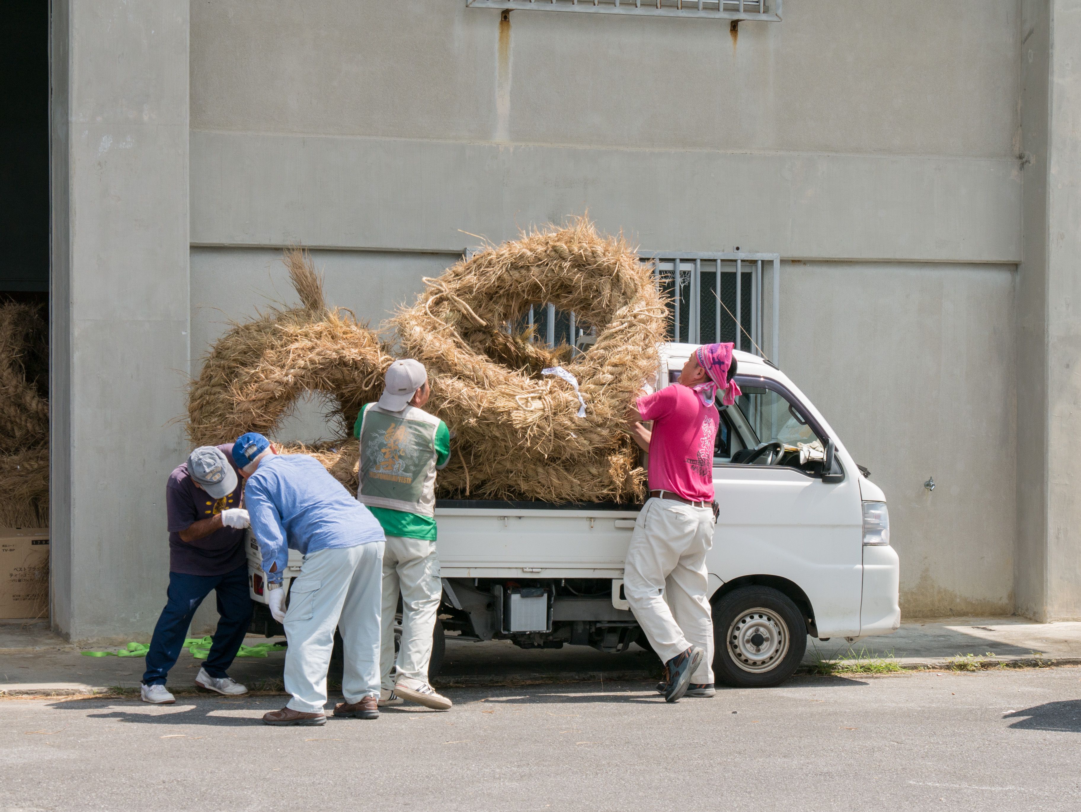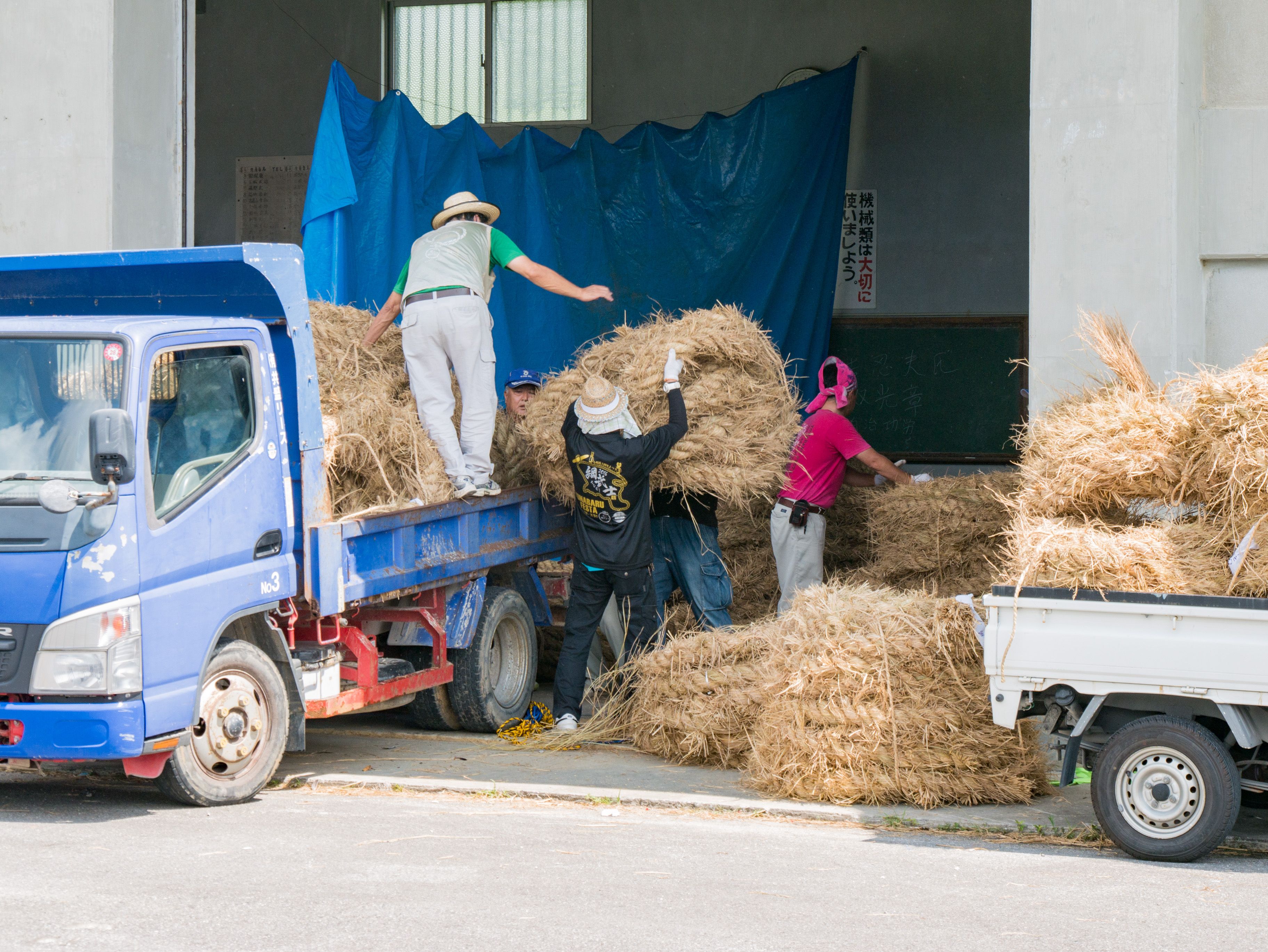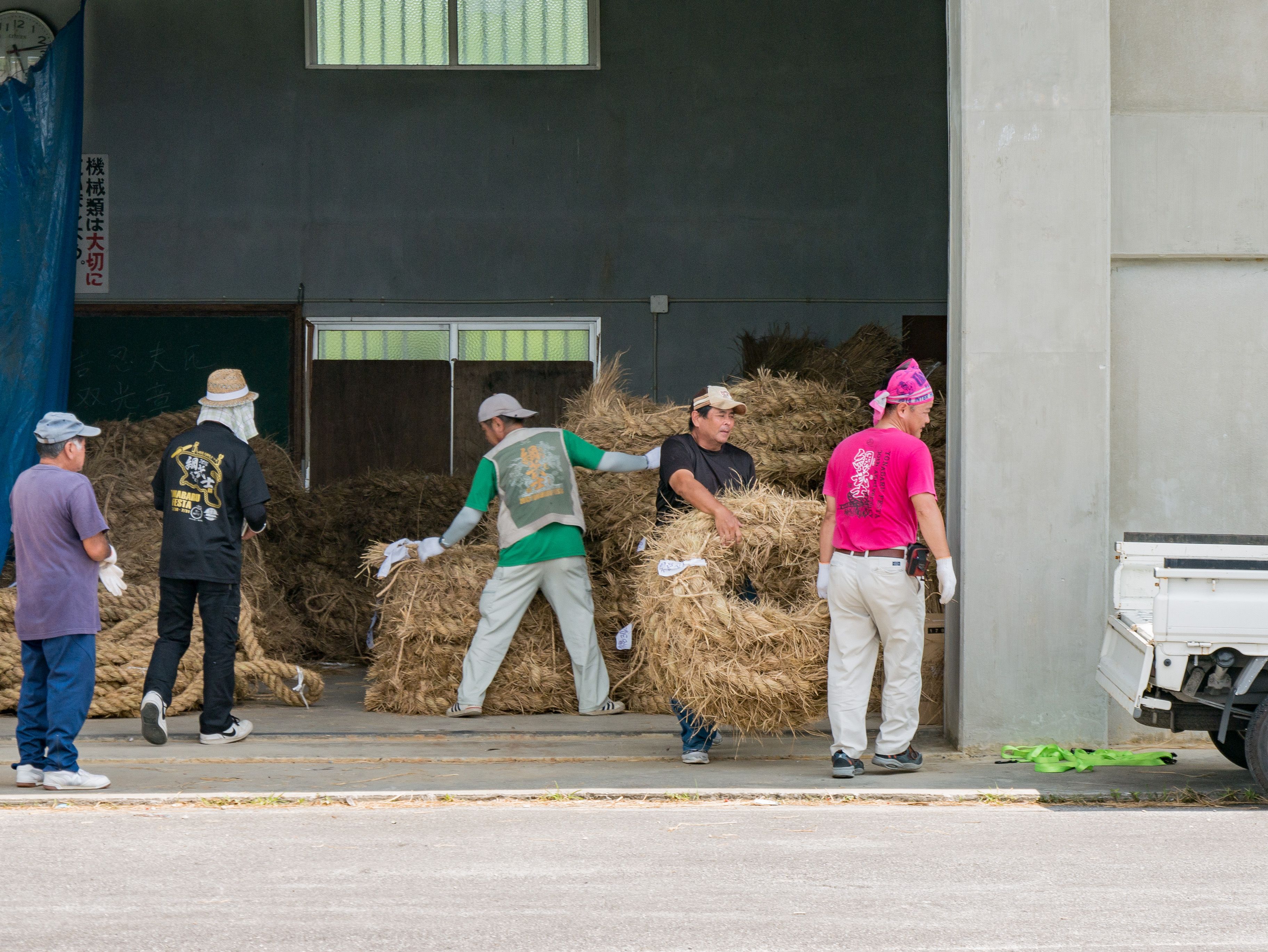 町内12区の分担で作られた綱は一か所の倉庫に集められ本綱製作の日まで保管されます。本綱製作は大綱曳の前日に町内の中央通りで行われます。本綱製作に合わせて倉庫から中央通りまで綱を運びます。