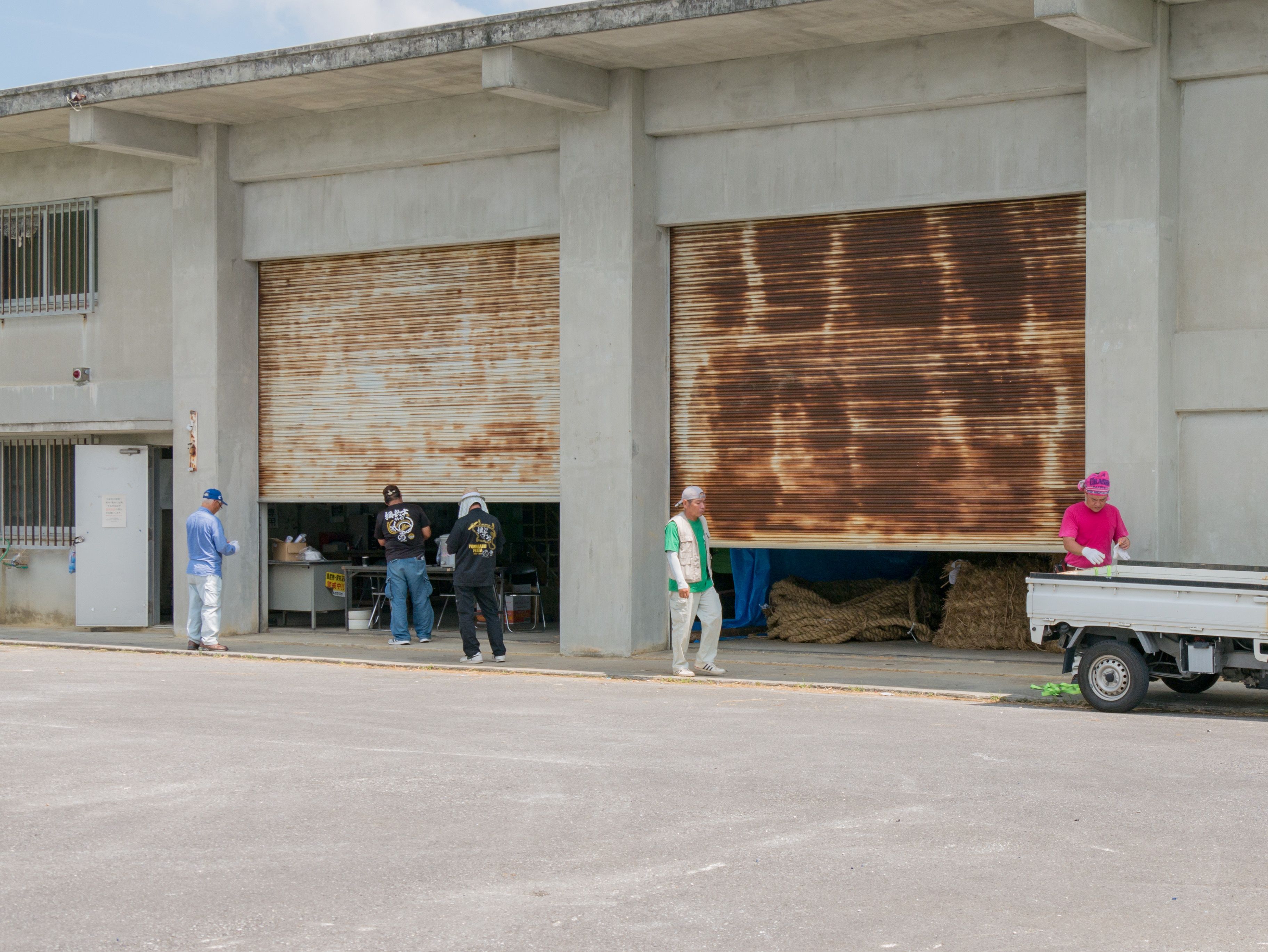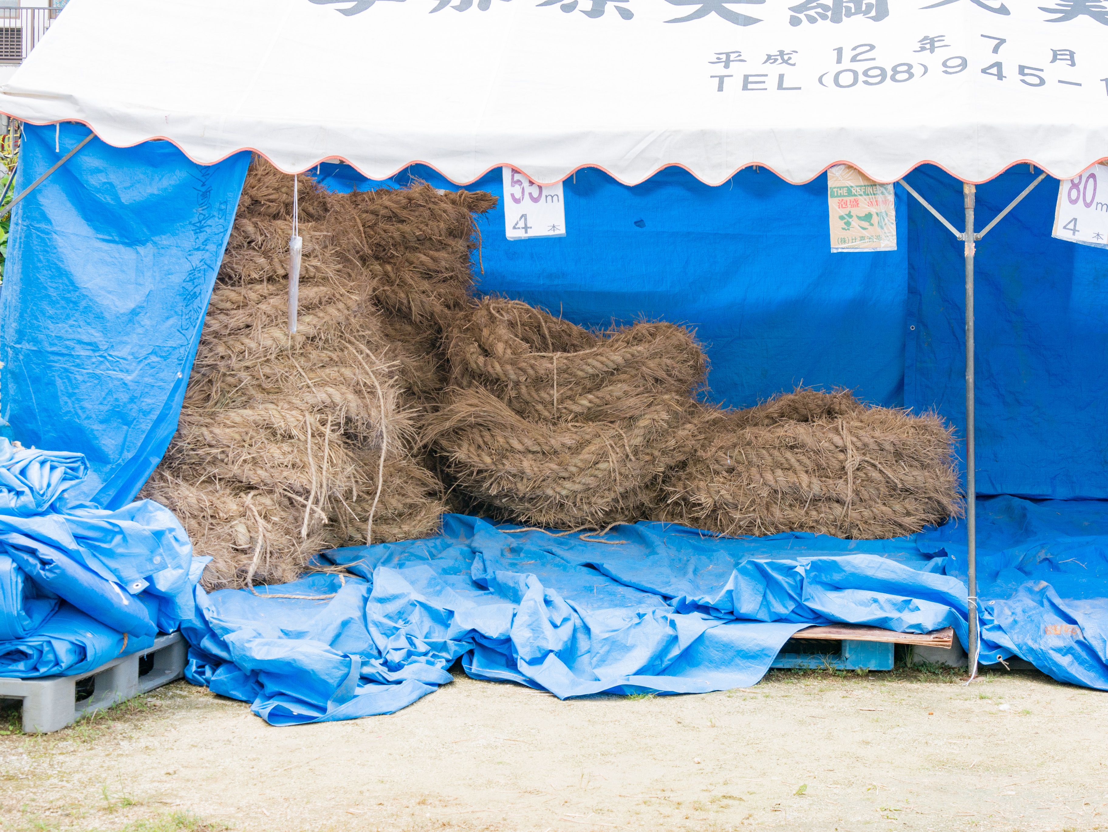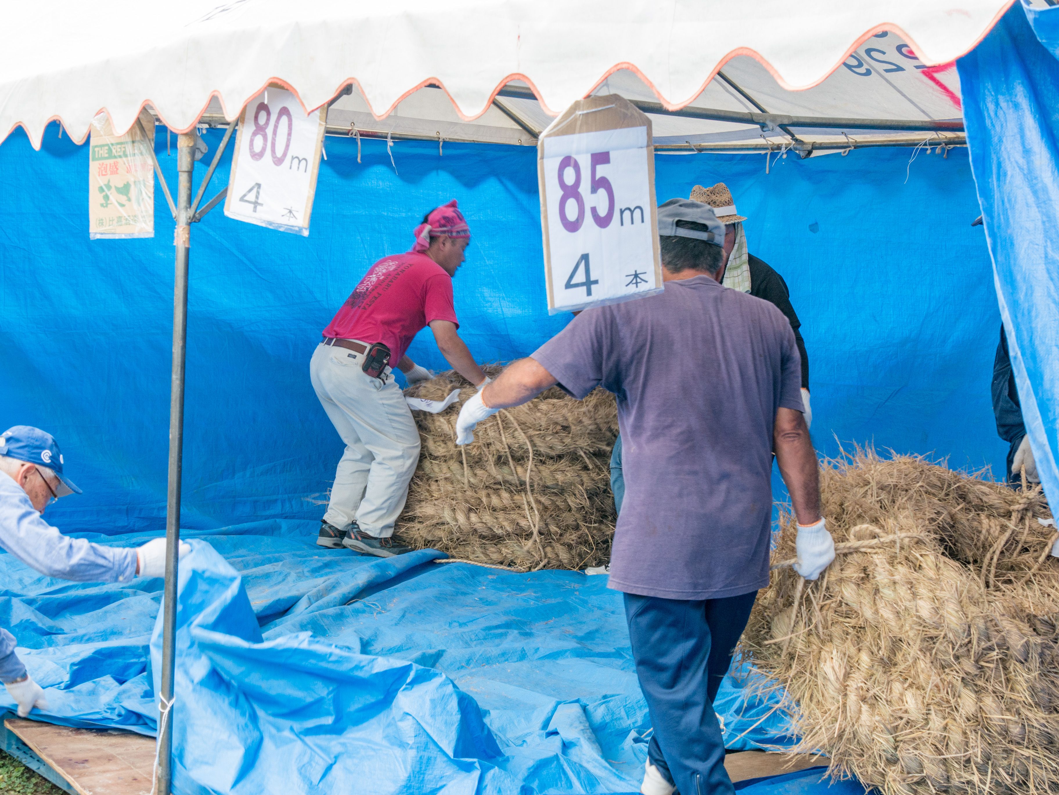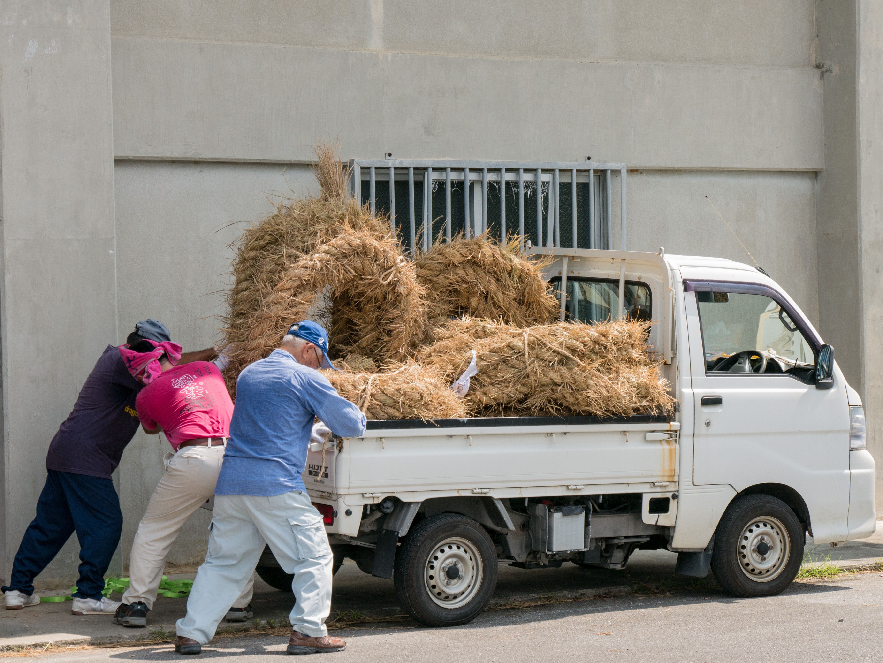 町内12区の分担で作られた綱は一か所の倉庫に集められ本綱製作の日まで保管されます。本綱製作は大綱曳の前日に町内の中央通りで行われます。本綱製作に合わせて倉庫から中央通りまで綱を運びます。
