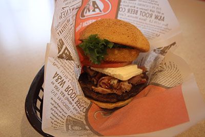 はじけるような爽快感とクリーミーな泡で大人気のA&Wオリジナルドリンク”ルートビア”と ビーフ、トマト、レタス、オニオンリングそして濃厚なクリームチーズにペッパーポークがはさまった ”The A&Wバーガー” がおススメです。