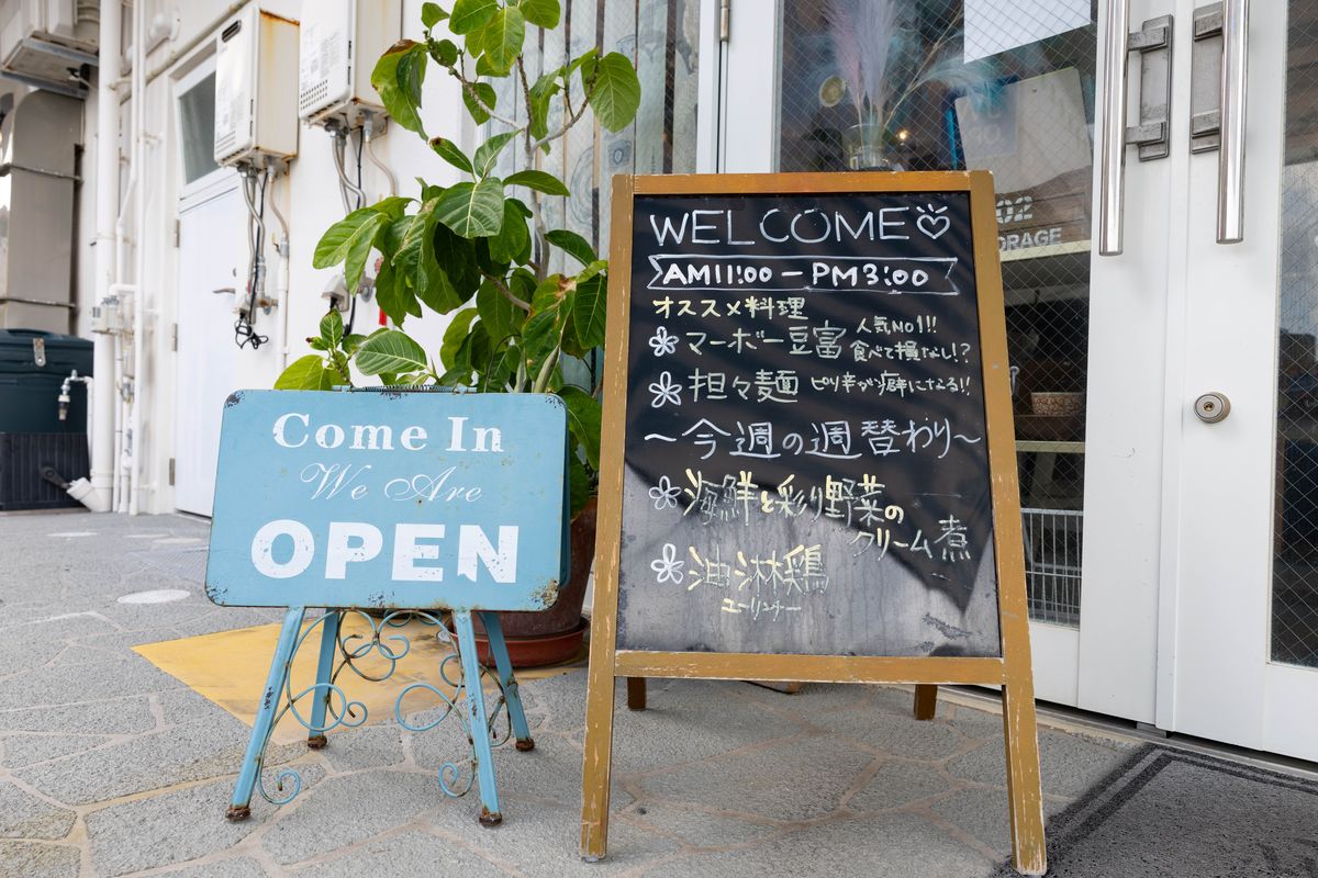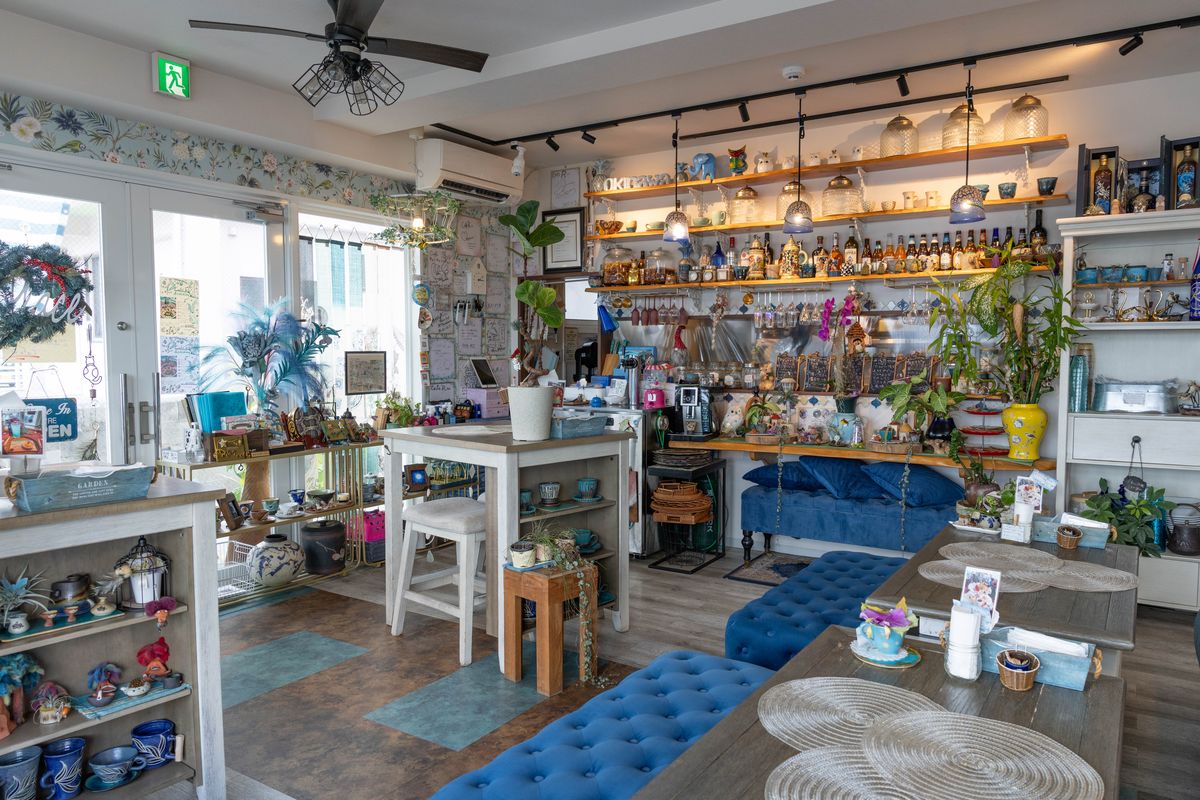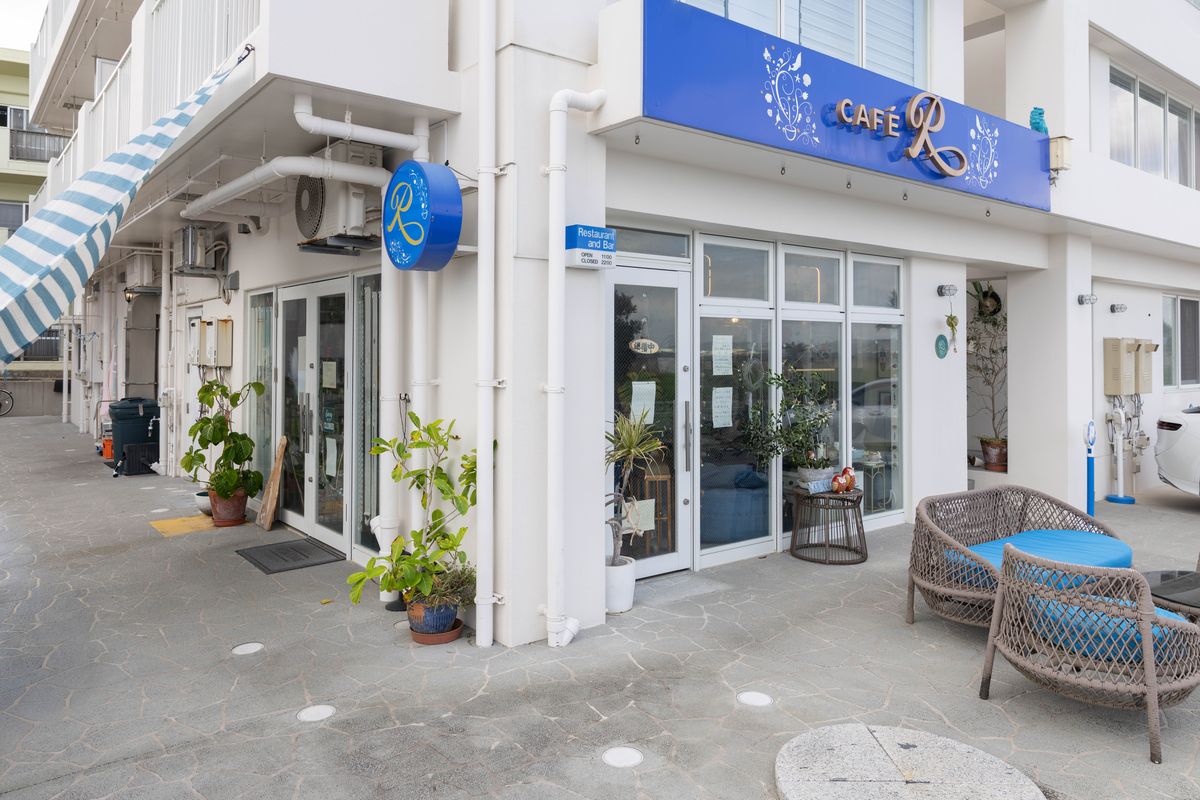 沖縄の海をイメージさせるブルーの小物をさりげなく配置したおしゃれなカフェ。こちらで提供されるのは、内観とのギャップに驚く人も多い“本格中華料理”です。店名のRはRelaxやRefreshに由来。