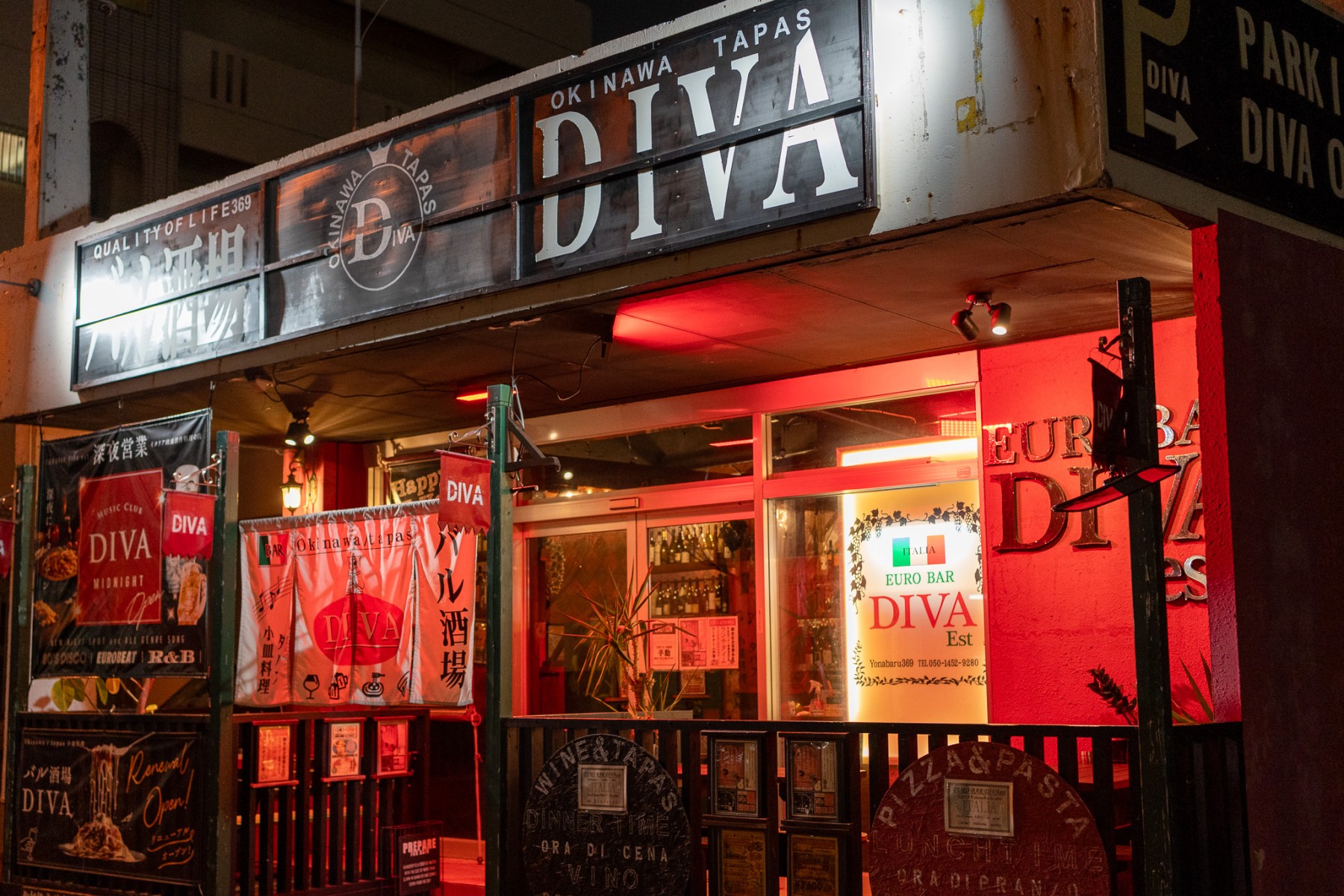 2022年にオリオン通りから国道331号沿いに移転オープンした「EURO BAR DIVA est(ユーロ・バール・ディーヴァ・エスト)」は、与那原町内では珍しい欧風創作料理の店。イタリア料理をベースにした創作料理とワインが人気で、3,900円でイタリアン前菜やサラダ、パスタ、ピザ、メイン料理などがついたお得な女子会プランが用意され「リーズナブルでカジュアルに過ごせる」と女性客に好評です。