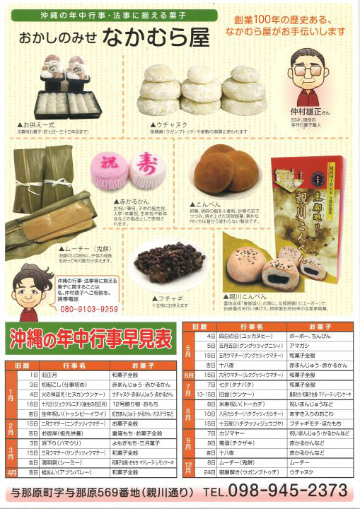 お餅や饅頭、かるかん、ムーチー、レモンケーキなど、旧暦行事や法事、祭事用など沖縄の年中行事に欠かせない昔ながらのお菓子を作り続け、創業はなんと100年以上を誇ります。