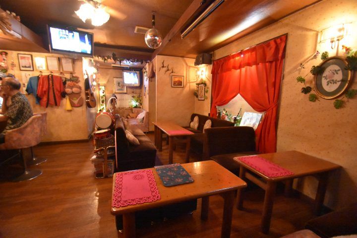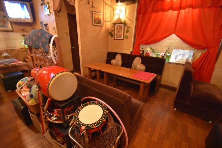 インパクトのある店名の「パパ・リッチ」。お店の中は可愛い「赤」が印象的。手料理も、てんぷら、魚のあえ物など多彩。リズム楽器を多く取り揃え、カラオケは一層楽しめるかも。