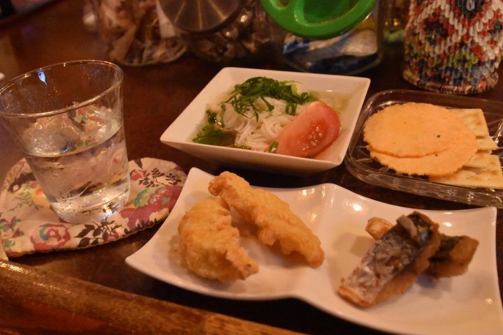 手料理も、てんぷら、魚のあえ物など多彩。リズム楽器を多く取り揃え、カラオケは一層楽しめるかも。